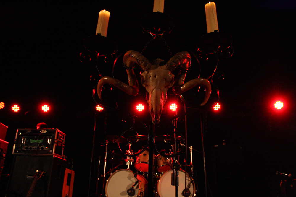 A goat skull candle display is put up on the stage but strangely there are no thick plumes of dry ice and incense to greet Dragged Into Sunlight tonight. We have been witness to this elusive anti-social force before and know partly what to expect; a band hidden from sight playing with their backs to us and unleashing a hellish extreme and mangled sound which is every bit as misanthropic as their stance dictates. Now it is getting crammed down the front which is a relief as it shows not everyone did the obvious thing and rushed to Wembley to see Motorhead churn out the same old songs for the zillionth time. Its dark to the point of pitch black which explains why the dry ice is not necessary, a throbbing sound comes out the speakers encroaching upon us and almost burning into white noise. There’s a deluge of fuzzy guitar sound and already tense nerves are shattered by trembling riffs wrought out in a deathly barrage sounding like they have been flung out the very gates of hell. It’s fast, abrasive and completely scathing, almost too much to take in which is no doubt what is intended. This is ugly music for ugly people and as guitars literally shred it feels like it is doing its best to disfigure us all the more. Moving around is not easy as the darkness makes it feel as though you are going to trip over, it’s quite a clever and disorientating trick and one that’s perhaps if I am not reading too much into it done on purpose just to make the overall impact that bit more intense. It’s a case of tripping the dark fantastic, stumbling to riffs and falling over to the feedback, thankfully the light from the bar calls like as a beacon and it’s one not to be ignored. Whilst there I ponder, just how good are DIS when you just focus on the music, just an uncouth noise or an unconventional tour de force? Maybe they are something really kind of average getting mystique and reputation for going beyond the convention live and doing something a bit different? Like a special effects film without anything in way of plot but just clever tricks or maybe an unruly Dogma? The jury is out and the mood is lightened momentarily by a song with looser guitars and more of a melody to it before drums literally trip over themselves, caustic roars build up and everything sounds like a glorious uncoordinated miasma of obtuse sound. They certainly leave their mark!