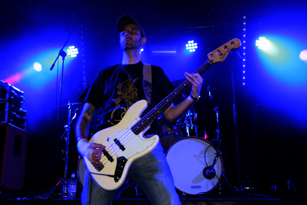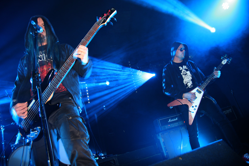 This was my first time to witness to the horrible Hooded Menace’s from Finland having missed their Live Evil show on these shores in 2010. It seems like expectations are high and now there is a nice healthy contingent both close to the front and spread around to catch the band. As they open up their gates the sound can only be described as thick as the coating of crusty sick left on the floor after a night of all out debauchery. Someone else described it with a very pained expression that it was so low and deep it was close to making him soil his pants. Perfect then in my books, we like our Finns to be filthy and that is exactly what opening track ‘Fulfil The Curse’ was proving to be. The band looked the part, naturally hooded and suitably menacing V shaped axes and shades nonchalantly worn and posed about with. Growler Markkus seems particularly formidable at the front looking like he wanted to wrap his arms and lungs around something and crush it. His gurgling vocals really are craggy, the bass is loud and we are pretty much being shook to the core here, well aware that in the morning will be deafness. The blue lighting and sound combined made me feel as though I had been transported to subterranean depths, deep beneath the ocean. ‘Never Cross The Dead’ takes off in a rancid and bile spewing tumult, the word that best sums up the feel here is ‘morbid’ the riffs and pace have the crowd pumped up and the long oozing songs has everyone banging away and fist pumping the air.