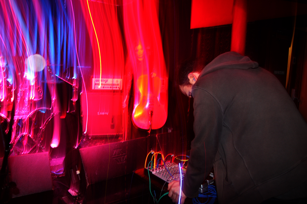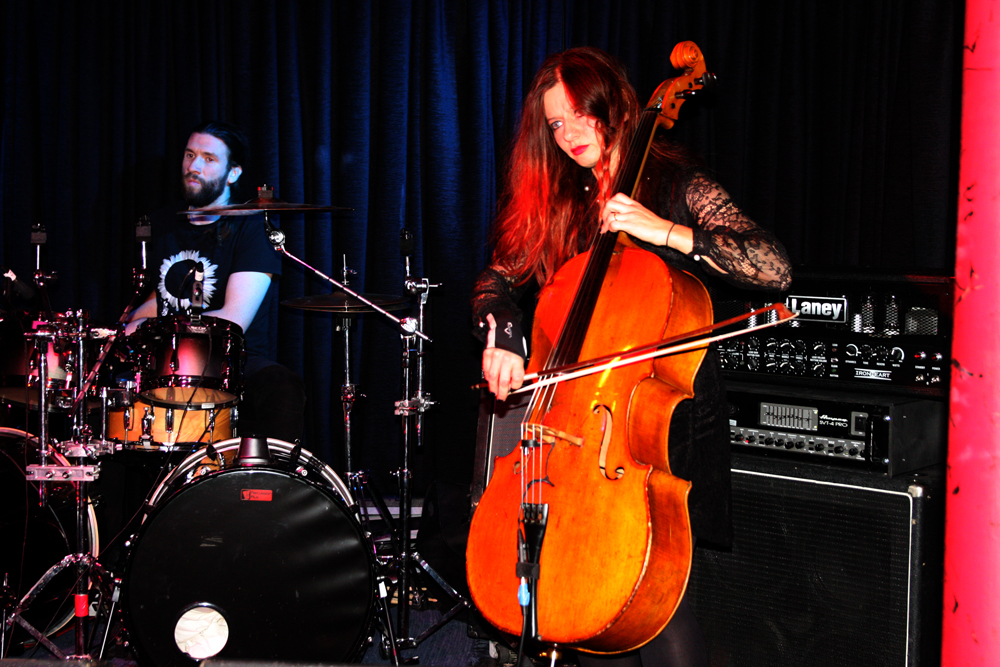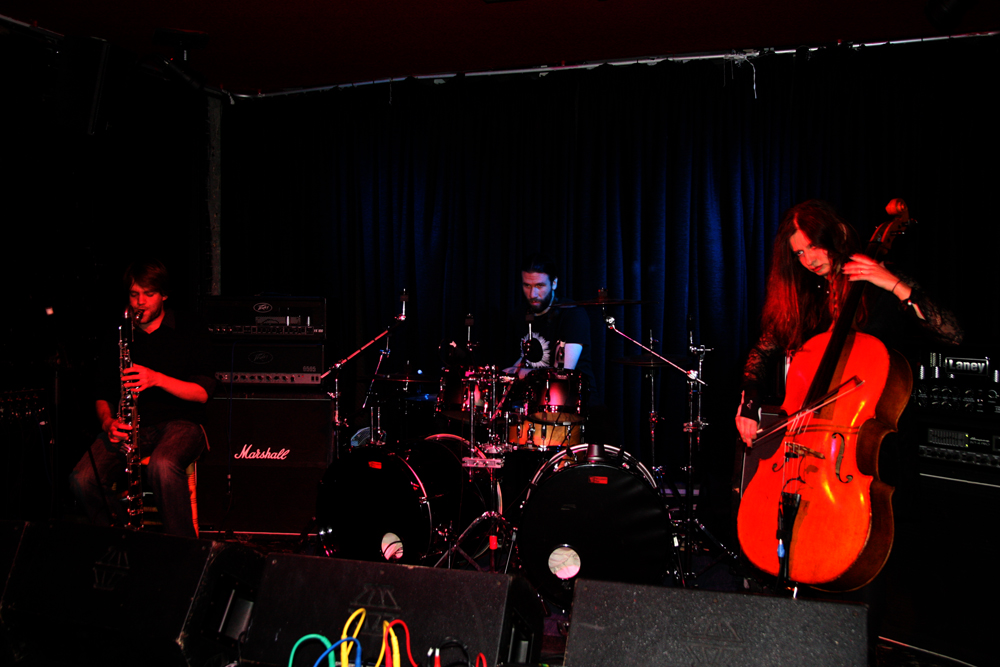 I reviewed Krawwl, live and on album recently so thought it could be a case of not having anything to say but hold on, things seem a bit different here. Indeed there is a console of fiddly looking knobs and stuff at front of stage and the two main members K and S seem to have been joined by a saxophonist and cello player here. Feedback and noise like a swarm of bees fills up the venue as do curious punters and as sonic levels peak everything trembles. Change rattles in pockets, glasses, vibrate and false teeth fall out somewhere down Camden High Street. Instruments gradually join in and the sax is particularly noticeable as we enter avant-garde territories and the mass builds up. As guitar riffs finally enter the fray hell is unleashed in an uncomfortable fashion for this bad trip horror show which attacks the senses from every angle. It’s easy to mention the likes of John Zorn, Merzbow and other noisy innovators as this jazzy pulsating track heaves and shakes and the good thing was it feels like a living breathing entity, very much alive and making fractals pretty much explode within my head. The cello player jaggedly saws as it becomes more strident, drums beat time and the sax is spiralling on a never ending loop. After what seems forever the promoter gives a signal which looks like he is saying wind it in and they begin to do so over the next ten minutes or so. It’s an engrossing one track noise display musically feeling like a vicious murder in a Bukowski novel. I think Krawwl would have played it all night if they could but as silence finally descends allowing us to stagger out the feeling is very much, “what the fuck just happened there?”