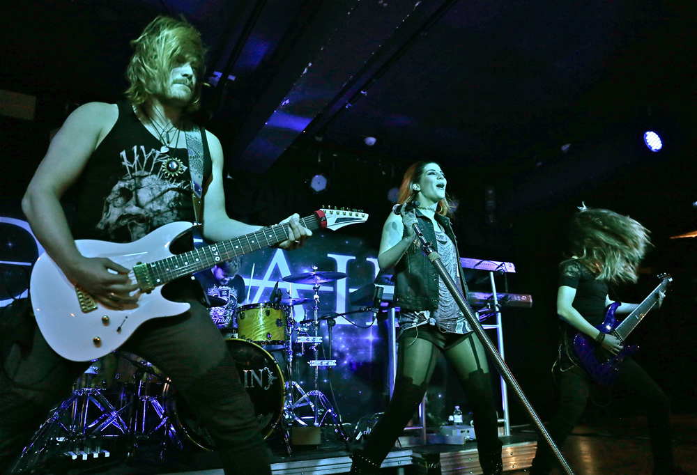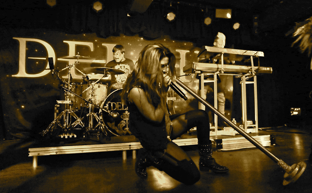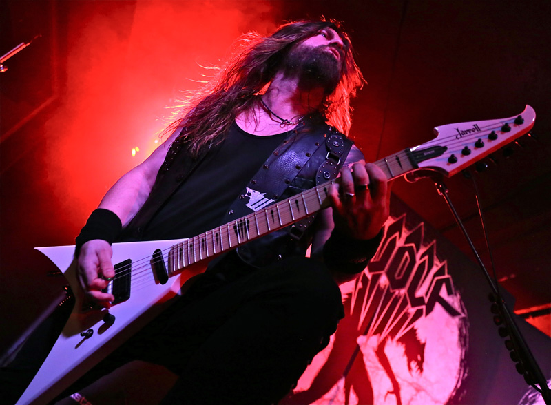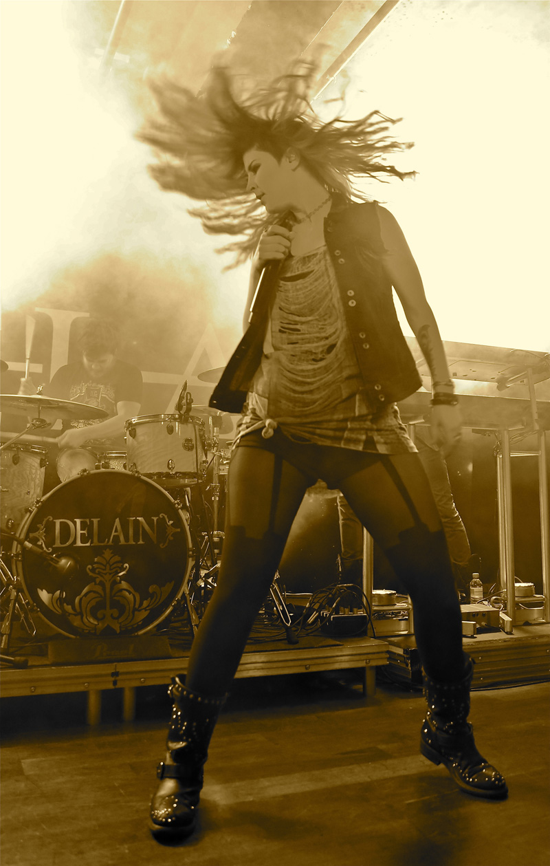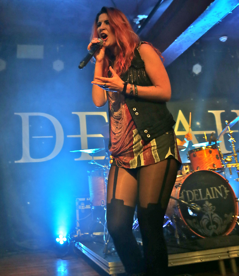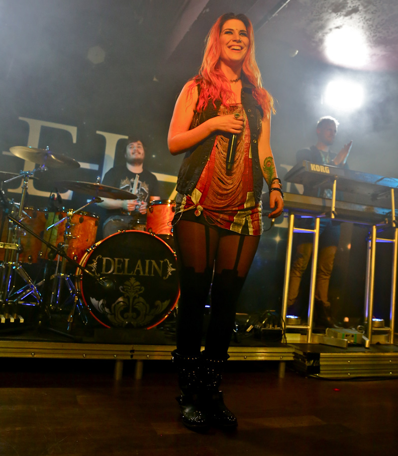 Sweden’s Wolf worship British styled heavy metal, their adoration for the genre is patently obvious on their albums and after the intro piece the set was belted into life with “Shark Attack”. The twin axe acrobatics of Niklas and Simon were tight and executed impeccably as it appeared some in the crowd found them a little too heavy for their liking and promptly buggered off which I thought was strange. Added to that the reception the band received was lukewarm, tepid to the point of apathy which I also found strange considering they were playing what most of the crowd were brought up on in their youth, namely Maiden, Saxon, Priest etc. They were particularly heavy and the vocals were as clean as any you’d hear in modern metal and added to a decent enough stage presence I couldn’t quite figure out why they weren’t better received, possibly due to there being no female fronting them if I’m cynical, and it also appeared that there were a fair few gig virgins that looked bemused whilst Wolf were playing. However as their set warmed into “The Bite”, the reception improved and a few fists were pumped into the air much to the bands appreciation. The two large Wolf banners obscuring the Delain drum kit meant space was tight on the small stage and both supports had their drum kit stage left and unless you were stood to that side or more central then you couldn’t see the drummer at all which I felt was a bit rude, but with space at a premium here I guess that was inevitable. Prowling the stage with confidence “Skeleton Woman” was slung out as more people got into their trad British metal honouring once the audience sing back tune “Voodoo” was aired. By this point I had noted that the band really would benefit from a front man or woman, to bolster the stage presence and inject passion into their show as I also felt the show was just too plodding at times until “Skull Crusher” started up and the Priest like frenetic guitar work was unleashed and led nicely into “Evil Star”, another speedy number before closing with “Speed On”. I’ve seen Wolf seven times now and each time they put on a truly professional and confident show that should have gone down better with the crowd.