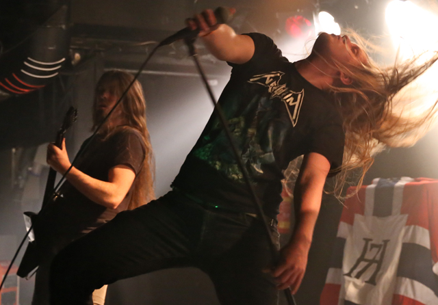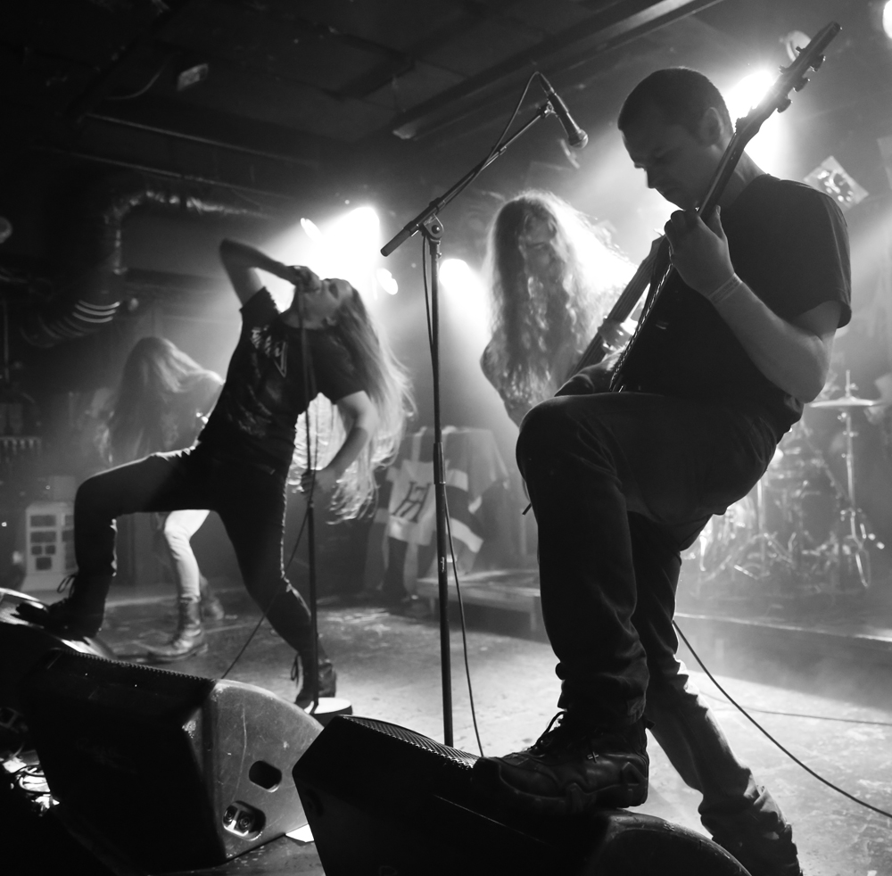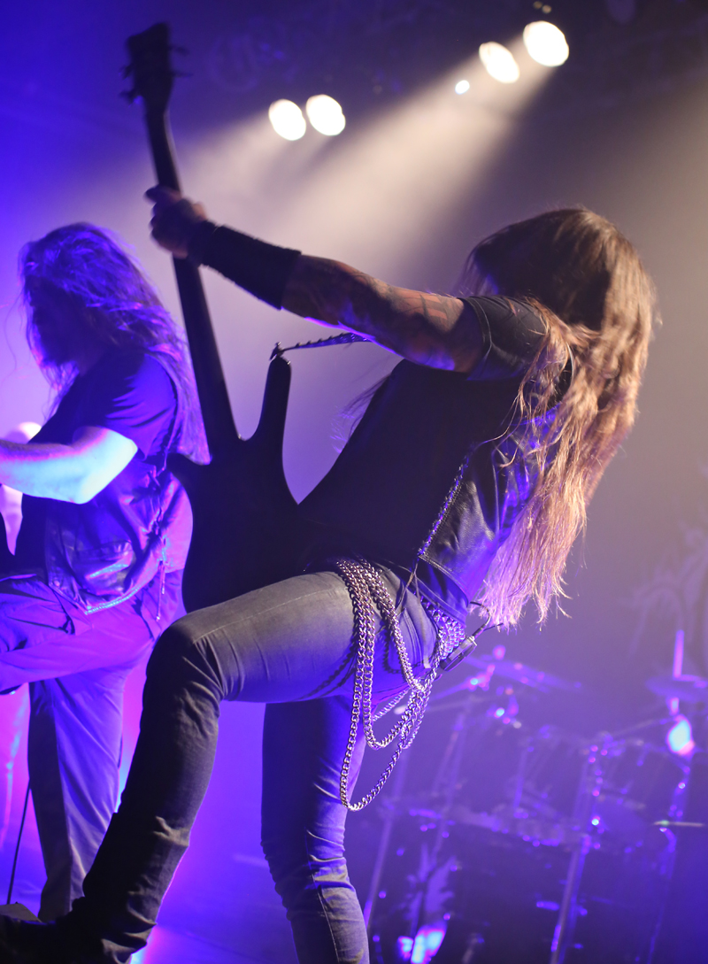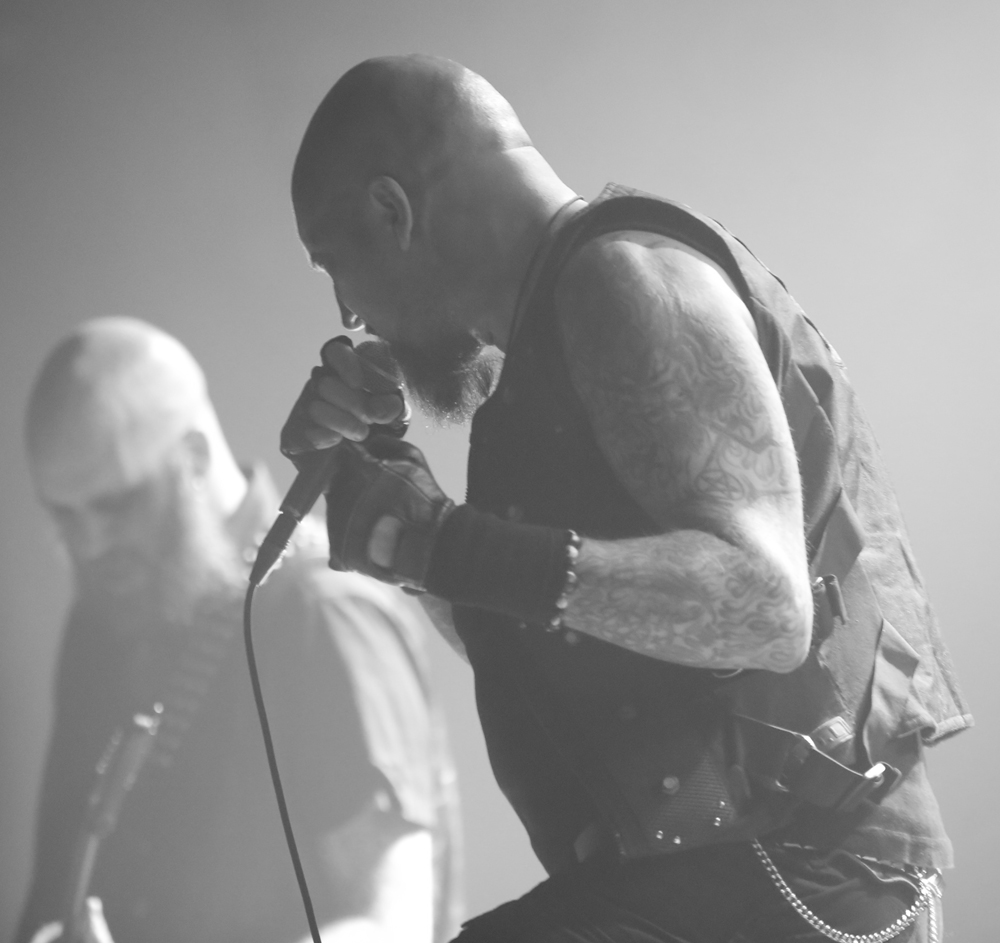 In total contrast was Brazilian barbarians Patria whose black metal malevolence was unleashed like napalm on the crowd. Their assault on the masses was nothing short of aural Armageddon, where devilish vocal vomiting was balanced with an anarchic war metal approach on songs like “Black Storm Prophecy” and “Far Beyond The Scorn”. With each band member suitably corpse painted they were an ungodly sight as thundering bass lines segued with a primal barrage of incandescent malignancy. The momentum of the band never waned; each tune was a rocketing crescendo of malfeasance that was underpinned by some extraordinarily inhuman drumming speeds throughout the set, which ended far too quickly, as I quickly bought a shirt and a vinyl from the bands merchandise stall at Indie Recordings at a decent price compared to what I expected and matched most gigs I’ve attended in recent years at about £15 for the shirt and vinyl apiece.