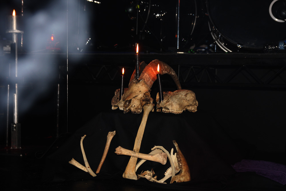 Incense and skulls deck the stage and mixed with a very quick boost of energy drink and chocolate on top of all the cider things are not mixing together well and I wonder if vomiting on the stage before Grave Miasma come on is a wise move. Luckily it’s all held down even though it may have gone unnoticed with all the dry ice this British group constantly drench themselves in. They are no real strangers to us and their bestial and cavernous occult death worship normally gets very well received. The barbaric primitivism is quick to be delivered with the likes of Gnosis Of The Summon creating a right old unholy racket. Chundering away with barbaric intensity it’s all a case of thudding things like Neanderthals just discovering that they can use bones to batter their enemies unconscious. It has some of the audience acting like apes along with it and drinks go flying at the front. It was a bit like that famous scene in 2001 a Space Odyssey and with the sound of iron being struck on rocks heralding in one song it was like being dragged right back into the stone age. Unfortunately I found the uncouth density of it all being not only hard to penetrate tonight but with the red hued constant stage lighting too it all became a bit too stale and turgid after the first 4-5 numbers. I have sung the bands praises before but it seemed like they were going through the motions tonight and even after a quick smoke outside and coming back hoping that I would find a bit of freshness it just wasn’t happening. One more drum thwack and brutal surge later I have to admit I was getting downright bored especially after the previous memorable displays and what was likely to come next. I found myself wishing that someone would snuff out their candles and slam their cave door firmly shut. Grave Miasma unfortunately played way too long for comfort and frankly being local compared to all the others should definitely have come on first.