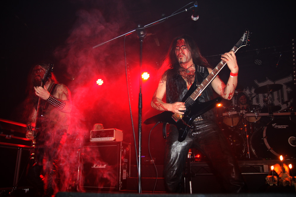 It’s sinister and ceremonial but thankfully the band were preaching to an ever drunken audience as the riffs flow through us with a serpent like tenacity spreading their potent venom and completely transfixing us. As vocals babble away speaking with almost forked tongue we are transported through ancient catacombs and the atmosphere is full of the air of past civilisations and history speaking to us like ghosts from ancient times. Smoke and blood red lights drench the stage but it is not used constantly but more for occasional effect as the music reaches a ‘Death March and bass drum thuds with the sound reaching a pitch and heaving and quaking. Somewhere amidst everything a burst of ‘Slayer is fired out naturally getting the audience to go into fever pitch. At times I was also reminded a little of Primordial in essence especially when they hit a furrow and heathen cleaved away. Naturally within the intricacy and melodicism of the instrumentation there was a bit of Rotting Christ too but Varathron wrapped everything up in their own dark and richly decedent style and although it had to happen it was a show we really did not want to end. When it finally did though the fresh air was much needed as we had all our senses had been invaded through the evening and that stench was still lingering a bit too close for comfort.