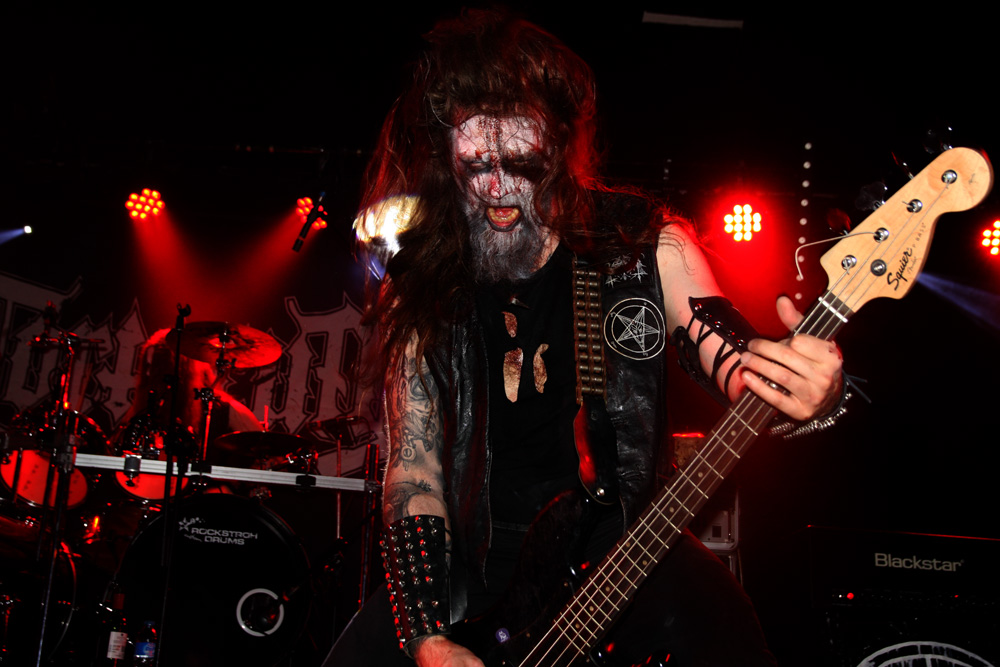 Italian, Norwegian, British, Finnish and Greek bands all clash headlong on stage this evening bringing a pure axis of evil to London. First up are the Italians Fides Inversa who appear cloaked up in pointed headgear looking like a coven of evil sorcerers. London does perhaps not deserve these visitors being lazy with not that many turning up for the start of the show but once the band turn and face the audience and the eerie intro piece puts the frighteners on us it is obvious they are not going to be holding back, certainly not as far as the volume is concerned which is turned right up to the max. They literally explode into action and it takes a moment to realise that it is the drummer Omega A.D. here who is also handling the vocals leaving the two guitarists and bass player to lead from the front. There’s a humungous mighty bass thump billowing out the speakers as they hammer away at their somewhat terrifying orthodox blackness. The vocals themselves are clean on the whole and hollered out, guitar strumming is incessant with the players buzz-sawing away hell for leather. The downright cheeky classical interlude from the numerically entitled tracks on latest album ‘Mysterium Tremendum et Fascinans’ gives the intense flailing a break before the bruising tumult hones back in. The band slow the pace momentarily but even then just as savagely gnaw away at us. Vocals rise into more sermon like crooning and the drums become enveloped in a fog of dry ice making things all the more sinister as the dark mass continues. It’s an impressive display, layered up and really tight with the sound crushing and phenomenal, kick drum ricocheting and cymbals clanging. The bands brand of blazing perdition is just the wake up call we need. As we move into an interlude of monkish chanting a guitarist prostrates himself in front of burning candles praying to foul gods. A cymbal is clanged and atmosphere and tension is rife before the beast rises to bite, very, very hard and savagely. That was an impressive display and well worth getting down here early for.