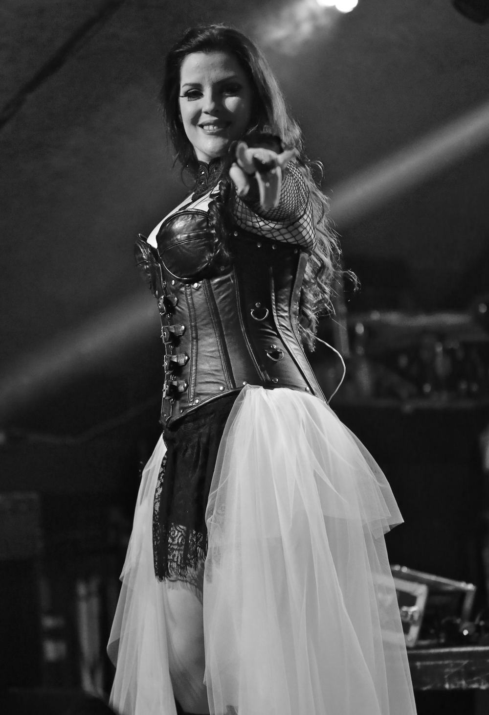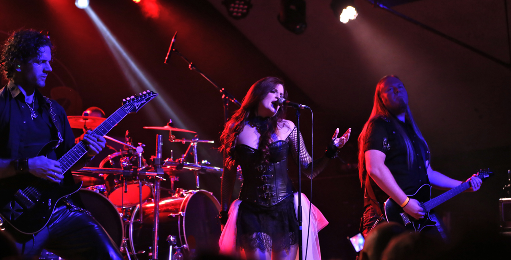 I was very much looking forward to French band Whyzdom as I had heard a little bit of their music prior to attending the festival. Contrasting with the previous band this charismatic outfit set about reawakening the unconscious with scintillating melodies that were safely housed in the traditional style for the scene with upbeat choruses giving people something to clutch onto. Vocal arrangements like Therion in places marked their style as male and female vocals duelled in the songs with graceful panache. Visually stunning as well as sonorously immaculate newish singer Marie Rouyer was one of the best vocalists of the weekend which meant it was a shame when her voice was lost in the mix occasionally. Donning a full length white veil the stage theatrics including various hand gesticulations made each song live and breathe. Letting the veil fall like a feather Marie’s vocals had an incredible range that enabled her to push the songs far beyond other singers in this genre. With song titles being scarce I made do with just observing but certain to buy their releases at the first opportunity as the scrum for photos had already formed before the band had even finished; shooter and I however went for a beer.