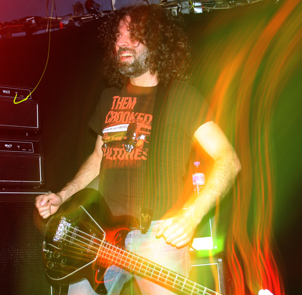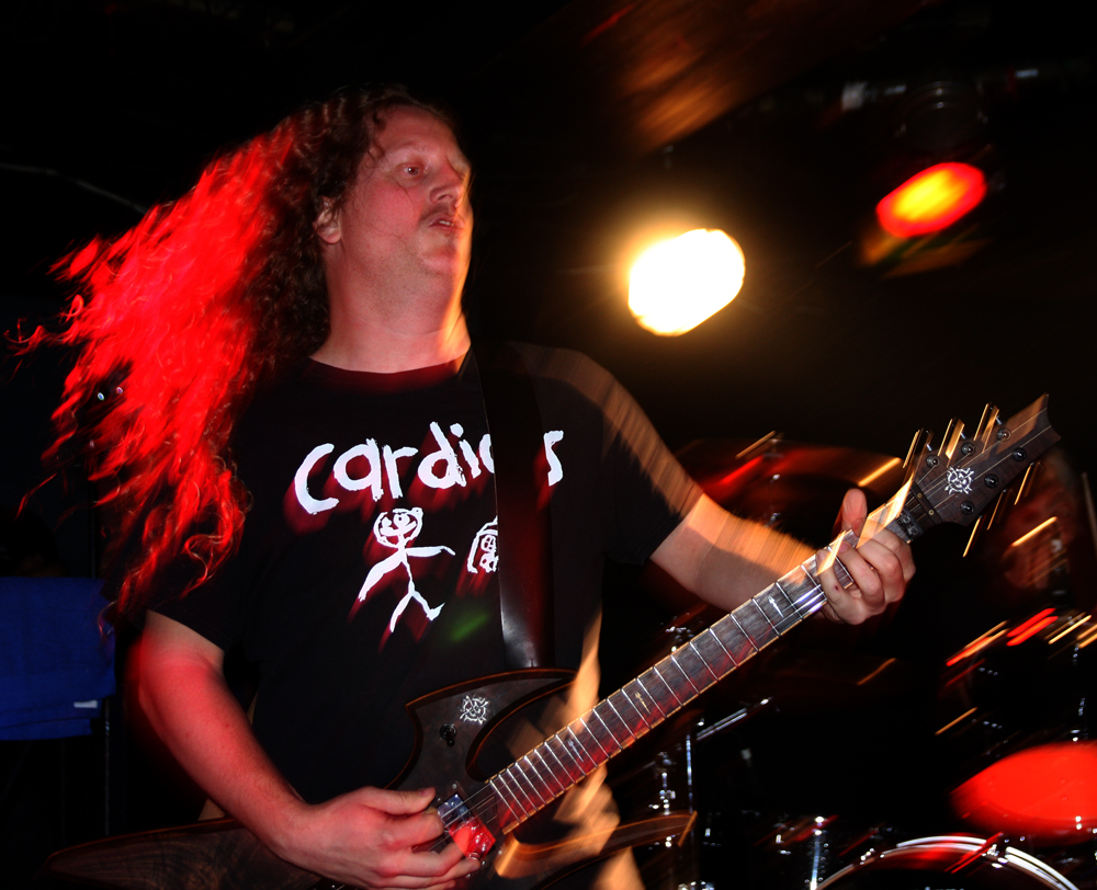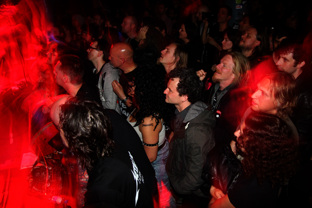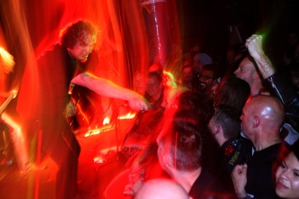It’s all very quickly forgotten though as it’s time for the main event! Voivod are not over here particularly promoting anything new but they are here for the first time since October 2010 and the release of last album ‘Target Earth’ and they have got the hordes rammed in to go mental. It’s from here they start with the odd tribal bombast of ‘Kluskap O’Kom’ which has Away rolling out the drums at the back and Snake at the front looking happily over the throng in front of him. Mentioning tribal was perhaps fortuitous as the band go from the relatively new right back in time and launch out an absolutely flattening rendition of ‘Tribal Convictions’ to say the crowd go for it would be an understatement. This is one of the bands mightiest blasts from the past and it goes down a storm as it thrashes wildly through us building into the screams of ‘Who’s God’ which has everyone yelling along. Chewy is really going for it on our stage left filling up his side of things and hair flying wildly about as he hammers away at his guitar getting a nice thick sound out of it. His excellent Cardiacs shirt is good enough to warrant a mention of its own too! We may not have the blower but the bass courtesy of new blood, as Snake introduces him in a between song pause, Rocky sounds pretty damn hefty and formidable. As far as we are concerned it’s a case to batten down the hatches, stand ground and get really into the selection of songs from throughout the band’s career for the next hour or so.
