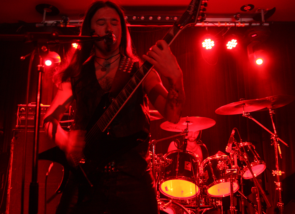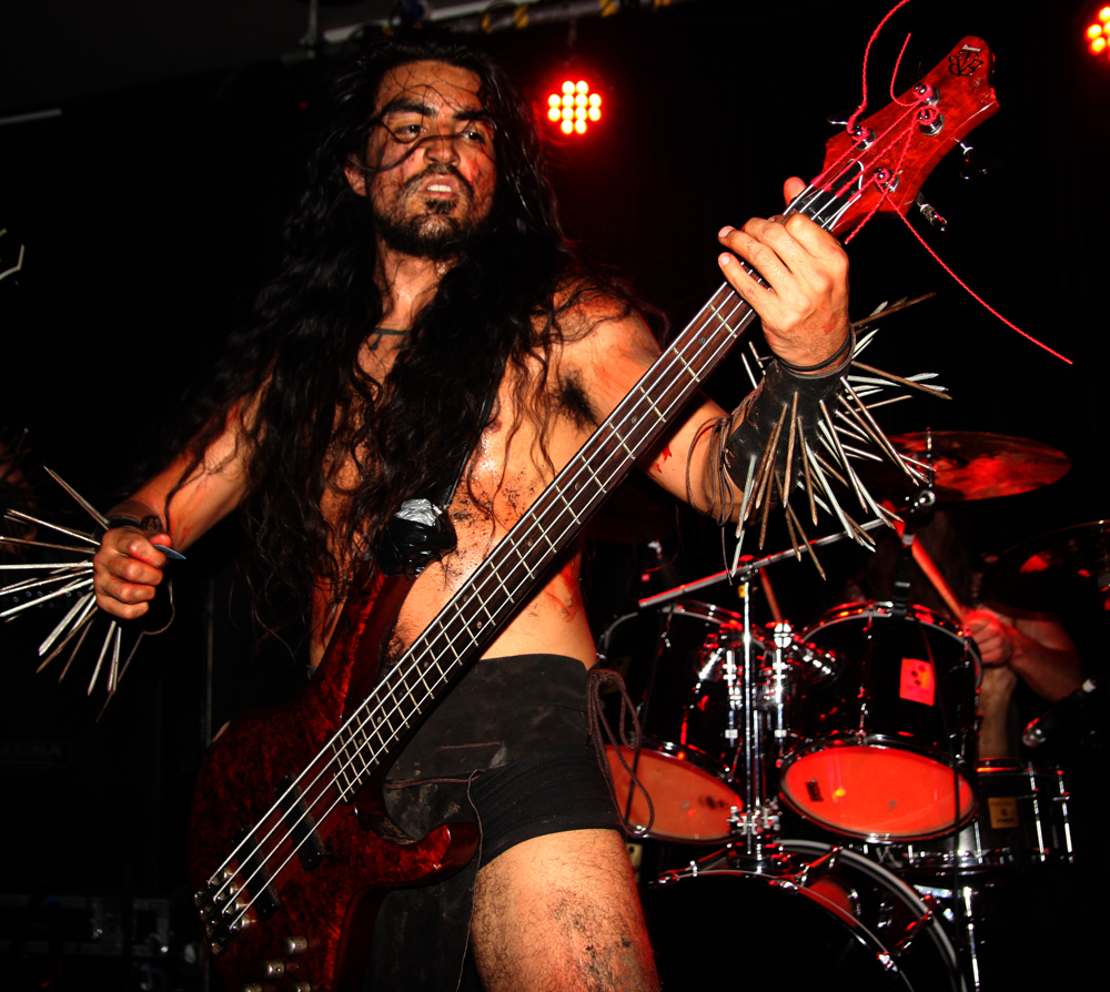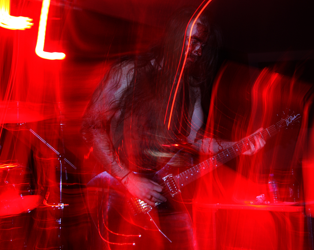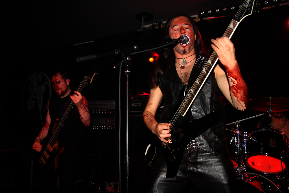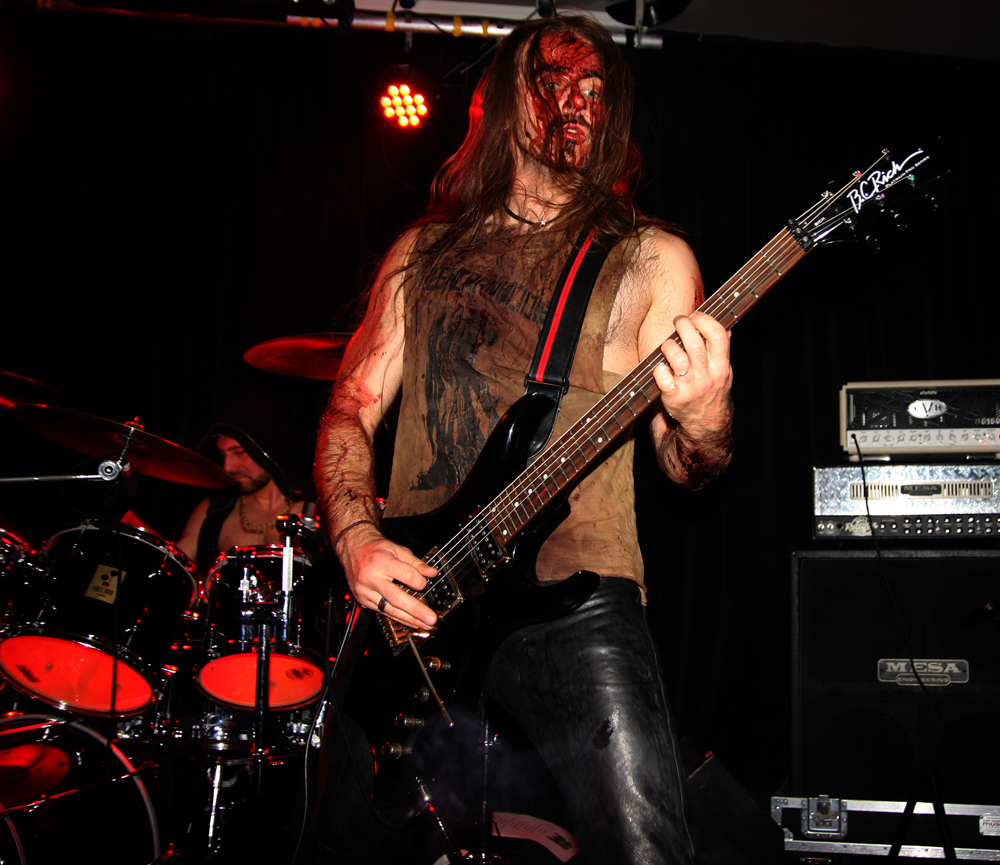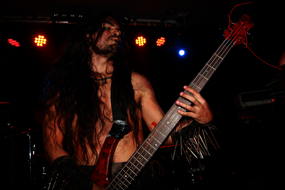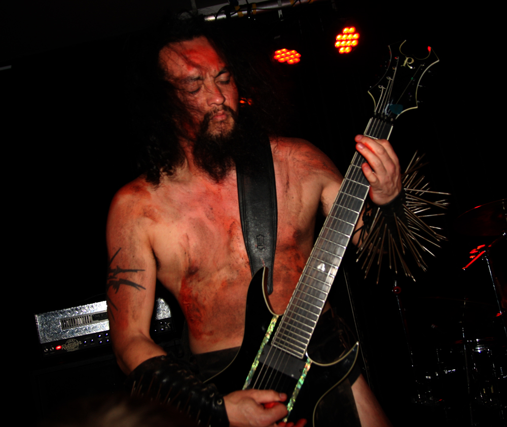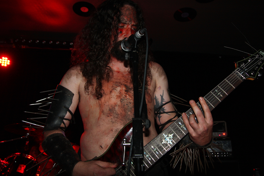 No worries about stinky people. No sooner than the first band have snuffed out their joss sticks they are replaced by the incense of choice from next London band Grave Miasma. Taking a break to blood themselves up before coming on stage the band look suitably grim and tonight don’t have billowing smoke to hide behind. ‘Death’s Meditative Trance’ is a slow one to start with and it seems like the band are limbering up to bite which they truly do part way into next number ‘Obscure Terror.’ When the drummer batters down and slams away the bloodlust explodes off the stage with the reverb driven vocals sounding especially ferocious. It seems like the audience are more than up for banging heads towards the front and it is well and truly rammed by now. This prehistoric worship rung out with grunts between songs and it was a case of join in or go and hide at the bar as they continued to drag us into their ‘Ritual Lair’ at an increasingly hostile velocity. Grave Miasma definitely seemed more on fire than when I last saw them at the Dome a few weeks ago, perhaps I was more in the mood for them and at least they always leave you knowing exactly where you stand; bloody and battered. Could things get any more barbaric?