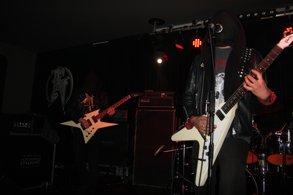 Yes it would seem as Impetuous Ritual who share members with headliners Portal are concerned. I’m not sure what I expected really having never encountered this lot before but it probably wasn’t very hairy men wearing spikes and loin cloths! Well we are really off to the Iron Age now. I have a feeling their set list was put out to confuse anyone stupid enough to try and review by it with song titles such as ‘Smell A Sheep,’ ‘Sensible Aboriginals’ ‘Wanking Kevin’s Tyranny’ and We are Crusty Swingers’ being written down in atypical Antipodean humour. Musically there is nothing humorous about this lot in the slightest once the drummer sorts himself out and the feedback is quelled. This is gnarly as fuck, full on caveman grind with thrashing mind-set that’s primitive in the extreme. Naturally it goes down very well with people acting like maniacs at the front whilst the rest of the audience stand back a bit trying to take it all in. The sound of supreme hatred as I seem to have called it continues with the band playing in near darkness, silhouetted as shapes barraging away from one track to the next. You can distinctly feel the seething heave of Portal amidst the riff work here no doubt guitarists Omenous Fugue and Ignis Fatuus bringing over some nuances from their other band. With mighty drums thundering and cracking away and cheese grating riffs going haywire it’s ugly, obtuse and a heavy relentless onslaught; what’s not to like? If there had been room for one no doubt they would have got a pit exploding into action A slow doompocalypse sounded especially hellish and brought a gravid atmosphere into play before naturally exploding into a fiery nuclear holocaust. Job not quite done as it was time for a couple of them to come back for the next set; somehow I expected they would change first!
