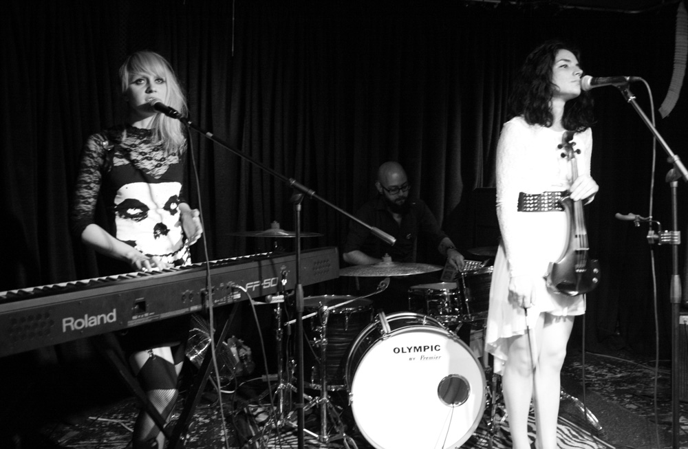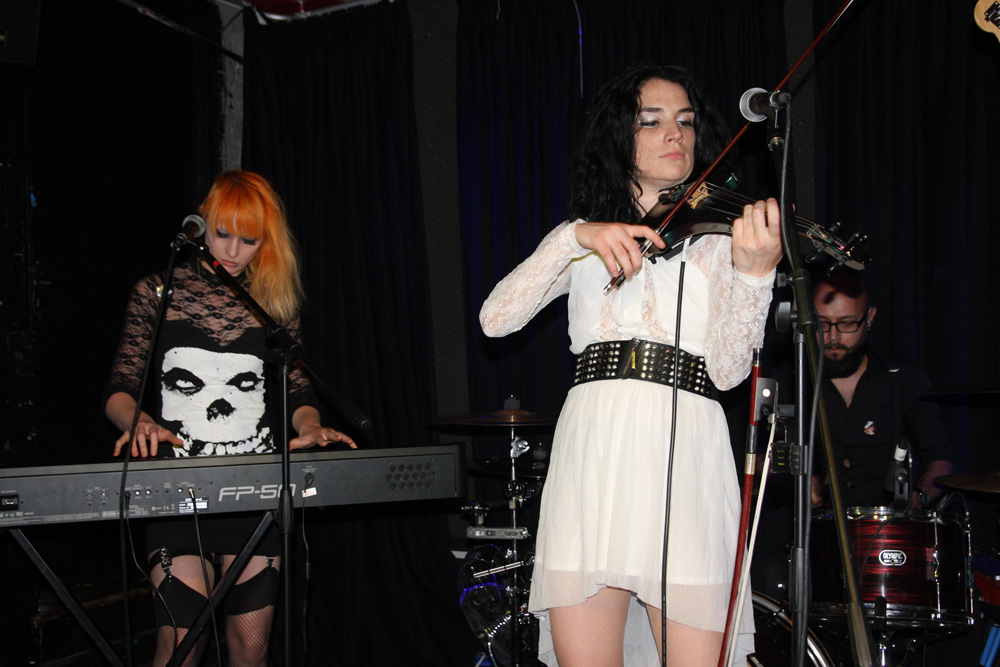 Theres been some changes in the Birdeatsbaby camp since I last caught them and it’s quickly evident that they are all for the better as far as this seriously underrated band are concerned. To say their last album ‘The Bullet Within’ hit me right between the ears would be a pun too far and a serious understatement and I was keen to hear tracks from it tonight. It’s ‘Hands Of Orlac’ from this that they set out to play and it starts to build when lead singer Mishkin realises her keyboard is not plugged in and band and audience have a right old laugh about it all. Sorted out, the opening sends shivers down the spine as it deliciously swoons in and proceeds to lead us off down a dark carnival etched path. Vocals are spot on and sound great and the bands secret weapon in the form of violinist backing singer Hana Piranha really adds to things. It’s all very stirring and evocative and with drumming battering away and some jagged riffing there’s more than a little headbanging presence to things for the first time tonight. The audience might not be up for that but everyone in the by now much busier venue is clearly enjoying things. ‘Tenterhooks’ gets its claws in and grooves away with Mishkin dancing away off stage with the audience. This is perfect poppy, kooky, glammy, circus induced rock with a great sense of the theatrical about it and songs like this are indelibly hard to shift which makes me wonder how on earth this band are not a lot bigger than they are. ‘Drinking Alone’ is much more of a solo affair and a heartfelt and evocative number that I am sure most people could identify. It’s beautifully and delicately and comes across as one of the most gorgeous and downbeat ballads I have heard in many a year. Naturally I raised my glass to it and the violin solo was almost enough to have us weeping into our drinks before jagged wrist slitting flamboyance spilled out and had everyone caught up in it. The way the group had moved from profound fragility to stirring passion was second to none.