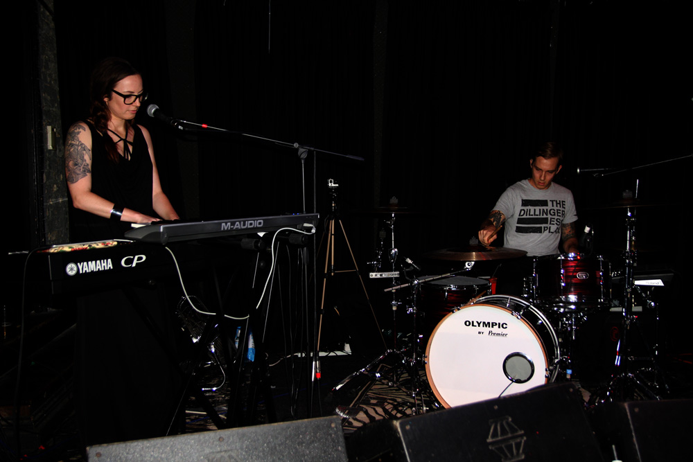 It’s very colourful walking into The Black Heart this evening with a display of trippy feathered jewellery, masks and old photos on display at the side of the room. It’s still fairly thin on the ground but things have a real air of intimacy as first band Death In Texas prepare to play. This duo is a husband and wife and they set up with just drums and keyboards whilst the rest of us are entertained by Alabama Shakes via the PA. Luckily bodies come in as soon as the duo begin to play and despite lack of guitars and bass there’s plenty of drama and atmosphere conveyed, the music represented by a loungesque and smoky vibe. The more acoustic approach works well and singer Ruth’s vocals come across as suitably sultry and the music mellow, jazzy and a tad avant-garde; there’s almost a touch of trip-hop about it too. At first I am reminded a bit of The Gathering at their most laid back. They play ‘A Body’ and we are invited to watch the video in the comfort of our own homes which is something I have taken them up on. Musically it could be straight out of a David Lynch film, very chilled but conveying the sense of a murderous ballad at its heart. ‘The Shard’ is apparently inspired by that noticeable blot on our landscape and is built up from the ground with drums and vocals becoming much more strident and towering ever upwards. They played a cover that was far removed from my listening habits but was apparently a Radiohead song and as with other covers of the act I have heard I found myself enjoying it more than I would probably have done if done by the band themselves. This was an interesting encounter although taking me out of my usual comfort zone proved very comfortable. The optics might not agree though and the vocals came close to shattering them as the singer hit the high notes on the last number.