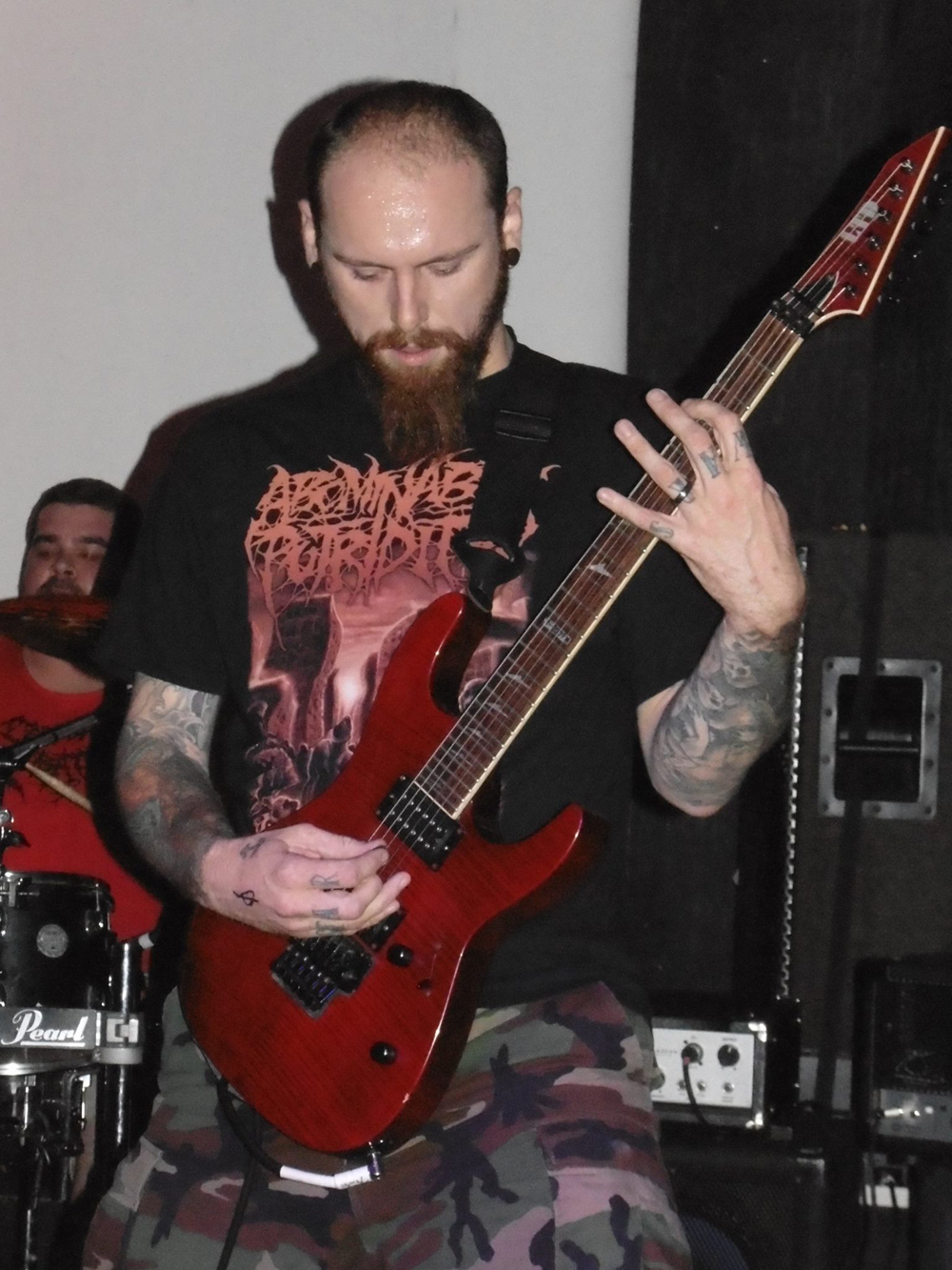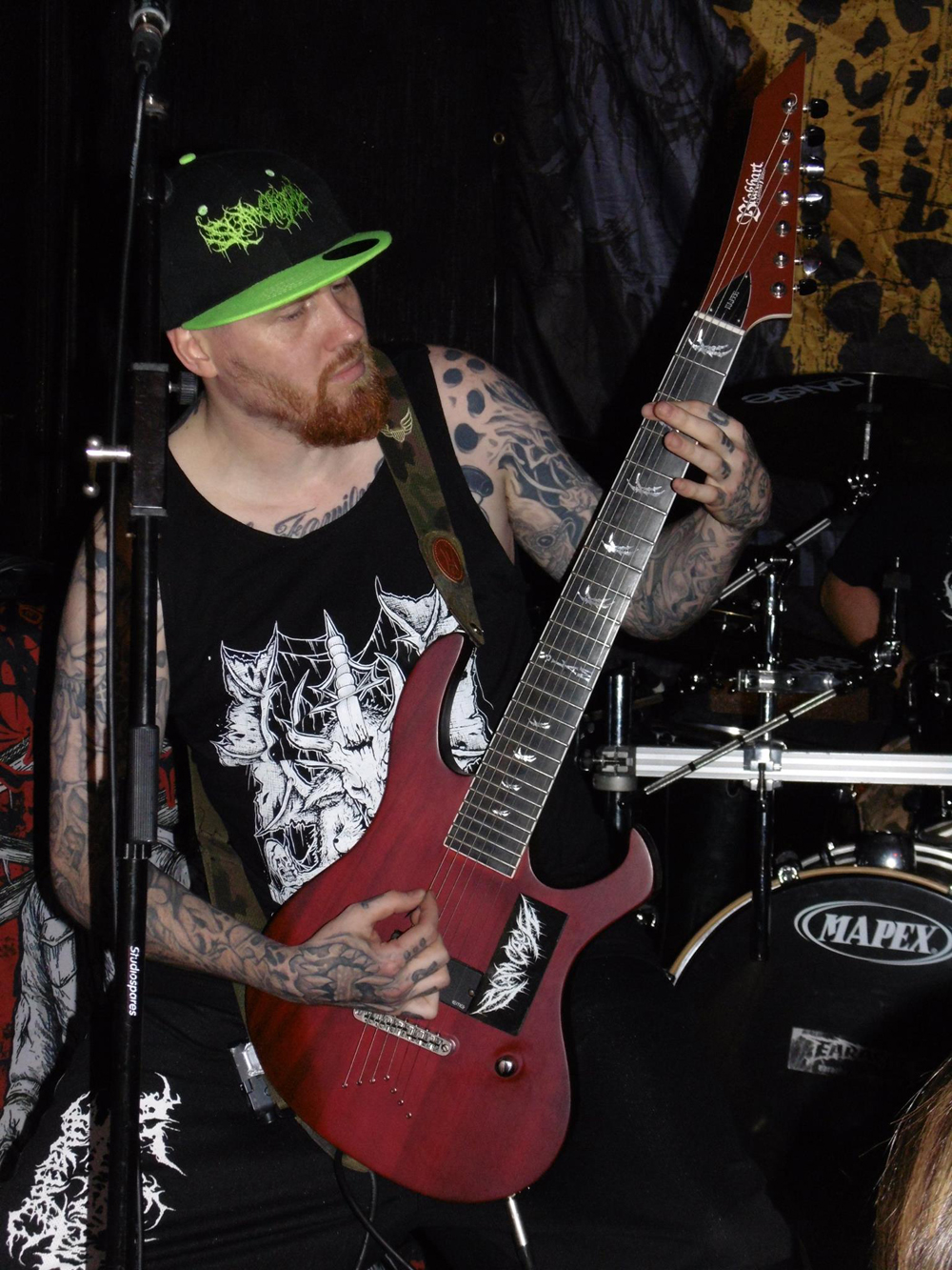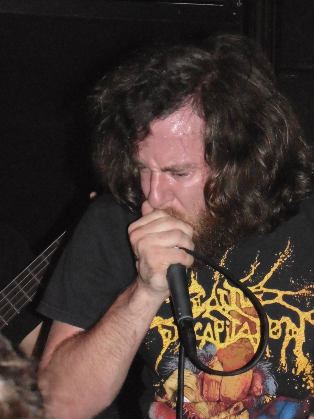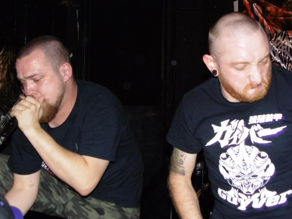Deciphering song titles throughout the evening was challenging to say the least as all the bands were new to me except Crepitation. Arriving slightly late the duo comprising Operation Cunt Destroyer were already in full flow as a barrage of programmed drumming was beating a rather indifferent audience. “Vaginal Parasite From A Dirty Hermaphrodite” was a blurring amalgam of thuggish riffing set against a programmed back drop that actually sounded decent and not too artificial before announcing that one of the tunes was about masturbation and was possibly “Cries Of The Chronic Masturbator” The Scottish duo eventually instilled some action as I had a brief look at the copious amount of merchandise on sale by all the bands. Newcomers to the slam scene Visions Of Disfigurement increased the momentum substantially by being a full band and tore through a set of crunching double kick encouraging plenty of hammer hands to pound imaginary objects. By now the venue was ridiculously hot as I think I picked out “Cranial Fornication” from the gurgling song title announcements otherwise the band shoved relentless amounts of riffing hooliganism down the throats of everyone and went down exceptionally well helped by the fact the band was from Manchester.