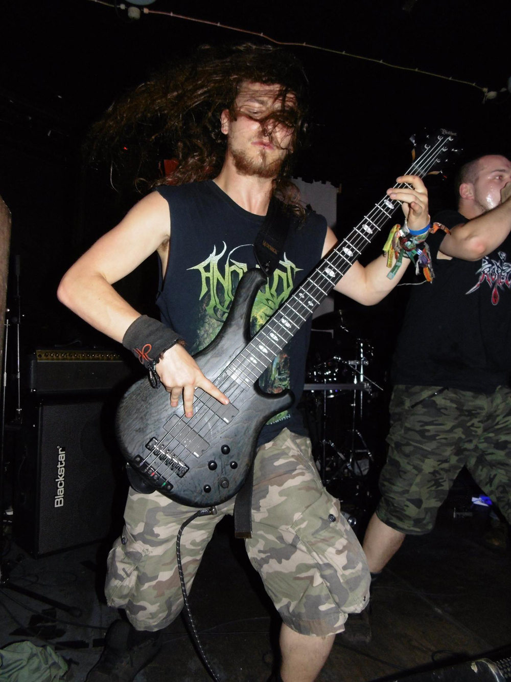 With a rather tongue in cheek approach Crepitation were received extremely well though I felt their overall approach had too much chat even if it was funny. However I can’t abide the so called pig grunting vocal style as the twin vocalists had plenty of stage presence that had the very animated crowd surge backwards and sent people toppling and grabbing anything to stop themselves hitting the deck. An inflatable hammer (equivalent to power metal swords anyone?) was thrown around and encouraged the hand waving fraternity to exercise their shoulders though I find the whole hand waving thing baffling to be honest. The bands set propelled a mushy sound of infra sonic bludgeoning at the crowd who had depleted for some reason but allowed plenty of pit action in the tiny venue. I couldn’t fault the attitude and performance of Crepitation but they had a mammoth task to overshadow Splattered and came off second best.