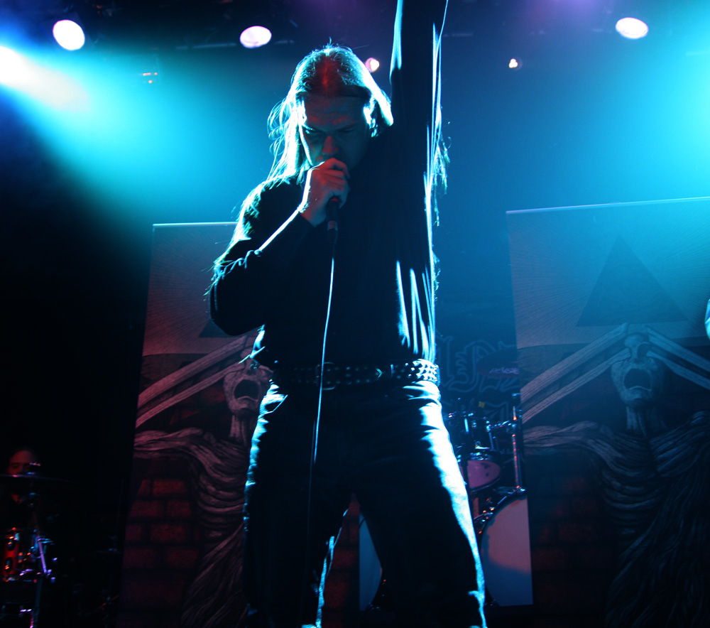 It’s early doors tonight but still a healthy amount of people in the venue to witness London based openers De Profundis. They don’t have time to play too much and have to dispense on something old but do have a few that are new, one that’s borrowed and the lighting is certainly blue, so that’s most boxes ticked. It’s literally the eve of new album ‘Kingdom Of The Blind’ being unveiled and so much of the material is from that and the air is filled with tumultuous deathly flurries and plenty of technical prowess on numbers such as ‘Kult Of The Orthodox.’ Vocalist Craig Land roars through a face obscured by his long hair and the rest of the band swap position utilising the stage to good effect. There’s the odd jazz like break thrown into the pummelling tumult to keep the audience on their toes and the band get heads banging down the front even before they unleash that borrowed track which is a cover of Death’s classic cut ‘Crystal Mountain.’ The intricacy of the guitar melody and bass heavy brutality work well together along with the vocal bellows and pretty much everyone seems to recognise the number. Last song ‘Illumination’ has drums hammering away and sees guitarist Shoi injecting some neat flowing lead work into things as they hit a sturdy groove and although they probably aren’t the easiest band to get your head around on a first encounter it seems like De Profundis gain some new fans tonight.