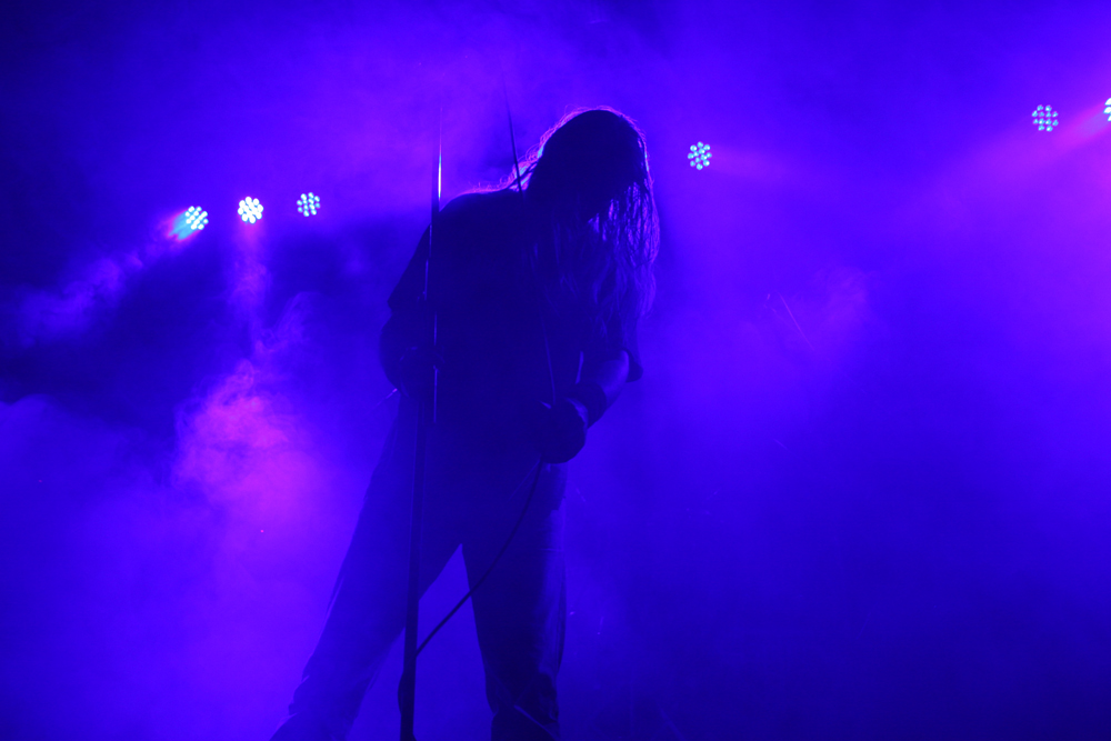 Right it’s a bit confusing but after breaking up in 2013 Altar Of Plagues have now got back and are playing some farewell shows? I think that’s correct and with the one real annoying clash of the day for me it means absolutely having to watch them and miss Keep Of Kalessin. There is no doubt in my mind as the trio tune up in moody lighting and the thick sound of drums reverberate and shake the place around that I have made the right choice. The opening salvo of ‘Mills’ and ‘God Alone’ that track with the video dance routine is nothing short of staggering and sounds spot on precise and fully virulent full of the teethed glory and no doubt causing a few injuries behind me as the album title fully anticipated. The dynamic is nothing short of jaw dropping, green and white strobes pulsate and keep up with the velocity of the controlled sound making it all the more potent. It actually makes a change to see the band for once as it is normally a dark environment on stage that they perpetuate and despite the fact that there is not a huge amount of movement from the front two players it still spins the senses out along with the burgeoning heaving musical tumult. After this the singer leaves the stage and we get a ringing sound of feedback before he eventually comes back. I guess it was due to technical problems but it serves up all the more tension and expectation for them to continue which they do in style exploding into another twisting mass of layered guitar contusions, shrieks and muscular drumming. If this indeed does see Neptune and Altar Of Plagues dead there is no denying that they have gone out in style. The band go into complete overdrive and the churning whirlwind whipped up here for the next 20 minutes or so (well that’s what it feels like) left us all in pieces. The arid gun-slinging ‘Twelve is Ruin’ is a complete contrast leaving mouth dry as it trembles away and inevitably explodes. I was hoping for one absolutely fantastic set today and this proved one of many and the next lot were going to keep the momentum up too.