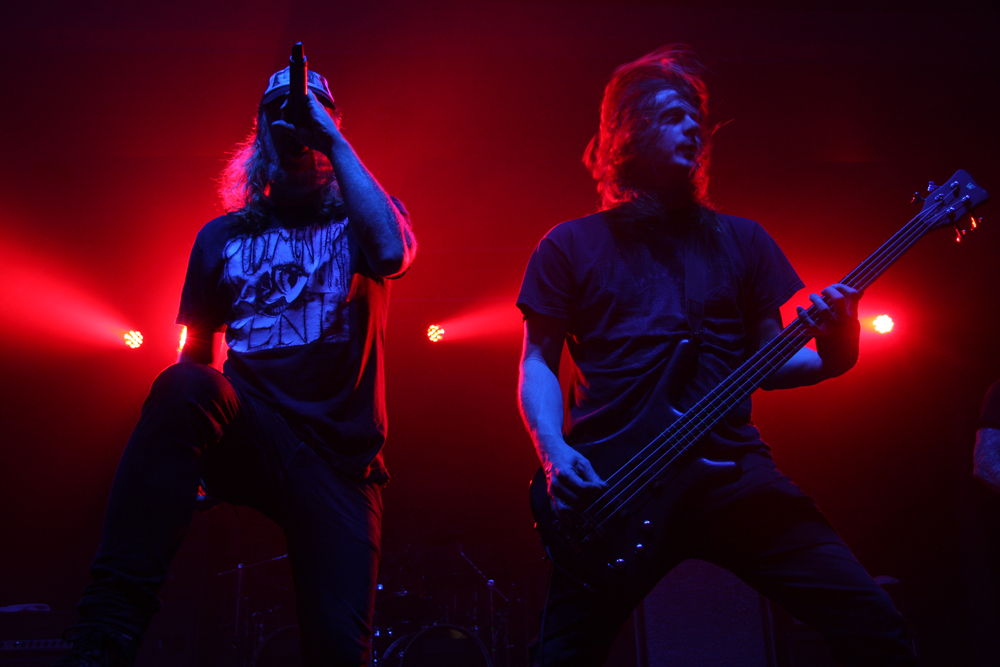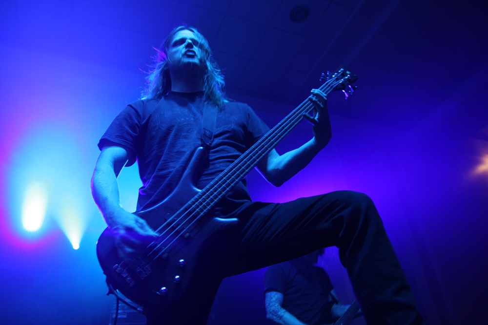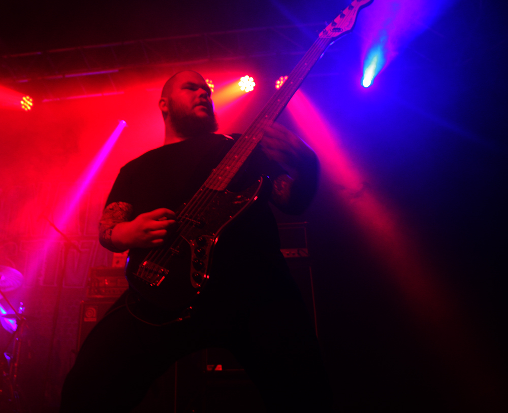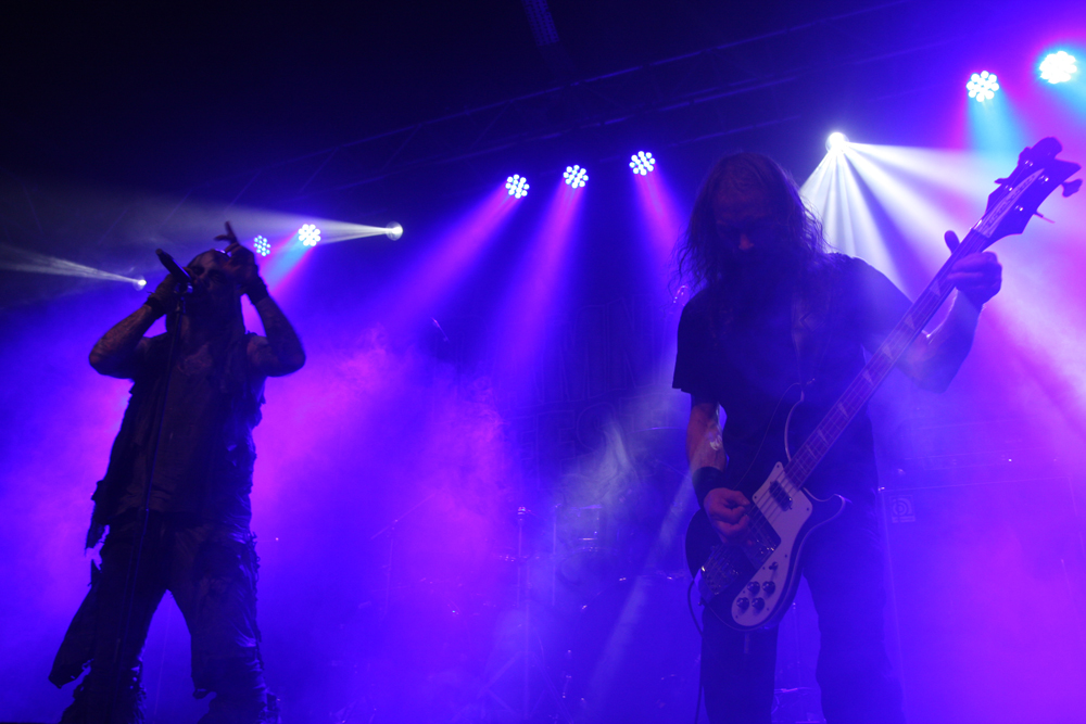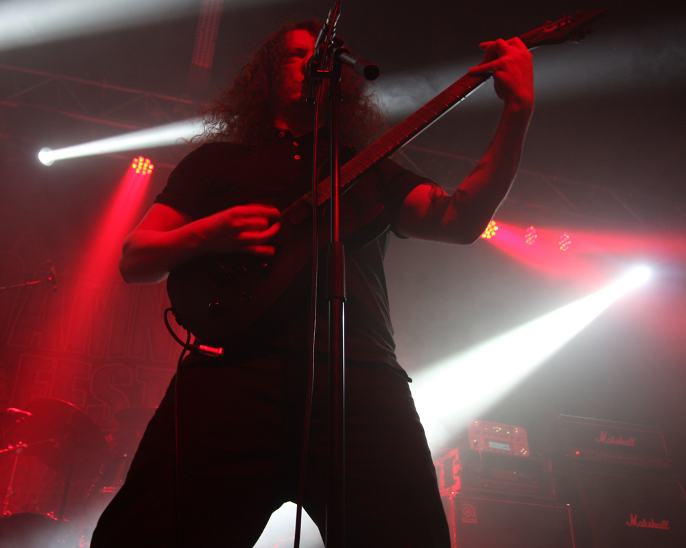 Thankfully right place and right time sees first group of the day The King Is Blind battering away on the Terrorizer stage. The East Anglian mob hold the accolade of being the first band signed to newly reformed Cacophonous Records and power out the speakers with opening number ‘Devoured’ bruising away. It takes a while to get used to the sound and there’s a choppy almost metalcore ballast about their abrasive death metal sound at first. With members having done time in classic UK acts such as The Blood Divine, Entwined and Cradle Of Filth they were always going to be an interesting proposition but it took me a while to suddenly realise the bassist Ceri Monger is also in one of my favourite bands New Model Army! Not like I haven’t seen him on stage before. TKIB are a totally different prospect from all the aforementioned though and really for me come into their own on Mourning Light, slowing the pace to a doom laden crawl and building slowly into a molten morass completely grooving down with grandiose precision. By complete contrast the whiplashing shred of ‘For All The Daemons Are Here’ has plenty of ferocity about it bolstered by ravenous vocals, death blasts and a galloping beat. At least everyone was awake now and I don’t know about blind, the king is probably deaf now too! (PW)