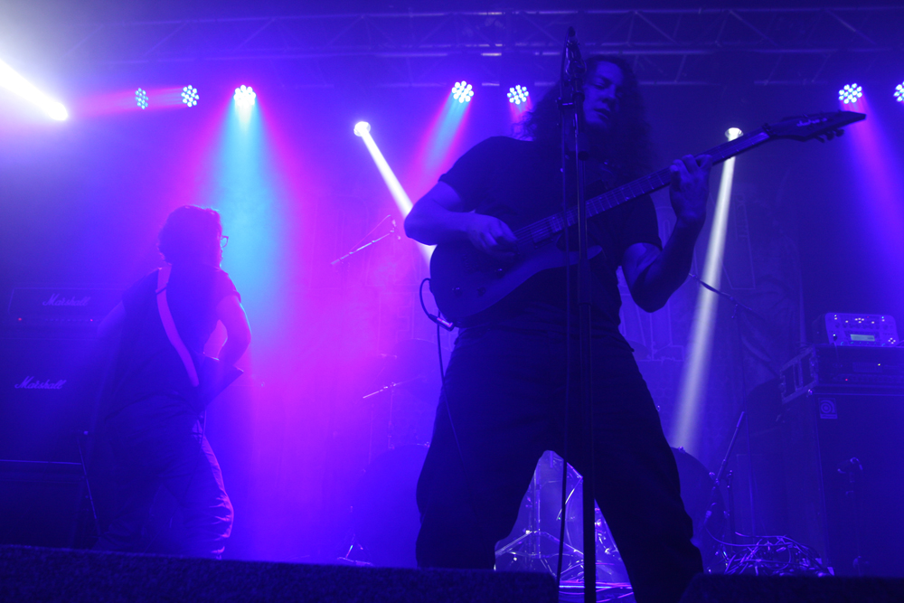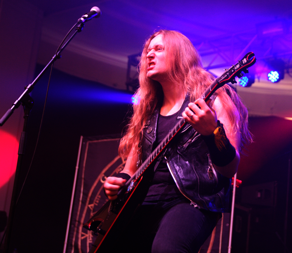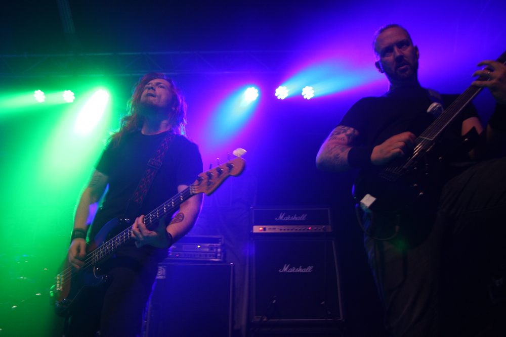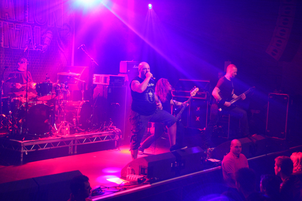 By the time it hit 14:30 and I’d finally got myself in some working order (i.e on to pint #4) Savage Messiah were about to hit the main stage. Whenever I attend Damnation, I always make a point of catching the thrash band as usually the number of thrash bands or the quality of thrash on offer at events like this usually decides whether I will attend or not. With the likes of Kreator, Destruction, Evile and Sabbat all playing this festival, Savage Messiah were the next to grace the stage and from the opening bars of “Iconocaust” you just knew it was going to be good. With a real classic Thrash sound, hailing back to the heavier spectrum of the 80’s style, the four piece blitzed through their set with tremendous power and volume. People who were outside were drawn in by the window-rattling performances and were blown away by it. The one downside though were the guitars. The vocalist’s guitar didn’t seem high enough in the mix so a fair few of the leads in the set were hard to hear unless you got into a sweet spot somewhere. Still, what you could hear was solid, no nonsense fast paced thrash and by the time the closing track “Majority Of One” came on, the room had a decent sized crowd and was informed that a new album is on the way. Afterwards, some people remarked that the sheer sound of the rhythm section was what lured them away from the bar and those who are picky about their thrash seemed impressed too. All in all, despite some sound hiccups, a good start to my day. (Fraggle)