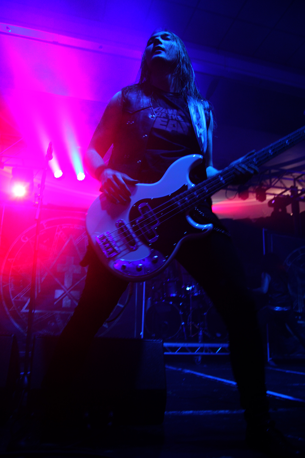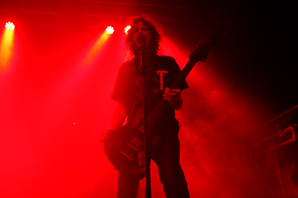 Hands up who has heard of Wiegedood a black metal trio from Belgium and who has their debut album De doden hebben het goed? Well at a guess only a minute fraction of the people crammed into the Terrorizer stage area. I have, we reviewed the album and I liked it on couple of listens that I have had time for. Nothing prepared me for them live though and the band proved one of the finds of the festival for many. Guitarist stage left Giles saw me looking through lens as they tuned up and cheekily flipped me the finger and then shortly after the band didn’t start to play as such but literally exploded into a thick and devastating multi-layered charge that pretty much took our heads off. Opener of again the three hefty songs they had time to play ‘Kwaad Bloed’ literally flattened everything in the immediate vicinity. The drummer is hidden and the two at the front loom out from an icy fog of blood red lighting vocalist Levy rasping away and strumming furiously. This is black metal of the dragged through a hedge backwards variety. I guess you could lazily reference the likes of Wolves In The Throne Room in context for some comparison as it abrasively bites in and it sounds fantastic, every note replicated in the mix making it all the more powerful. There is a variation in the sonic delivery as it progresses with some depressive facets giving further depth and atmosphere to the performance. Track are massive and epic and I found myself as did others rooted to the spot as it continued in a dizzying and dextrous display of rigid riffing. This was a totally explosive and frenetic display and one that won’t be forgotten in a hurry, the album is going to need a lot more listens after this. (PW)