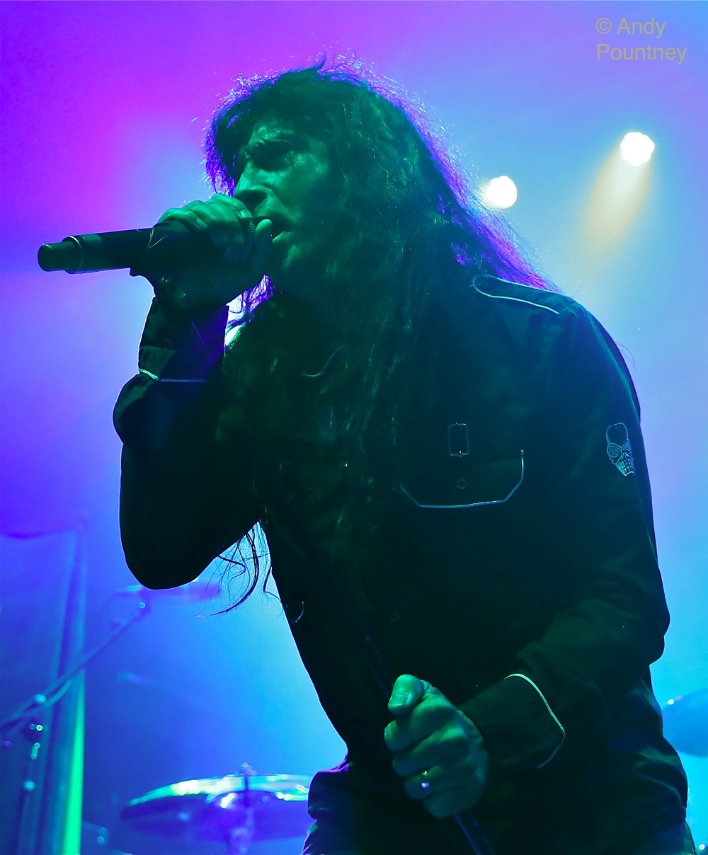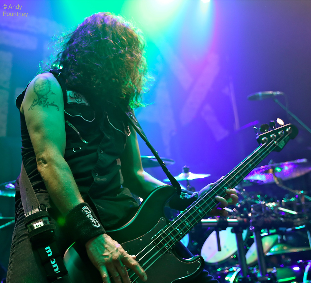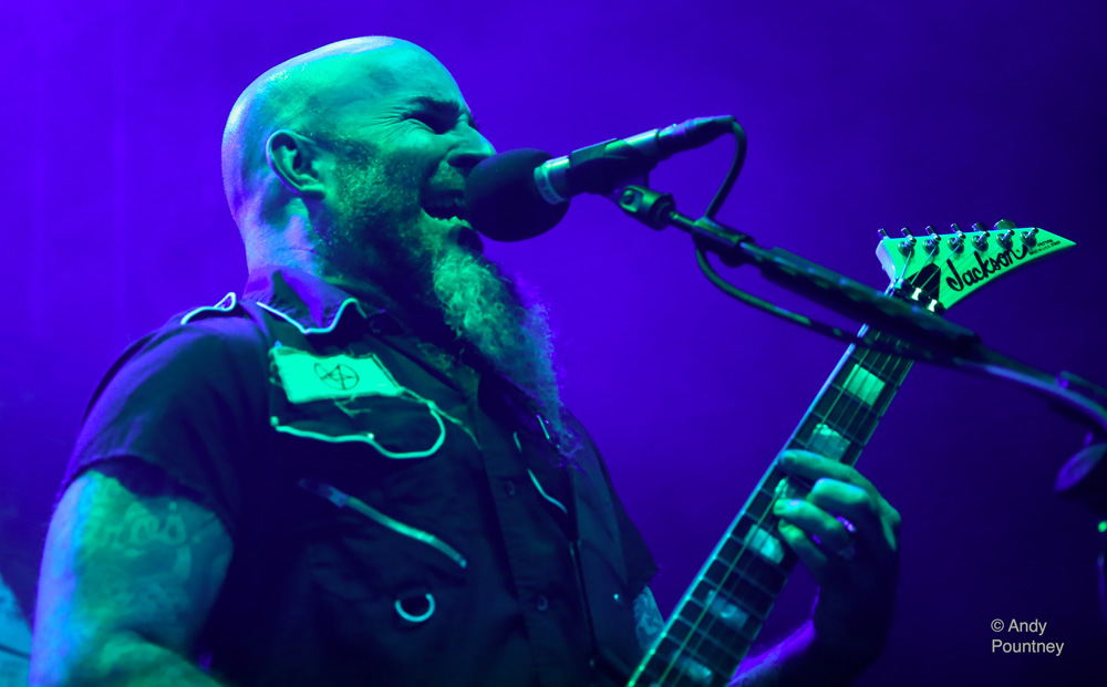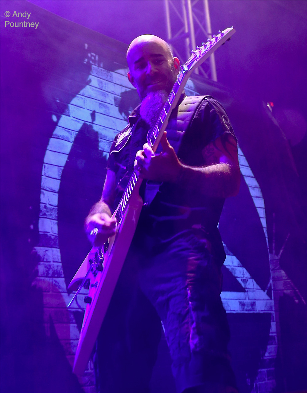 Even though Anthrax was a special guest on this tour the whole expedition could have been a double headliner with both playing headline sets as the moshers gathered in force at the front ready for thrash law to be meted out which began with “Caught In A Mosh” and sent the pit into an absolute cauldron of seething bodies flying everywhere. With stage diving and crowd surfing a non starter in major venues these days the crowd writhed around during every song as momentum was maintained with the Joe Jackson cover “Got The Time” which was sang by the crowd word for word. Watching from the balcony the audience behaved more like a hardcore crowd as every time Belladona came towards them they surged forward to try and sing into his mic which they had no chance of getting to. “Fight ‘Em Till You Can’t” was more known than I expected as the crowd caught their breath momentarily and was the inhalation of oxygen required when “Antisocial” created a thrashing stampede equivalent to the wildebeest migration crossing the Mara river where the weaker ones looked left for dead though the thrashers were kind and hauled them off the floor as the crocodiles masquerading as security looked on in bemusement. With momentum at its peak the band aired a new song “Evil Twin” which was adorned on the back of one of their shirts for sale, where they also had, incidentally, a sort of replica shirt for their “Spreading The Disease” tour in 1986 which baffles me why anyone would buy it if they didn’t go, which I did of course but I still didn’t buy it. The new song allowed the audience to gather its energy as did “In The End” which was given as a tribute to Ronnie James Dio and Dimebag Darrel with their pictures draped left and right of the stage, though I think Jeff Hanneman and Philthy Animal Taylor would have been more fitting for this tour. The song caused momentum to wane slightly only for the tribal drumming that followed for “Indians” to catalyse a massive roar of delight from the whole venue. With every person singing the lyrics the song was perfectly played and the delay before the thundering bellow of ‘Wardance’ by the crowd was cataclysmic as I had goose-pimples and a smirk of satisfaction that songs nearly three decades old and probably older than most of the audience were received like sermons on the mount. Closing the set was “Among The Living” equally as huge as its predecessor as Scott teased the crowd with its riff before exploding the song fully and a tsunami of bass emanating from the PA. The song was immense and when the tempo was cranked for the vocal section the pit went berserk and closed a set that most bands would never be able to follow but obviously Slayer was next.