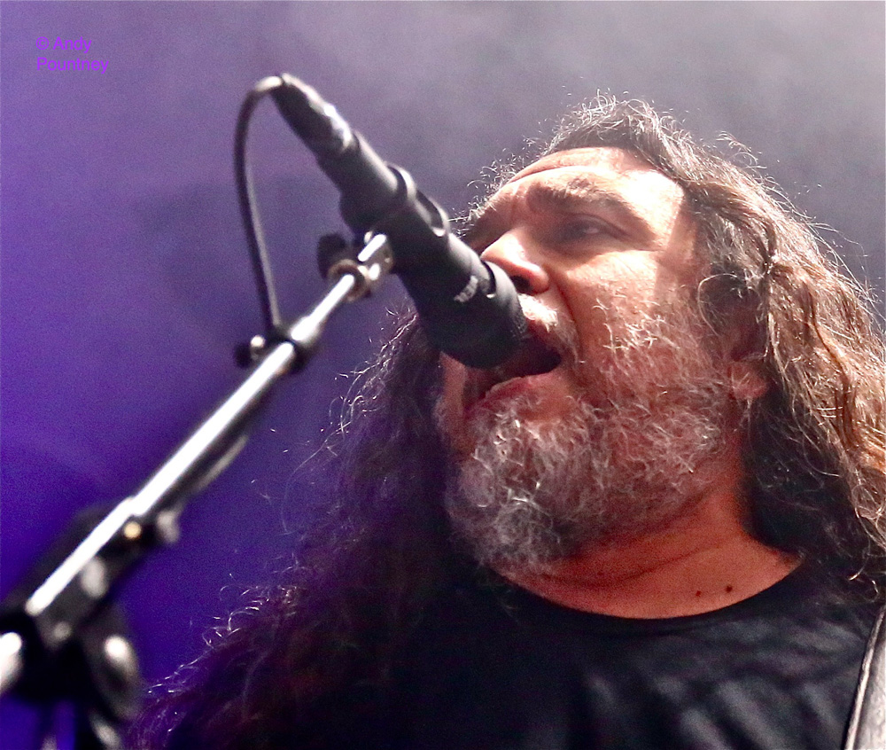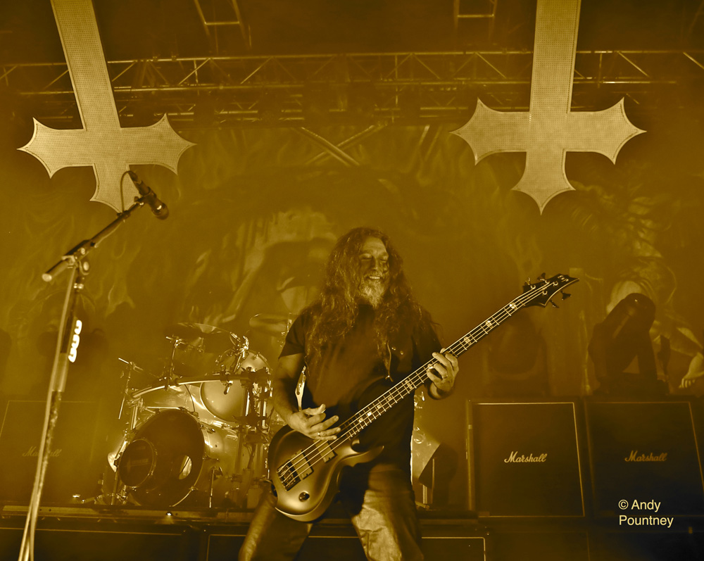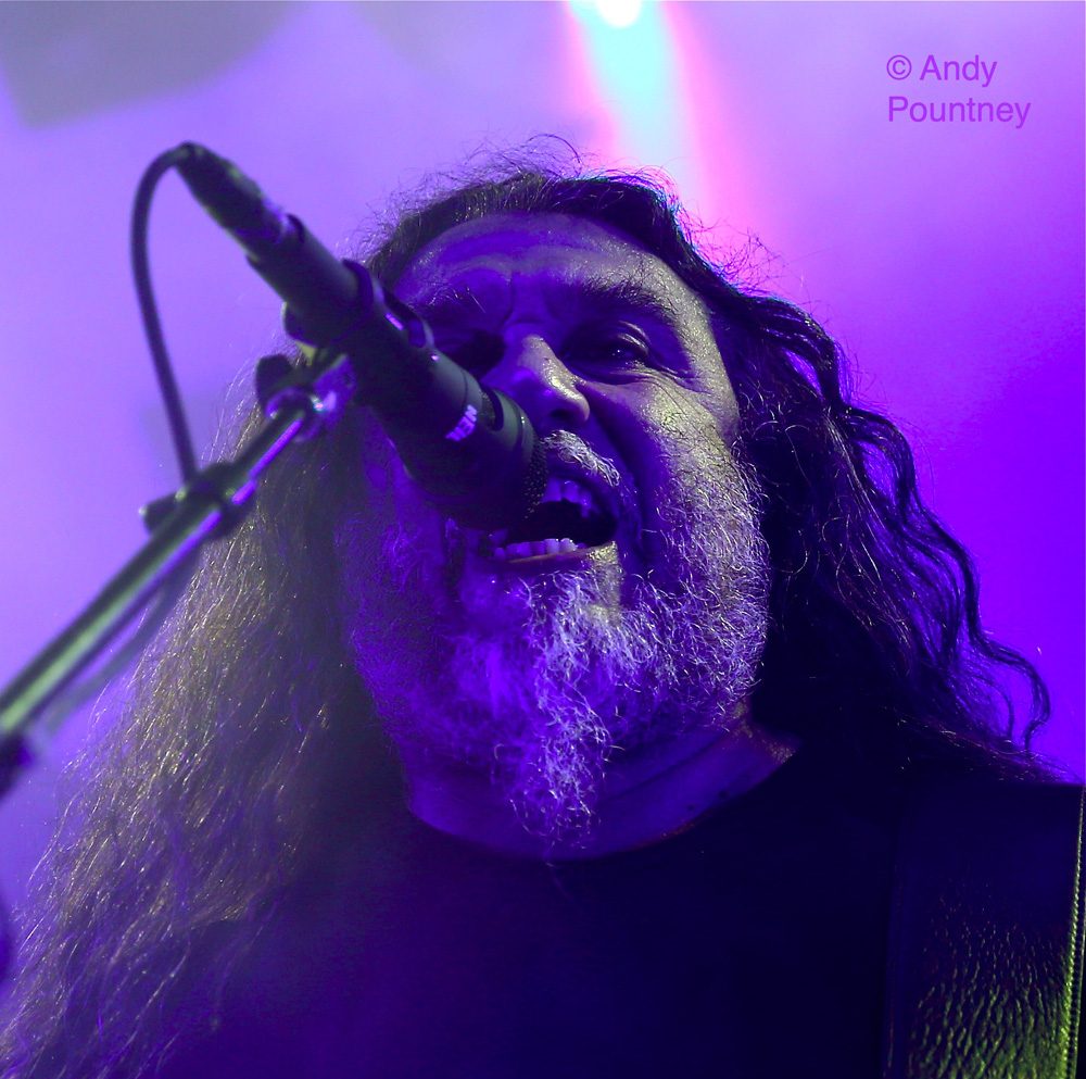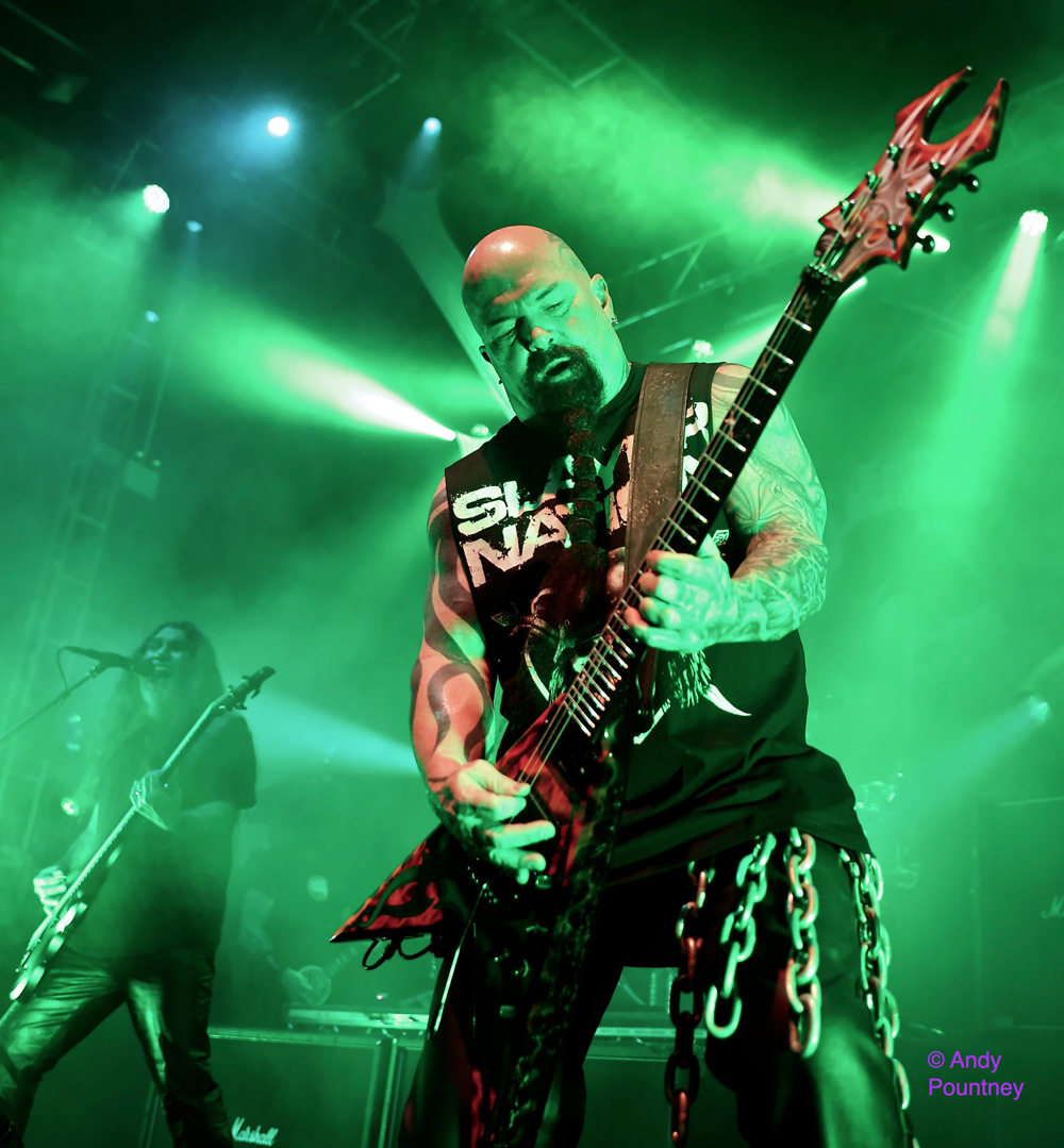 By now the place was sweltering and you could see a lot of the fellas with no shirts as “Vices” was played and again the crowd went bonkers only to be slowed down by the opening tones of “Seasons Of The Abyss” and one of the slowest circle pits I’ve ever seen as they waited patiently for the song to get going when the main riff came in. Vocally Tom was on fine form as this was possibly the most challenging song of the set to sing but as Kerry and Gary flanked him headbanging he pulled it off devastatingly leaving Kerry to choke his guitar on the lead break. Melding the song with “Hell Awaits” its opening drum stomp and hook is surely the best opening to any thrash metal song and whilst Tom can’t headbang these days Gary and Kerry made up for it even with short hair or no hair at all. The next song is a love song announced Tom and proceeded to serenade us  ‘dance with the dead in our dreams’ and screaming ‘temptations lost all control’ then stopping and saying something like it’s a good thing I have a microphone then hollered ‘dead’ which the crowd replied with ‘skin mask’ in total unison.