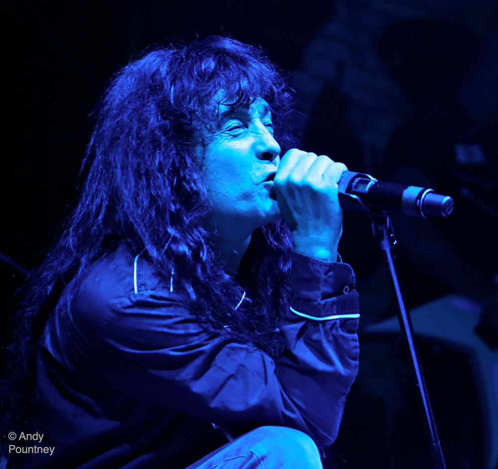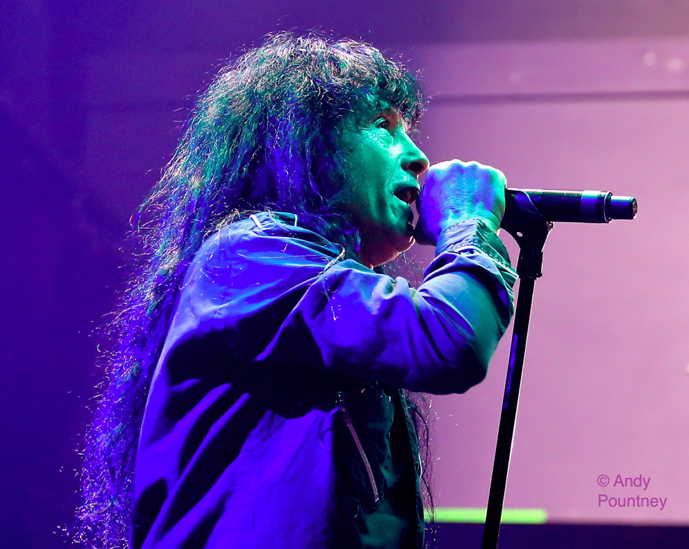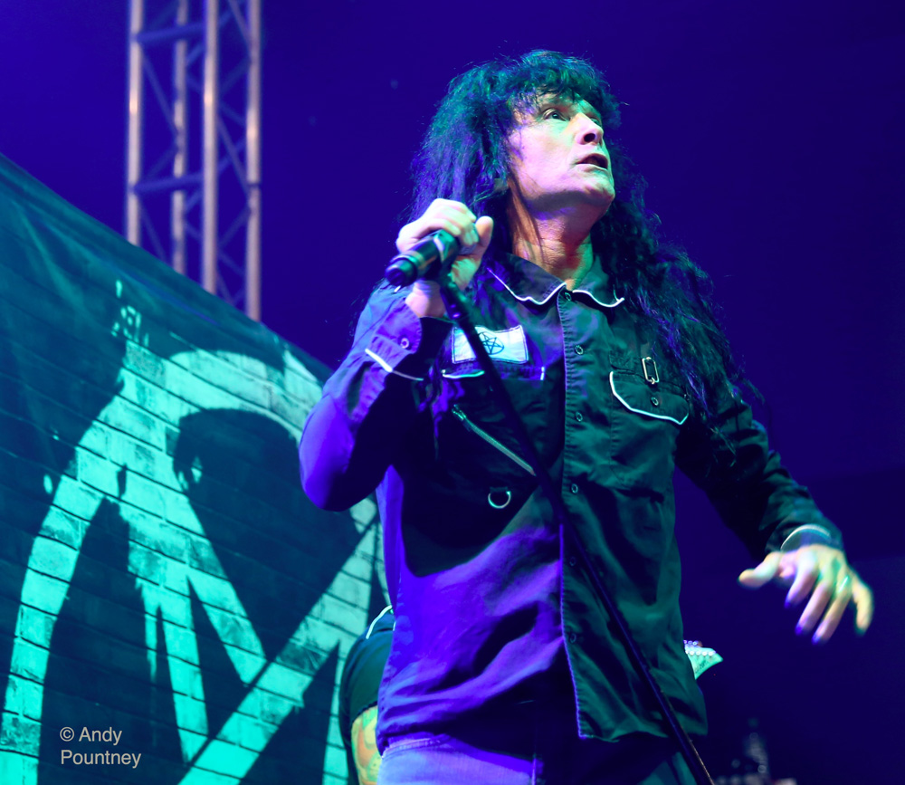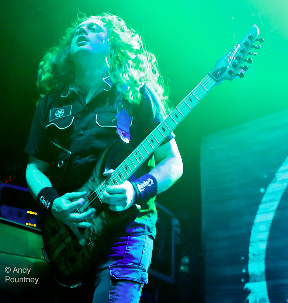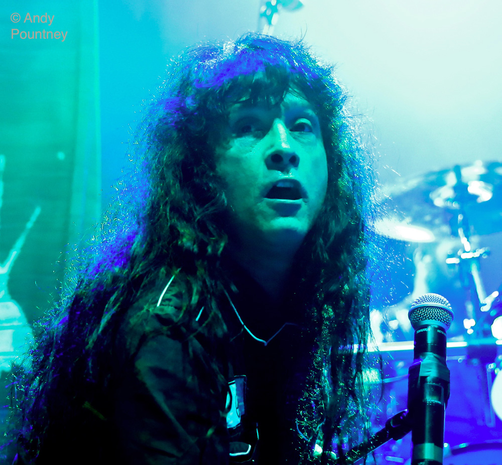 By now the place was sweltering and you could see a lot of the fellas with no shirts as “Vices” was played and again the crowd went bonkers only to be slowed down by the opening tones of “Seasons Of The Abyss” and one of the slowest circle pits I’ve ever seen as they waited patiently for the song to get going when the main riff came in. Vocally Tom was on fine form as this was possibly the most challenging song of the set to sing but as Kerry and Gary flanked him headbanging he pulled it off devastatingly leaving Kerry to choke his guitar on the lead break. Melding the song with “Hell Awaits” its opening drum stomp and hook is surely the best opening to any thrash metal song and whilst Tom can’t headbang these days Gary and Kerry made up for it even with short hair or no hair at all. The next song is a love song announced Tom and proceeded to serenade us  ‘dance with the dead in our dreams’ and screaming ‘temptations lost all control’ then stopping and saying something like it’s a good thing I have a microphone then hollered ‘dead’ which the crowd replied with ‘skin mask’ in total unison.