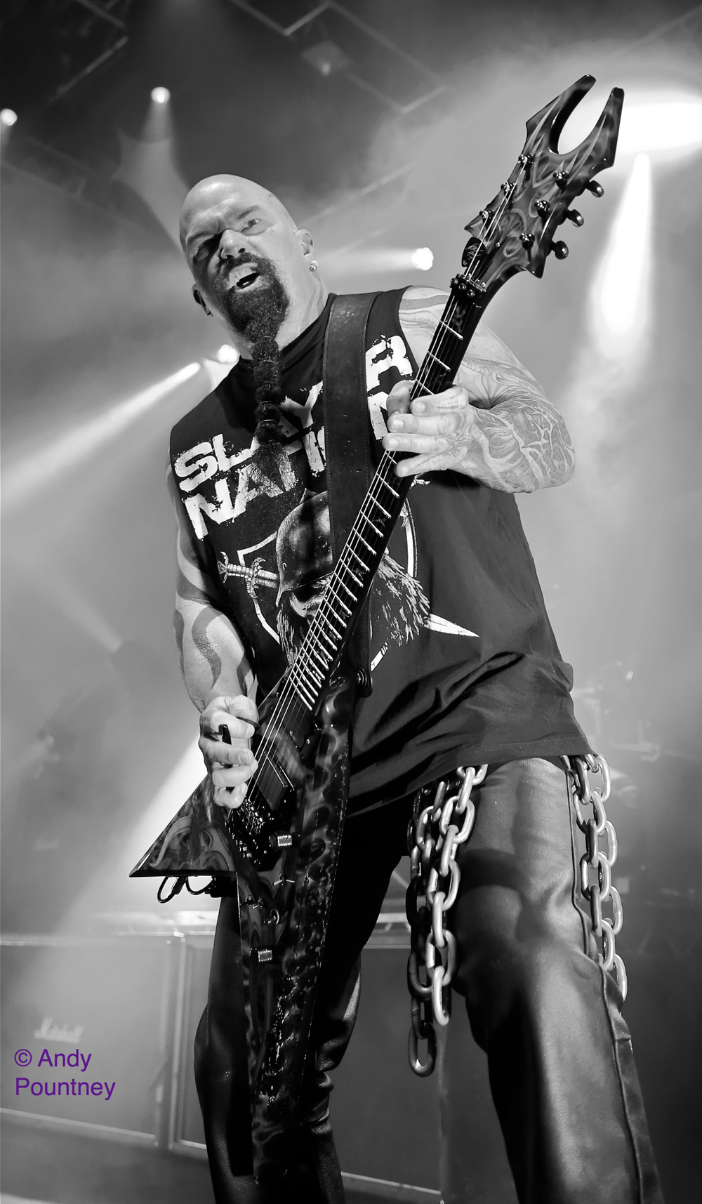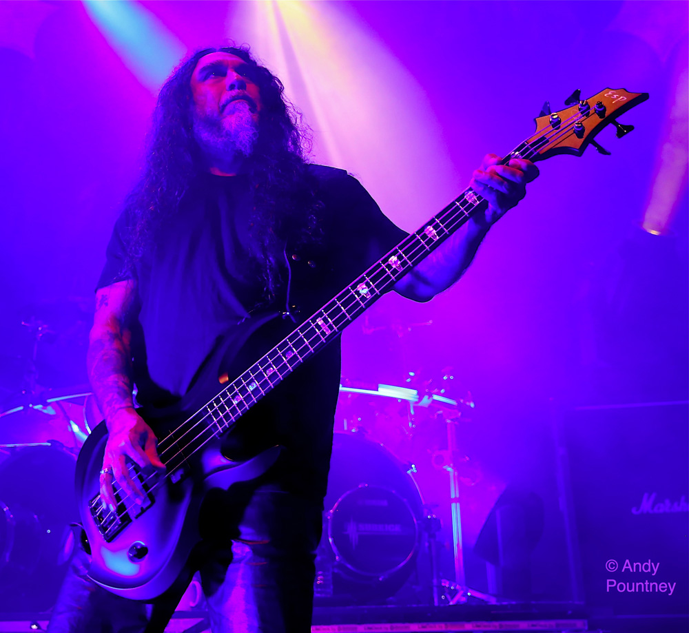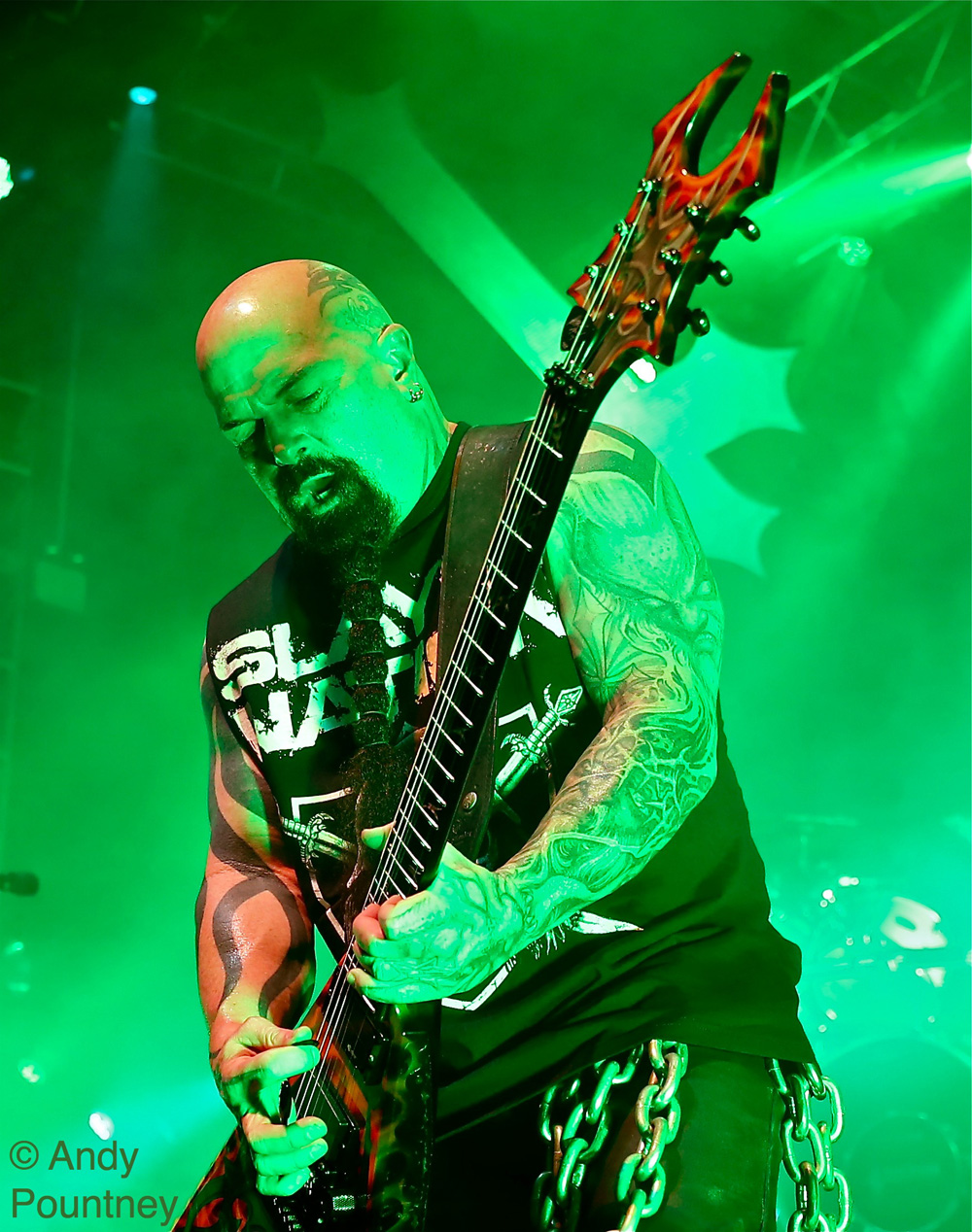 Old dinosaur thrashers like me within the audience crave old material and tonight they were given a new leash of life when “Mandatory Suicide” started up initiating a four song section of old stuff that was breathtaking as Tom roared ‘Suicide’ right before the double kick starts up and was fantastic vocally, no straining and hitting the high end of his range superbly. The riff and drum fill to “Chemical Warfare” followed immediately as Gary and Kerry stood side by side headbanging together with Tom stood at his mic spitting out the lyrics. As the song blazed towards the midpoint double kick the pit waited with bated breath for Tom to scream ‘fuck it up’ which he did with ear piercing clarity sending the pit into its next phase of violence. Pausing momentarily Tom asked if we were having a good time and followed by saying ‘it sure looks like you’re having a good time, it’s awesome’ and sniggered as the crowd shouted Slayer for the billionth time this evening, leading him to say they’re going to play something from “Show No Mercy” when he shouted ‘if you must live by the sword… you will “Die By The Sword”‘ as the sound was incrementally getting louder with every song played. “Black Magic” flowed from the guitars seamlessly as Bostaph cymbal tapped the intro section of it with bass kick giving the audience an opportunity to clap before crashing their heads forward for the riff break.