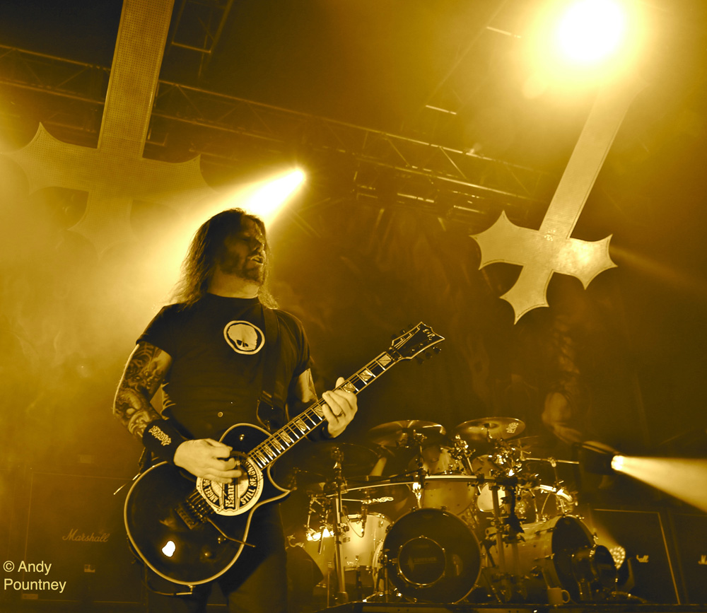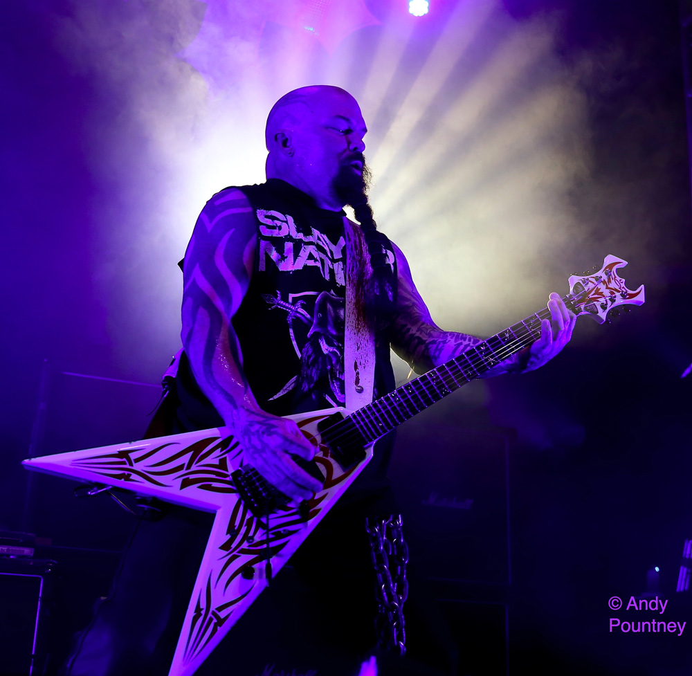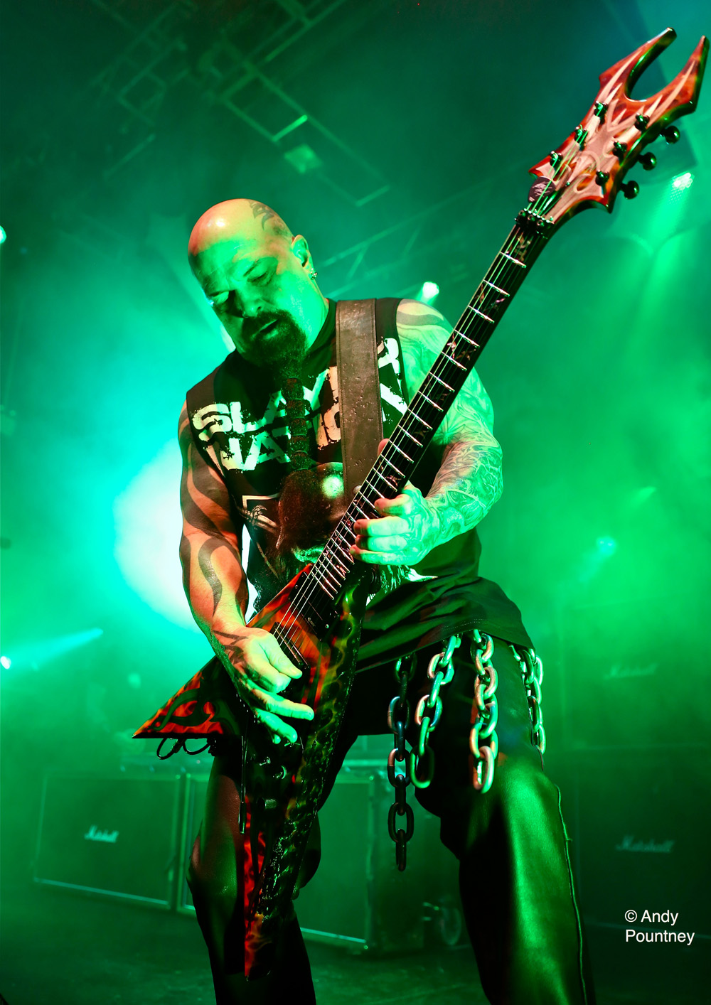 Old dinosaur thrashers like me within the audience crave old material and tonight they were given a new leash of life when “Mandatory Suicide” started up initiating a four song section of old stuff that was breathtaking as Tom roared ‘Suicide’ right before the double kick starts up and was fantastic vocally, no straining and hitting the high end of his range superbly. The riff and drum fill to “Chemical Warfare” followed immediately as Gary and Kerry stood side by side headbanging together with Tom stood at his mic spitting out the lyrics. As the song blazed towards the midpoint double kick the pit waited with bated breath for Tom to scream ‘fuck it up’ which he did with ear piercing clarity sending the pit into its next phase of violence. Pausing momentarily Tom asked if we were having a good time and followed by saying ‘it sure looks like you’re having a good time, it’s awesome’ and sniggered as the crowd shouted Slayer for the billionth time this evening, leading him to say they’re going to play something from “Show No Mercy” when he shouted ‘if you must live by the sword… you will “Die By The Sword”‘ as the sound was incrementally getting louder with every song played. “Black Magic” flowed from the guitars seamlessly as Bostaph cymbal tapped the intro section of it with bass kick giving the audience an opportunity to clap before crashing their heads forward for the riff break.