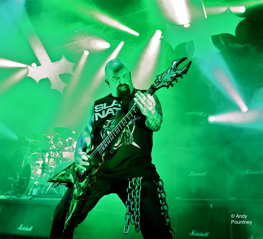 As the set was approaching its conclusion the intro sequence to “World Painted Blood” started up allowing the boys a breather before returning to the front of the stage. Possibly the only lull in the pit throughout their set which was quickly remedied by the unique riff to “South Of Heaven” which was greeted with a tremendous cheer but not like the next song was which was teased out via Bostaph with Holt, Araya and King facing his kit wondering when he was going to start the drum beat to “Raining Blood” under a canopy of red light. They obviously didn’t know when he was going to do it as you could see the guys anticipating then relaxing by knocking out guitar feedback and notes and took nearly a minute for that drum beat to come in and its inimitable teeth smashing riff.  As the song picked up the pace the pit practically filled the whole downstairs floor and looked like a fluidise bed of human beings all writhing around each other. As “Raining Blood” ended the lights changed to a venomous green and the riff to “Angel Of Death” was upon us and obviously the end of the set and Tom did its opening scream flawlessly in a lower tone obviously.  King and Holt traded leads as the song hurtled towards its finale as the double kick fill was the starting pistol to all out war in the pit and ended Slayer’s monumental set in Leeds. Slaaayyyeeerrrr!!!!
