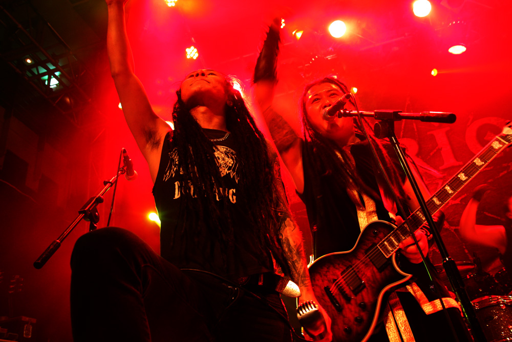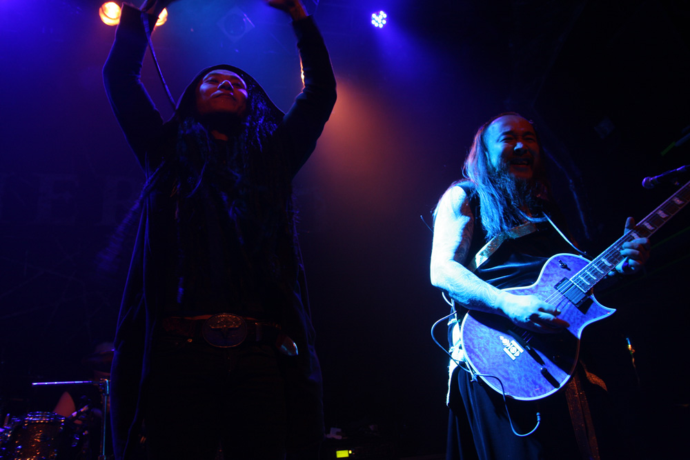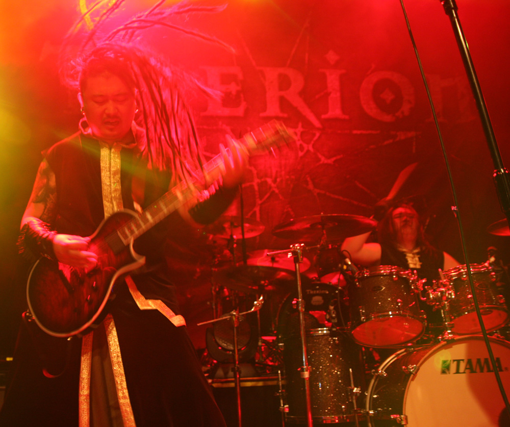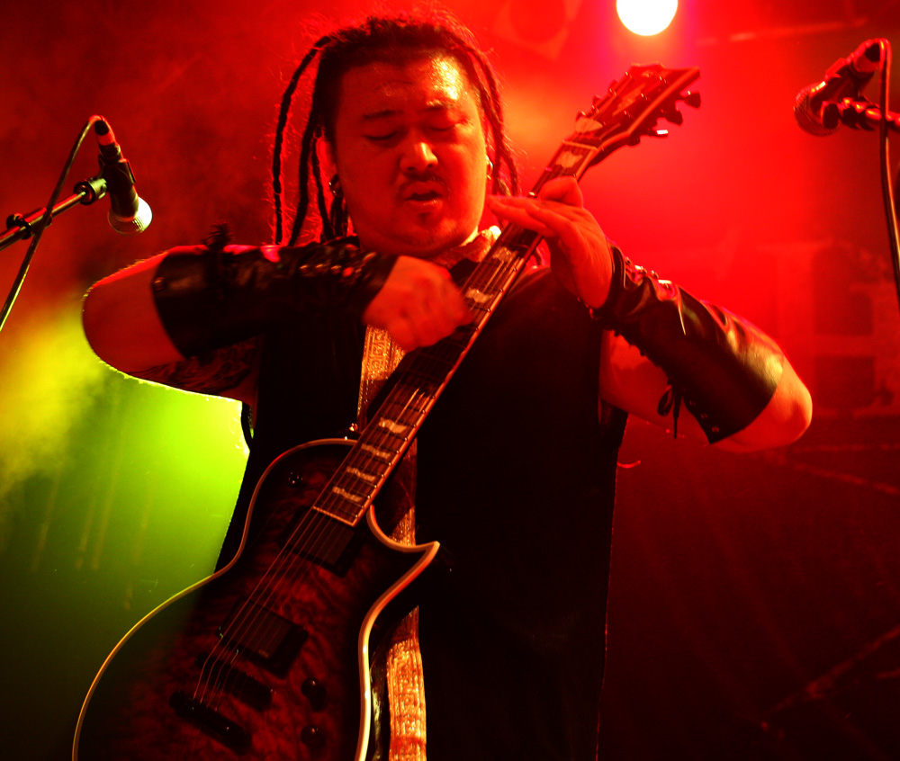 As I said things were versatile but nobody really would have guessed they would end up watching a Mongolian band with sampled horse hair fiddles and throat singing playing a brand of in the face metalcore. That is just what we got though with Ego Fall and it proved a compulsive culture shock and a half. This was a case of tradition meeting modern metal headlong and the players were well and truly in their element clearly overjoyed to be playing London even if it was far from capacity and a cold wet and miserable night. Dreadlocked singer Sun Bori was a blur of motion, charging around with his old style radio mic he reminded a bit of Tomi from Amorphis. The musical Mongol metal was shredded out in a fast and furious fashion and successfully turned the place into full on party mode, people who had not checked out the band prior to the show no doubt wondering just what the hell they had walked in on. There are obvious comparisons to Tengger Cavalry to be made here with the galloping tundra flavour on display but there were times that I found myself thinking of the likes of bands such as Deftones as well. One thing is for sure this lot would make one hell of a festival band. There were also some slow, brooding electronic parts and even a bit of dub before the final explosive thrust and even with most of the traditional parts sampled the vocalist’s rabid yells got a fist pumping reaction and the band certainly made some new friends tonight. They were more than happy to chat to all comers over at the merch stall for the rest of the night too. Band merch of the night a Therion board game, anyone?