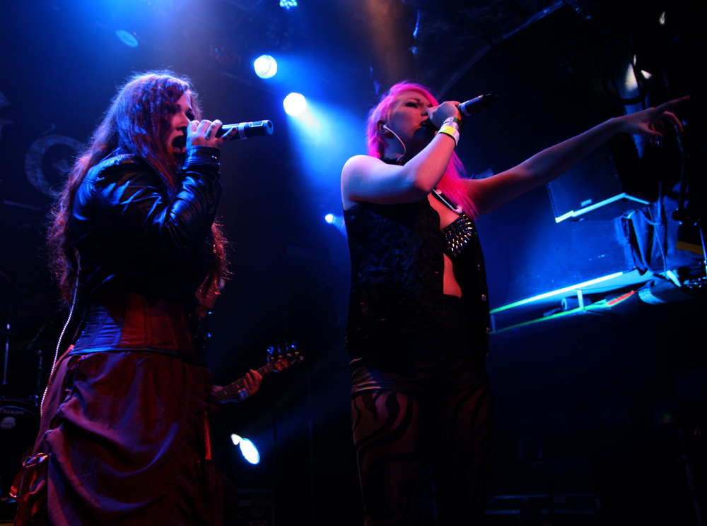 You know you are up for something epic when the set-list fills up two whole sheets of paper and that’s exactly what we got from a 2 hour set tonight with Therion. As Thomas Vikström informs us, there is no new material, nothing to prove, just all the hits! The only odd thing about it was the fact that only 300 advance tickets had been sold and there was no sudden surge through the doors, I guess everyone is in hibernation mode and like me riddled with man-flu but those that decided against coming certainly missed out. From the opening charge of ‘Ginnungagap’ the band had us eating out their hands. I mentioned pantomime earlier but this was much more about the music than that. I guess without the presence of Snowy Shaw and his eccentric costumes that quality was missing but this was no bad thing and it was down to the artists to give us a much more serious show tonight. There was no shortage of things to look on as far as the stage was concerned with the seven players all moving around and at first it was near impossible to choose what to focus on while headbanging to the swaggering riffs and be caught up in the fantastic choral vocals and austere parts from the singers. Vikström every bit the frontman with his cyberpunk get-up casts the runes on the first few numbers and the jagged riffs from Johnnson and Vidal come thick and fast. This time around female vocals see the addition of Italian Chiara Malvestiti to the band and she is excellent in her parts. Eyes cannot fail to fall on pink haired and spiky bra wearing daddy’s girl Linnéa Vikström either. She adds a massive impetus to the band and really has developed into a formidable vocalist and front-woman, giving a youthful exuberance to the performance. Both are completely spot on with their parts and are a joy to watch when they interact.