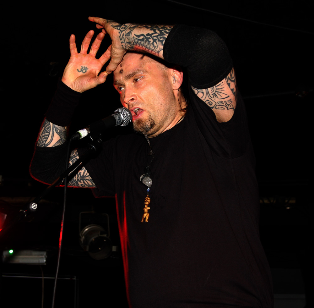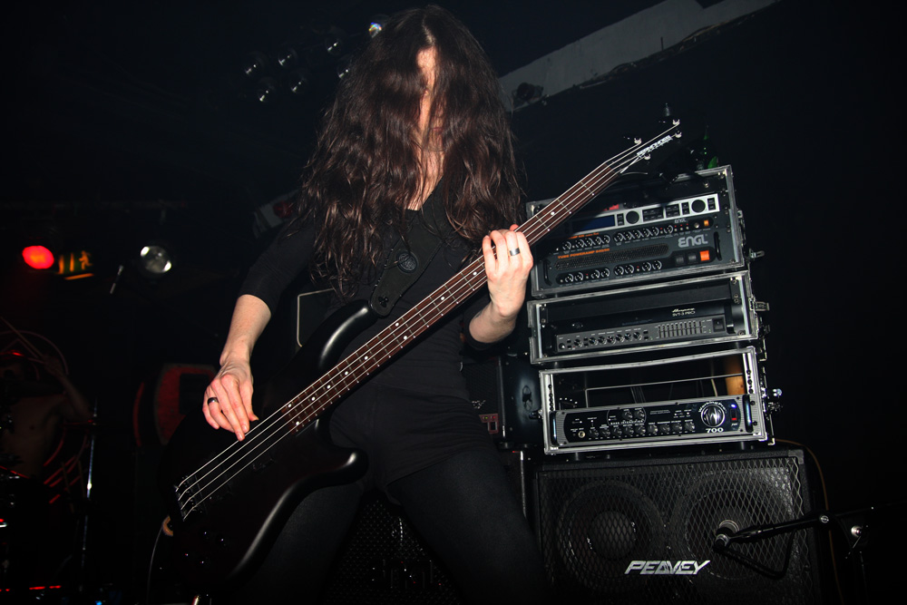 With latest album ‘Sun’ still beaming very freshly it is time for Secrets Of The Moon to bathe us in its bright light. Theirs is a show lingering in dark tones though as expected and they hit things straight off with opening track ‘No More Colours’ going from brooding start into a massively layered assault. Dry ice sees the figures looming from the mist and there is also plenty of white light and a pulsating strobe light flickering in line with the artillery of drum beats. sG hollers strumming away and on our stage left Ar is too a blur of motion. As for the bass wielder Naamah Ash to our right her face is completely buried beneath layers of hair as she drives away with the deep bottom end. Sound is magnificent the gothic guitar tones glistening lushly and this new song translates perfectly to the stage although perhaps sounds even more urgent and venomous in the live environment. It’s not just songs from the last few albums tonight though as they drop back to open Stigmata Wounds of old in the form of the black clad ‘Miasma.’ It thunders in and gallops away Erebor giving it a real work out on the drums, precisely delivering a hellish and lethal dose of brutality.
