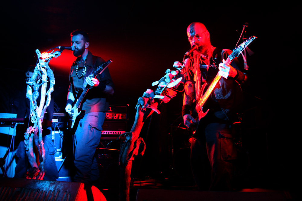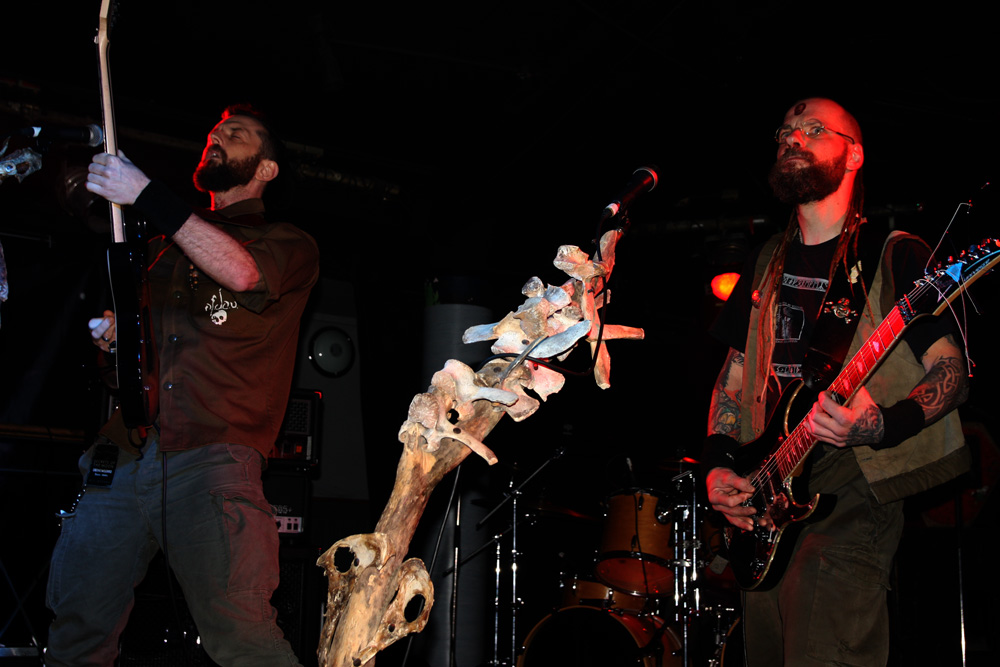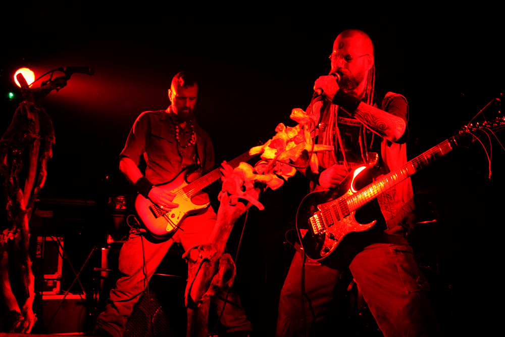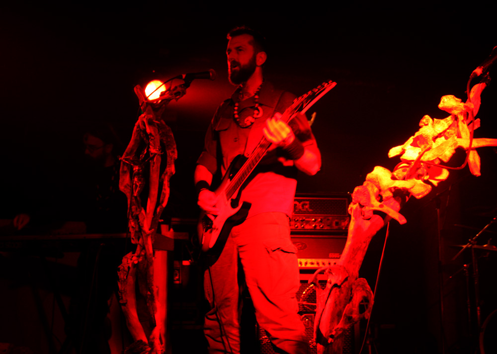 This was one impressive bill that should have had people crawling out the woodwork, into the venue and sniffing the heady scent of incense wafting off the stage. It was still quiet when Austrians Our Survival Depends On Us came on to a clashing of gongs and sounds of running water. We were lucky to get them as a bout of tour bus flu had them resting up and missing one date recently but they seemed in formidable shape tonight. Image wise they are as striking as their sound is eclectic, resembling a bunch of eco warriors and mystic shamans in front of microphone stands hewn out of gnarly branches and bones. Swinging into action with tracks from latest album ‘Scouts on the Borderline Between the Physical and Spiritual World’ everything formed suddenly with a billowing guitar assault, booming bass tones and a swaggering drum beat that cut through the venue like a hot knife through butter. We are told to ‘Keep the home fires burning’ and were more than happy to do so, people drawn to the front of the venue and caught firmly in the band’s grip. There’s a wealth of atmosphere from this genre-bending display and plenty of vocal variation too. A sudden swooning dramatic clamour added to the avant-garde theatricality of it all and at times we coasted along to the other-worldy mesmerising flow before being flung back into life by almighty roars and burgeoning tribal bombast. From dark-folk to protest songs straight out of bygone times, vocal harmonies and weighty musical backbone are enough to have me signing up to their campaign. There’s even stormy flashes of lightning and thunder and OSDOU provided a real deluge to the senses making this a really memorable performance.