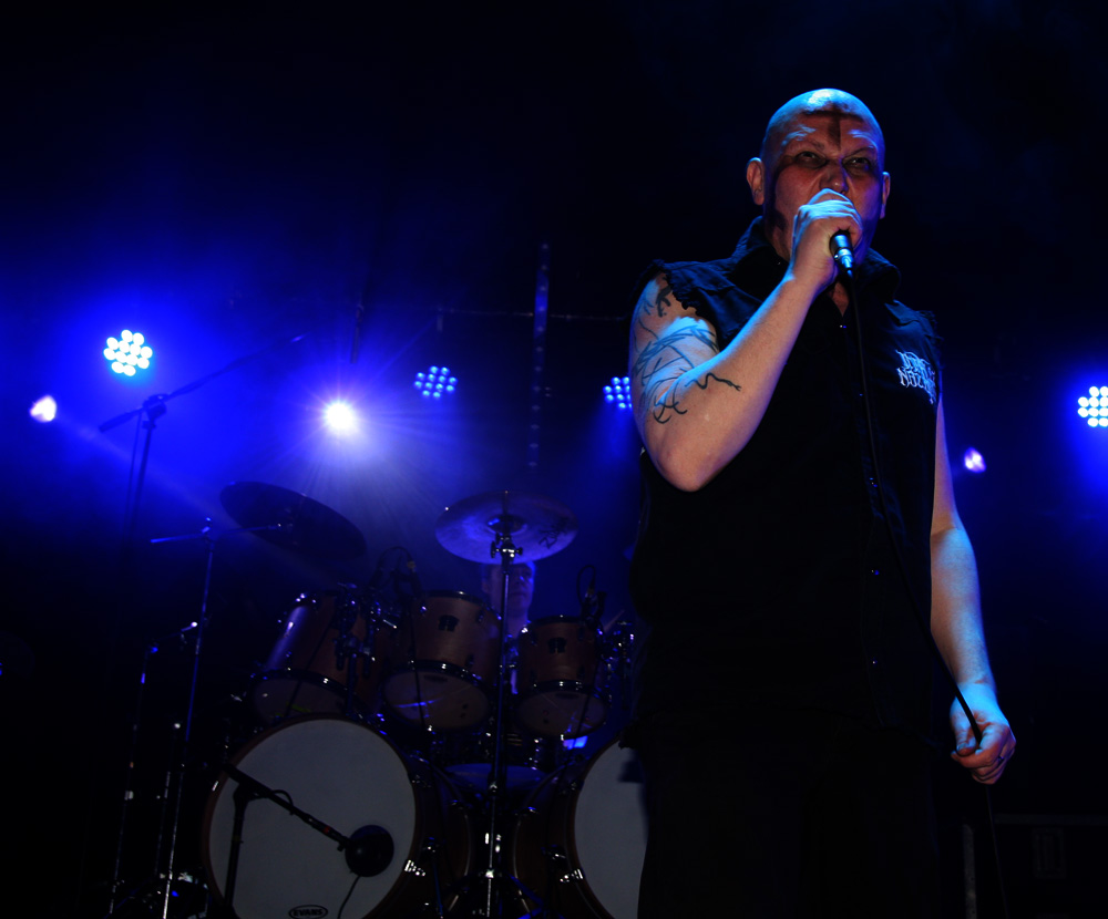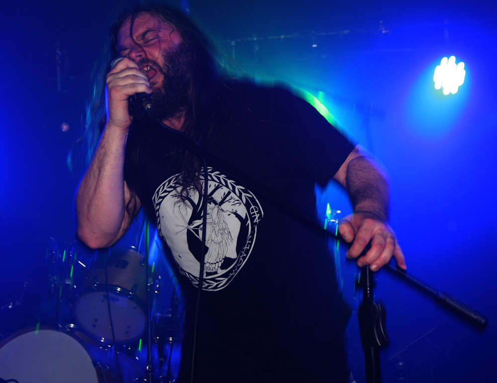 With the excellent new album ‘Rust And Bone’ in my pocket I had certainly been looking forward to hearing some of it live from Mourning Beloveth. Talk about saturating us in doom, gloom and passion the Irish band drop the album’s anchor of ‘Godether’ and start up an engrossing and captivating performance. Luckily they have managed to gain a bit of time on their original set and play through 4 epic numbers tonight. The heartfelt croons lift the spirits and harmonies are absolutely majestic with the sound being spot on here. When the rugged black frenzy of this opening 16 minute track hits it is powerful beyond belief and every bit as impressive as it sounds on album. It’s great to witness right up front and close with a pint in hand and as the players twist, turn and roar within the ever present blue lighting it’s absolutely invigorating. ‘The Mantle Tomb’ sees history flowing through the clean vocals and it’s music that literally enflames the very soul. Darren Moore sits in front of the drums seemingly caught up in the power of the music as much as we are ourselves. There are overpowering moments a plenty, weeping guitar lines good enough to have you sobbing along and so much emotion that I became completely lost within it all. This was one hell of a powerful set and I felt like I needed a lie down or another drink at the end of it; another drink it is then.