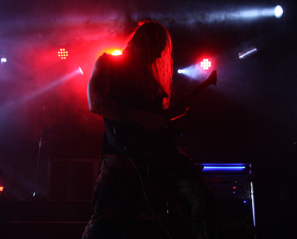 First up and someone always has to kick off proceedings, its Belgian duo Sardonis comprising of drummer Jelle and guitarist Roel. Hitting things hard they create an instant bruising sound with long free-flowing guitars riffs mangled out amidst the drum battery. Instrumental but also somewhat versatile things progress into some rather thrashy Slayer like furrowing that wakes us up and gets heads nodding along in appreciation. The pair jam effortlessly and with cold blue lighting drenching the stage as they rigorously inject lots of groove into the speedier parts of their tracks. The powerful PA delivers a good quaking heft as they co-ordinate and play off each other in style. It’s already busy in the venue and this goes down very well with the first couple of pints of the day.