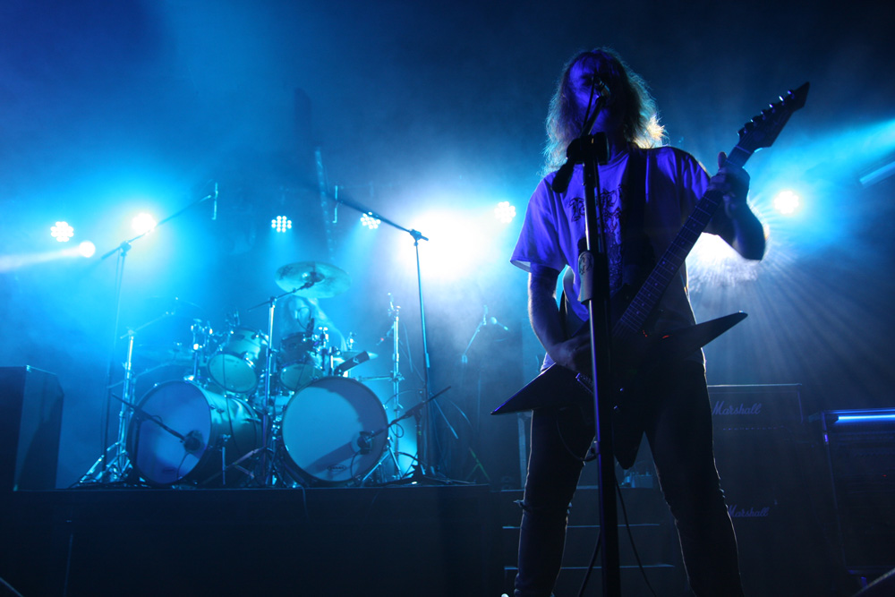 It’s not so much doom but pure savagery for the rest of the night and Danish trio Undergang are next to deliver their brand of crusty death worship. I had seen this lot before at The Unicorn and knew what to expect as they grind in and give us a gnarly and uncouth clobbering. Songs are volatile and abrasive, announcements between them from David Torturdød are hilariously contorted as they are gurgled out, as all the tracks are in their own tongue it’s not like I was going to be able to note and translate them anyway. If you are looking for a primitive racket and many were, you were not going to be disappointed by this but on the whole the audience were not letting themselves go and very few were up for the challenge of going for it down the front. To be honest I found the large stage and big room a bit much for getting into what they were doing, I could imagine it going down a veritable shitstorm in a Christiana squat but here the power I am sure the band are capable of summoning seemed a bit lost. The thick sewer coated vocals sound meaty and maggoty but after a while for me necrosis and rot literally set in and I found my attention wandering. I think a song was dedicated to Jesus but for me that was pretty much it and if there was a resurrection I missed it.