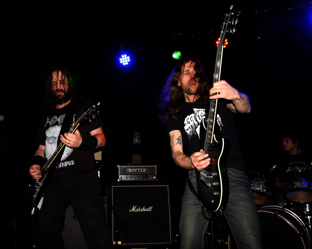 Clashes are nearly totally avoided but with longer set times late in the day they are impossible to totally avoid. I am left with a choice but have already made up my mind that it is only going to be possible to take in half of the Hooded Menace set. The filthy Finns have been witnessed before on this very stage at The Dome and they get to it quickly with lots in the way of gravid gurgling vocals and disembowelling sound. The tight garrotting crawl of Beauty And The Feast’ provides plenty of substance to gorge ourselves on. Band members are lost in hoods, hair and even shades, luckily there is little movement so they don’t go blindly tumbling off the stage but dig in and furrow away building up monolithic grooves and bring it all down in a wall of screaming feedback. ‘The Haunted Ossuary’ picks up the pace a bit the drums tattooing the tick beats into us and vocalist thrusting his arm up in the air in salute at every given opportunity. The audience is well and truly into it and some sickening riffing proves very difficult to walk away from.
