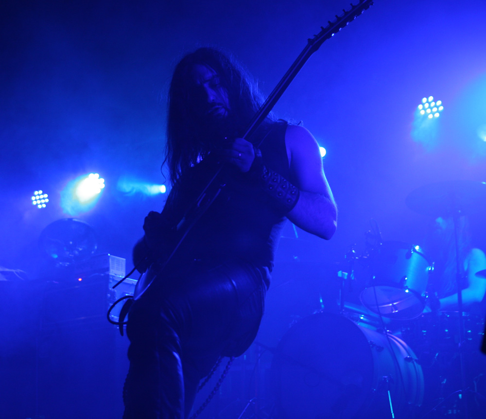 Tangerine Dream flavoured keyboards beckon us down below as Eye Of Solitude immerse in their rugged brand of funeral doom. The vocals growl like a deep sea beast perfect in the cold blue lighting and it feels like we are deep within the ocean’s depths. It’s entrancing from the off and swallows us whole, dark, doomy but glistening and shimmering due to the lush guitar tones. We sway, caught in its grip and there’s little movement anywhere, the band entrenched in position. Some warm glowing lights surround the drum kit casting a bit of relief from the stygian nature of mood and music and sound is massive, the slow beat of the drummer going through the rib cage. Clarity is however crystal clear and we really are getting the most of the experience. Vocals rise and the pace picks up with the beastly massive song finally drawing to a close nearly 18 minutes after it started. So it’s going to be just two numbers here? The second moves toward a segment of atmospheric doom with clean vocals and the band have packed in a wealth of ideas to their allotted leaving us staggering out into the light wondering just what the hell happened there but knowing that this was one hell of a powerful performance.