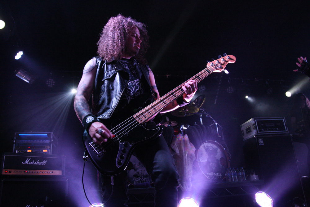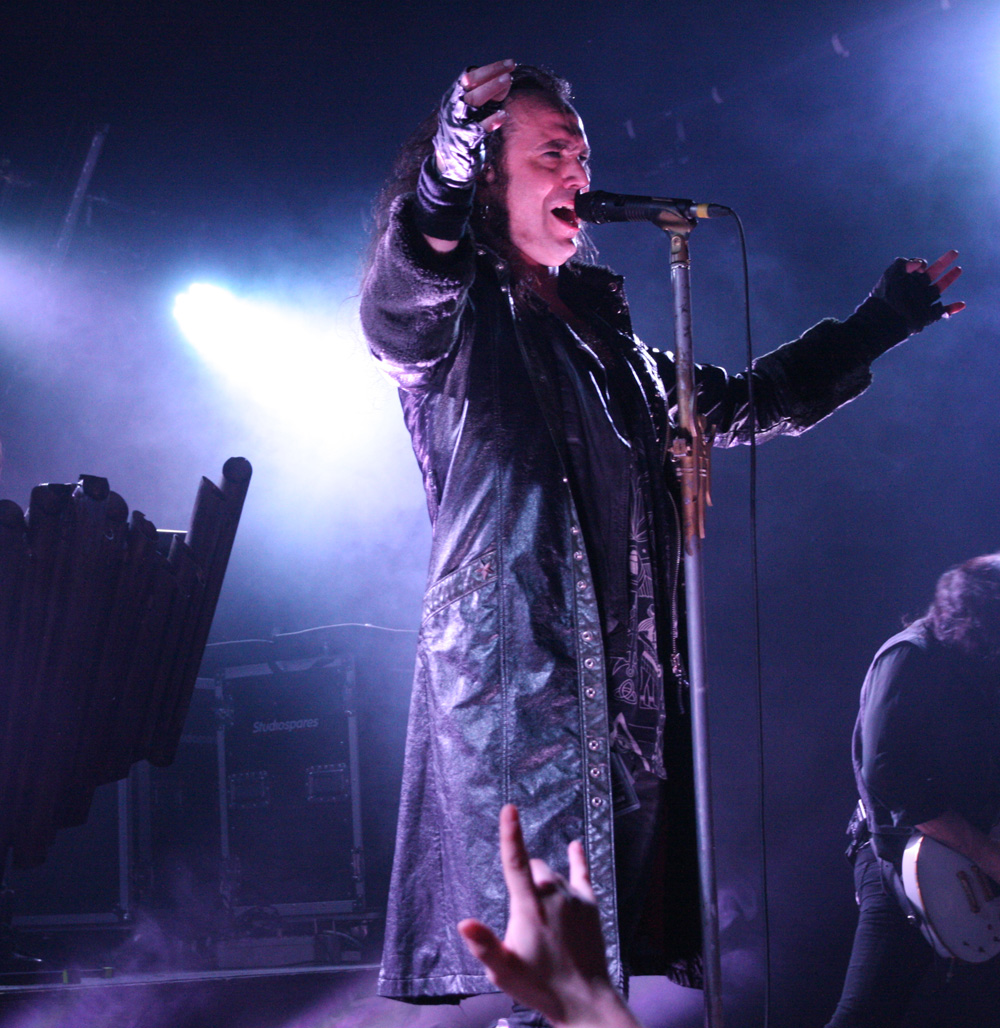 For some stupid reason I kind of expected that the place might empty out a bit but walking into the main hall this couldn’t have been further than the truth. Fists are being pumped, the front is packed and Moonspell are powering away with ‘Breathe’ proving far from Extinct. I guess there were many who had turned up particularly to see them and fans are rewarded by an elaborate stage set up and a more than theatrical display. The keyboard and drum set are decked with pipes are attention grabbing enough but frontman Fernando Ribeiro is very much the centre of things prostrating himself, arms held aloft at the front. As I often find with the band they come across a bit more powerful live than on album and walking in on this, a last burst of energy is more than welcome. The gruff roars of ‘Night Eternal’ sound venomous and potent and standing to the stage left by the speaker Aires Pereira deafens as he plunders away at the bass. The vocalist seems more than happy with the reaction and is in a chatty mood mentioning that he loves the UK and the first time they played here was back in 1995 at The George Robey (RIP) and yes I was there at The Devils Church hosted night