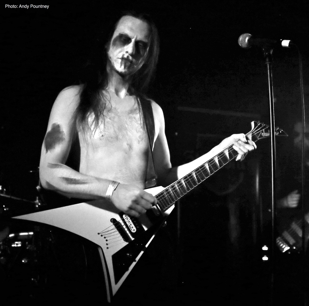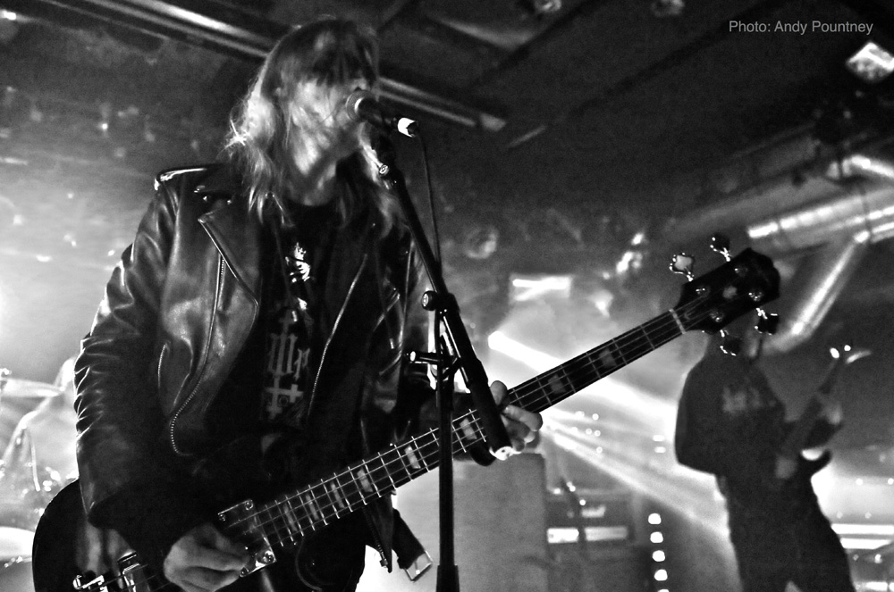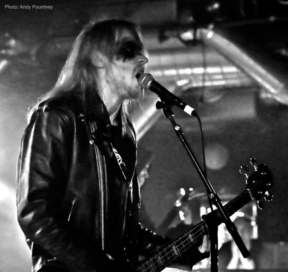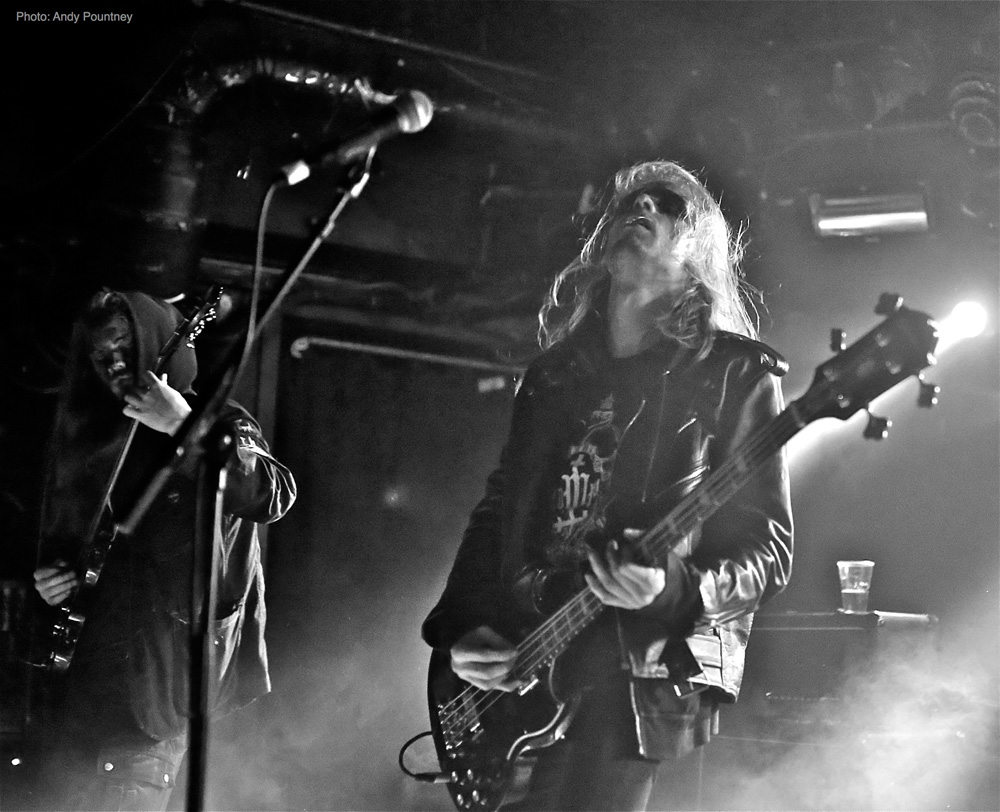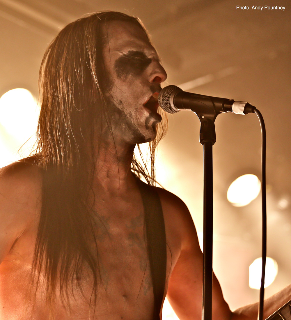 Iceland’s Wormlust were an intriguing proposition, as the face painted band possessed a certain degree of charisma as they opened with a stripped back orthodox black metal tune that unfortunately suffered from a lack of fluidity when flowing from one section to the next. The drum sound had a very artificial feel which was fine and enabled the sound to take on an industrial vibe whether intended or not. It was clear that many in the audience couldn’t handle their approach as they decided to leave, though I stayed as I was curious about them. Utilising a droning repeating riff distortion is nothing new as the first wave of black metal had reams of acts using the style. They stepped dangerously close to tedium at times but when in full flow there was an exuding gelatinous perniciousness about their music that I enjoyed especially with the percussive aspects which afforded their songs a layer of dexterity that worked extremely well. However I suspect I was in a minority enjoying this performance as people left the room like rats in sinking ship but I drowned in the bands minimalistic malevolence.