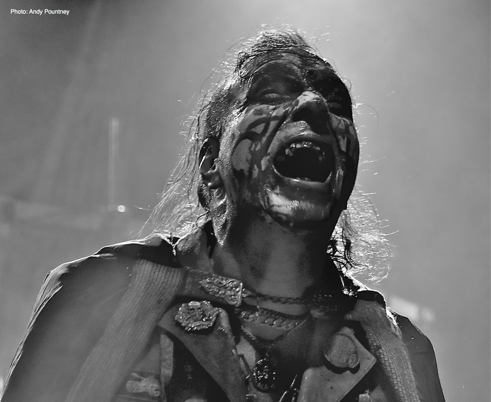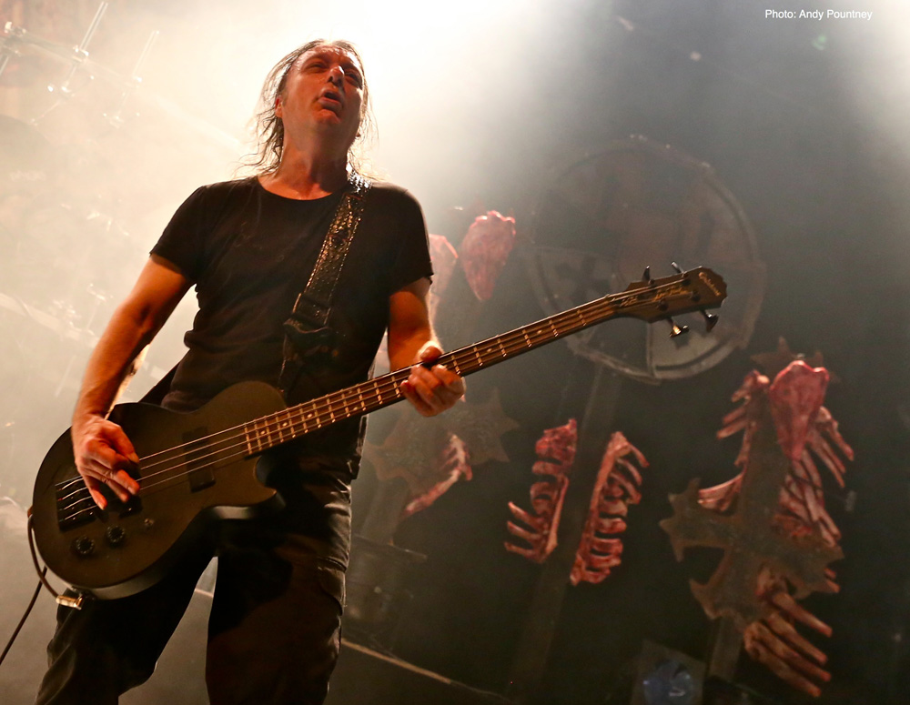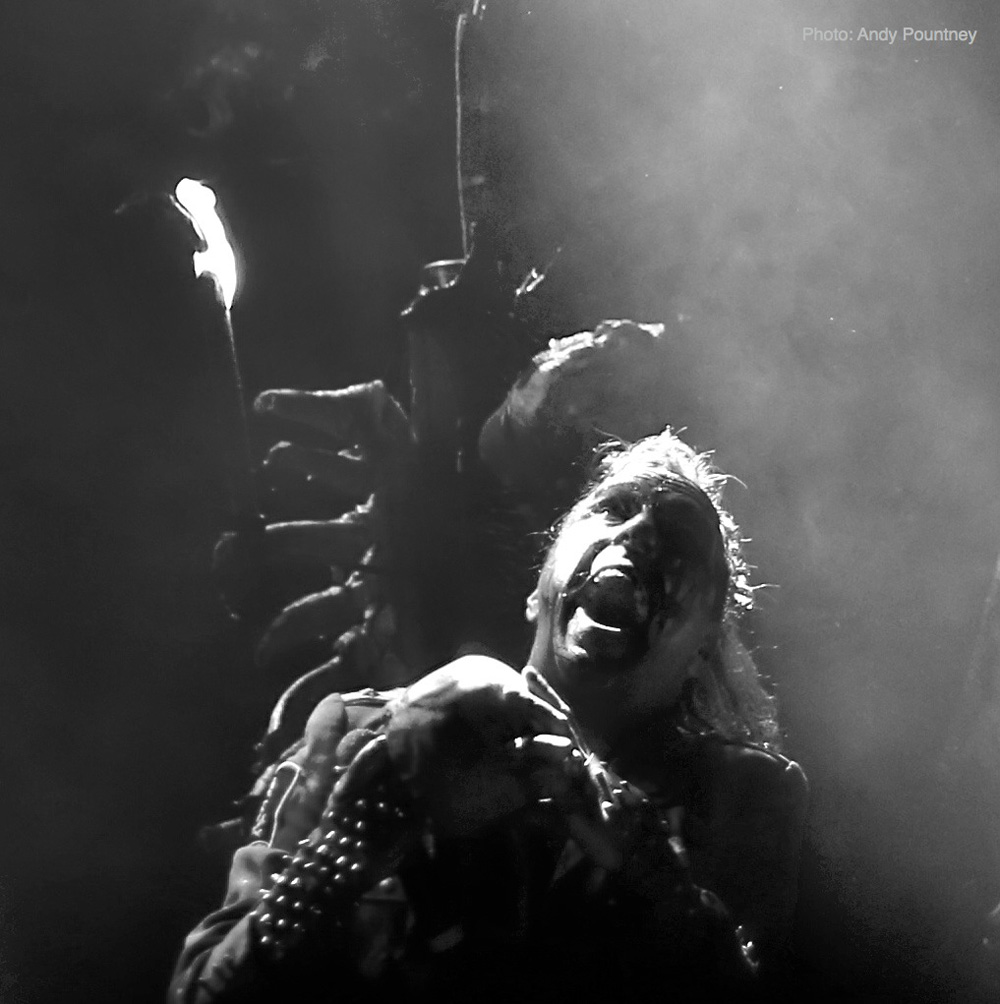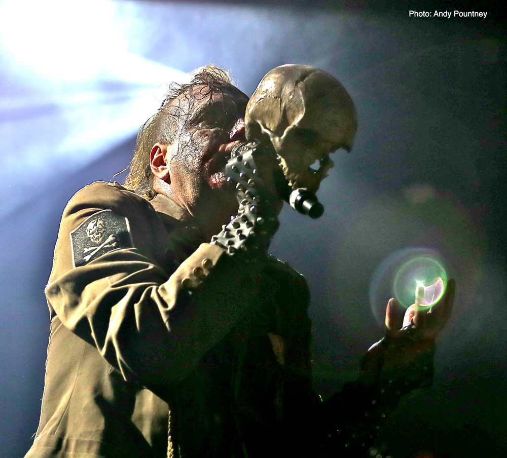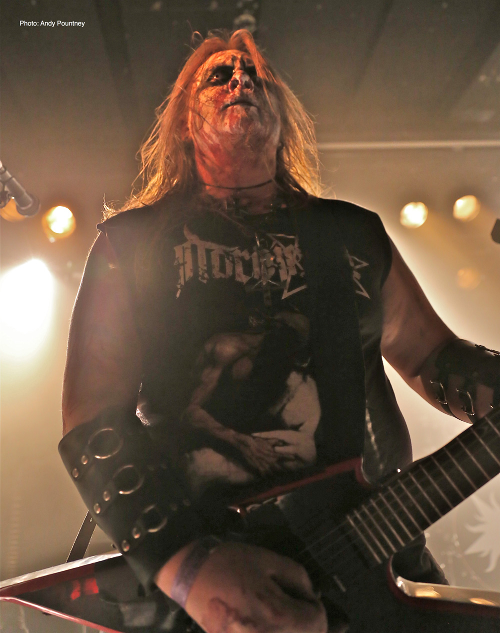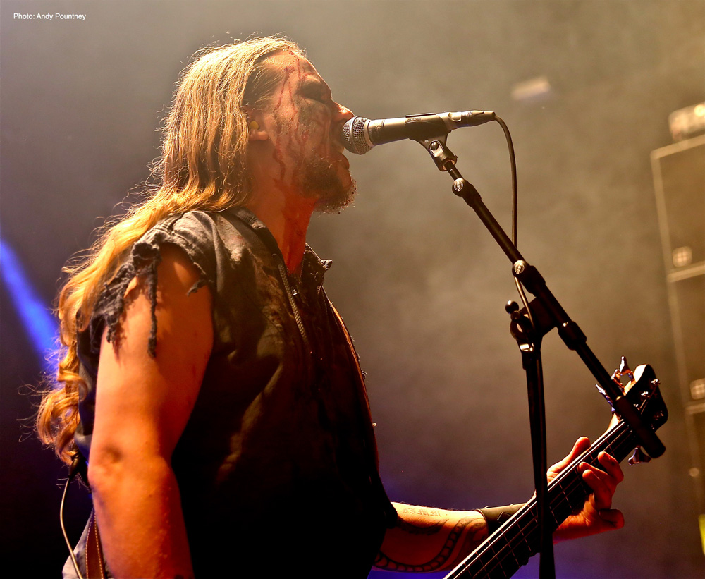 On arrival on the left I overheard the security guy explaining the strategy for the photo pass holders of one song then out but could continually take photos of the band for the whole set which inevitably created some tension in the crowd. This was completely due to having the photographers come back to the same queue and really should have been organised better by having them queue in a different place (stage right I’d suggest) affording easy access to the photo pit instead of constantly having to jostle past people much to theirs, mine and others in the crowds annoyance as we watched the band.  Not really an anniversary show as such since the release of the “Pure Fucking Armageddon” demo in 1986 this was indeed to be a special show involving members from various eras of the bands infamous history. The darkening of the stage led into a spoken vocal piece of the first part of “A Bloodsword And A Colder Sun (Part I of II)”as a slow drum beat filtered through the PA with bright searching spotlights passing over the crowd before launching rather pedestrian like into “A Bloodsword And A Colder Sun (Part II of II)” with Maniac on vocals. The slow pulsing pace of the tune felt like an intro piece as my gaze wandered away from the band to the rancid stage effects utilising the dismembered carcasses of what I suspect were pigs. There was a rumour that 400kg of bones and I suspect animal body parts were to be included in the set which disgusted me completely and if I’d not been reviewing I’d have walked out. Biased or not I thought Maniac looked like a pantomime villain with his strip of hair in the middle and Batman and Robin like eye makeup as the band went into “Crystallized Pain In Deconstruction” and he stalked the stage as menacingly as he could to decent effect.  The first portion of the show was given to Maniac as the band shifted into “To Daimonium” and “View From Nihil”.