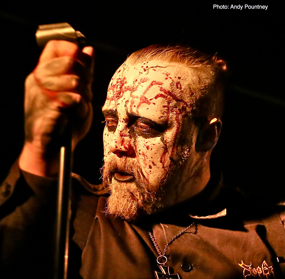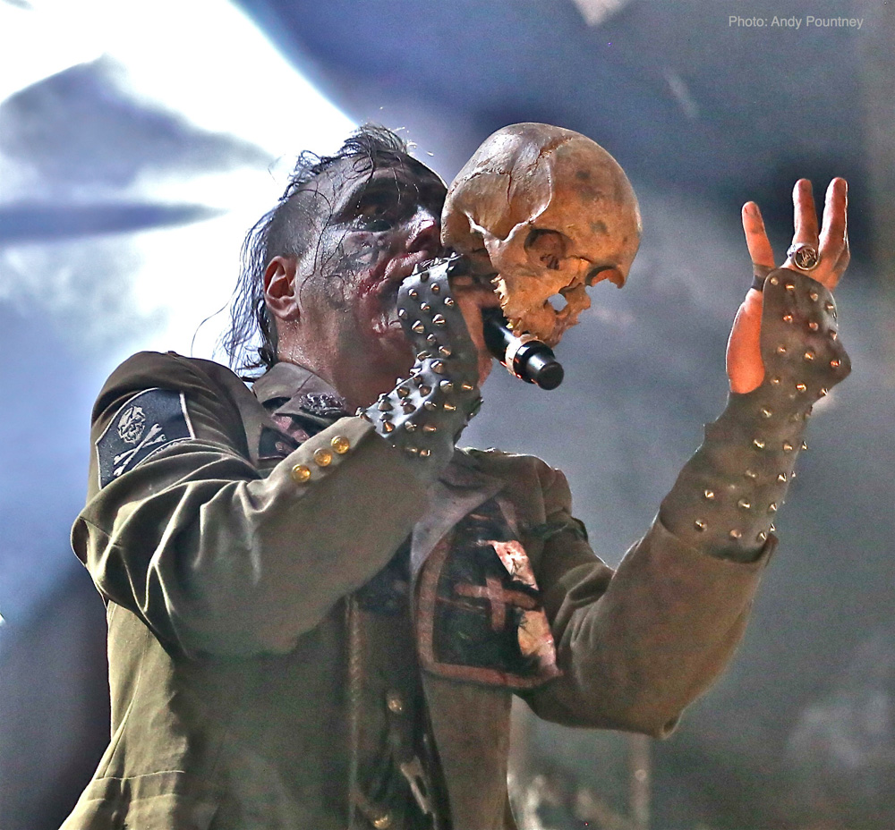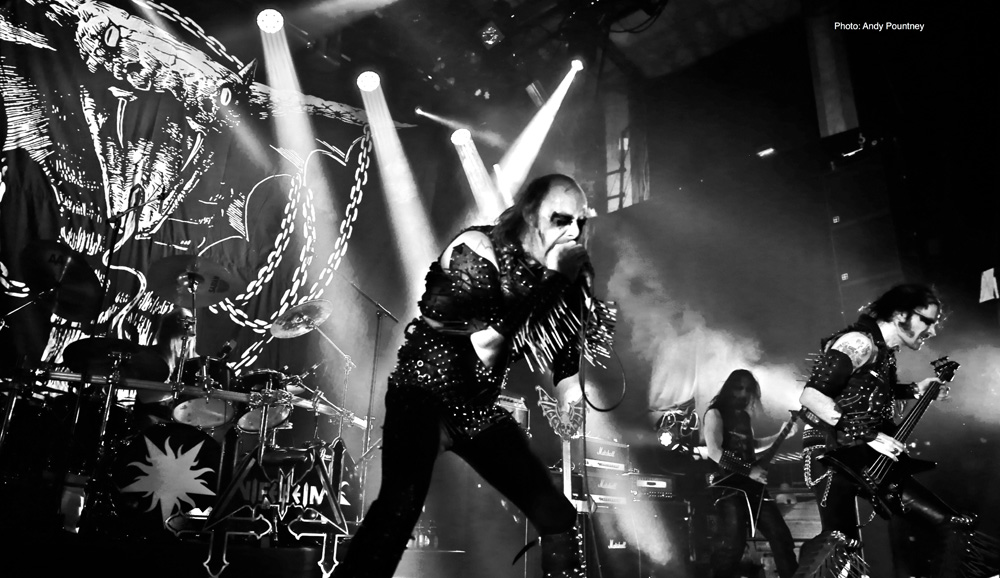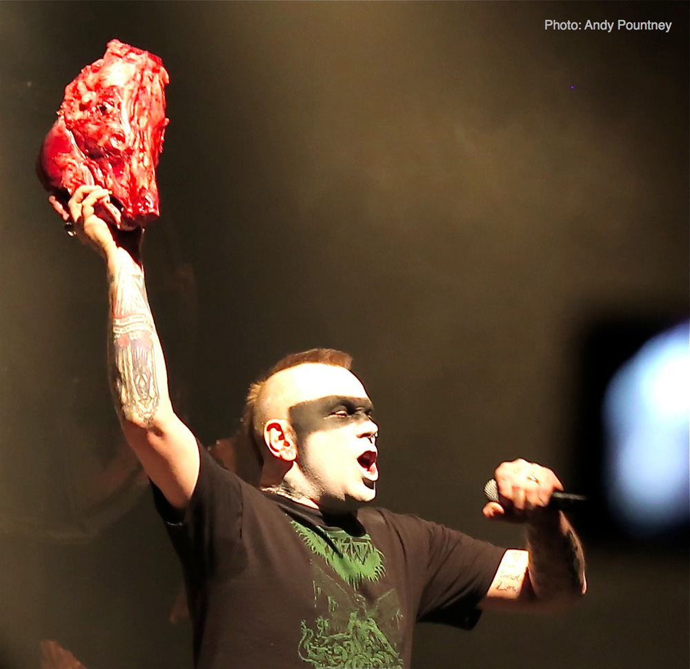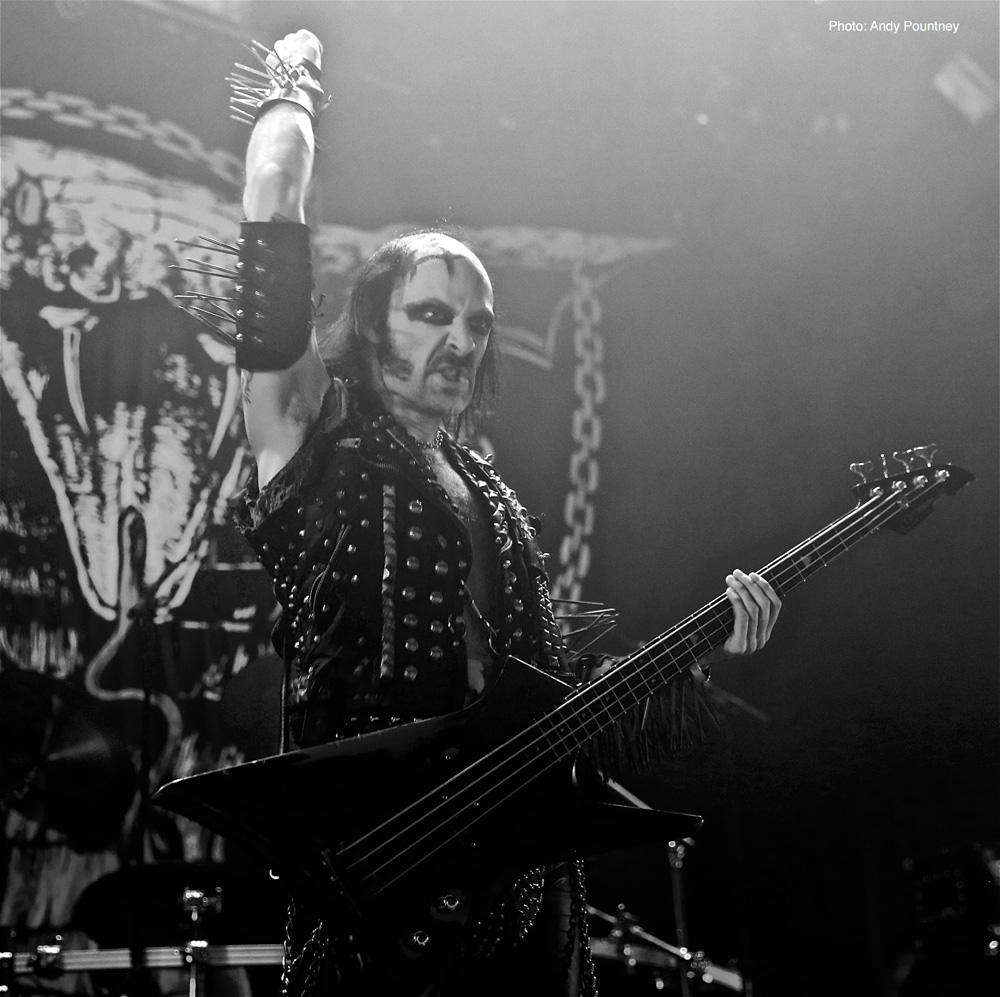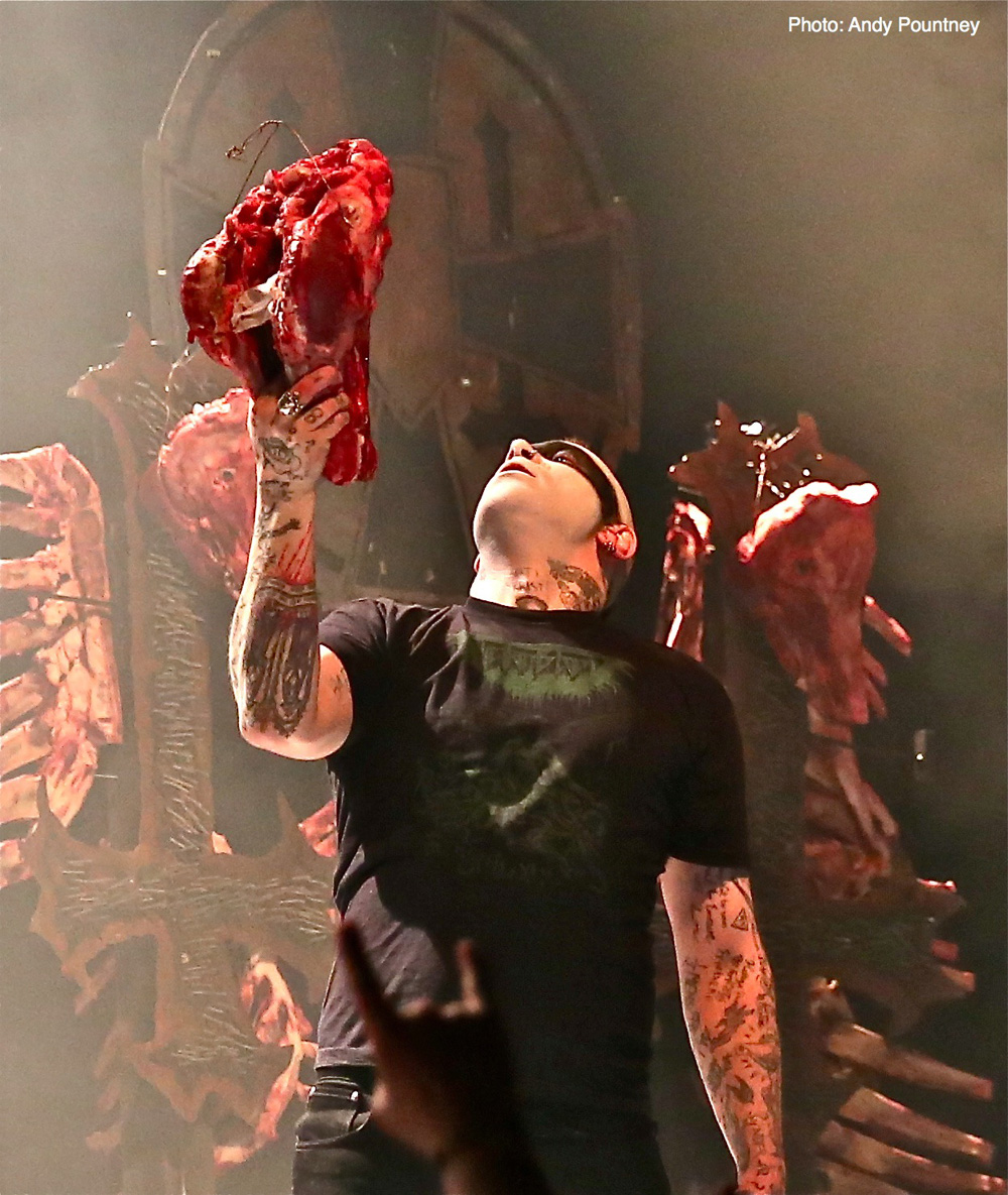 On arrival on the left I overheard the security guy explaining the strategy for the photo pass holders of one song then out but could continually take photos of the band for the whole set which inevitably created some tension in the crowd. This was completely due to having the photographers come back to the same queue and really should have been organised better by having them queue in a different place (stage right I’d suggest) affording easy access to the photo pit instead of constantly having to jostle past people much to theirs, mine and others in the crowds annoyance as we watched the band.  Not really an anniversary show as such since the release of the “Pure Fucking Armageddon” demo in 1986 this was indeed to be a special show involving members from various eras of the bands infamous history. The darkening of the stage led into a spoken vocal piece of the first part of “A Bloodsword And A Colder Sun (Part I of II)”as a slow drum beat filtered through the PA with bright searching spotlights passing over the crowd before launching rather pedestrian like into “A Bloodsword And A Colder Sun (Part II of II)” with Maniac on vocals. The slow pulsing pace of the tune felt like an intro piece as my gaze wandered away from the band to the rancid stage effects utilising the dismembered carcasses of what I suspect were pigs. There was a rumour that 400kg of bones and I suspect animal body parts were to be included in the set which disgusted me completely and if I’d not been reviewing I’d have walked out. Biased or not I thought Maniac looked like a pantomime villain with his strip of hair in the middle and Batman and Robin like eye makeup as the band went into “Crystallized Pain In Deconstruction” and he stalked the stage as menacingly as he could to decent effect.  The first portion of the show was given to Maniac as the band shifted into “To Daimonium” and “View From Nihil”.