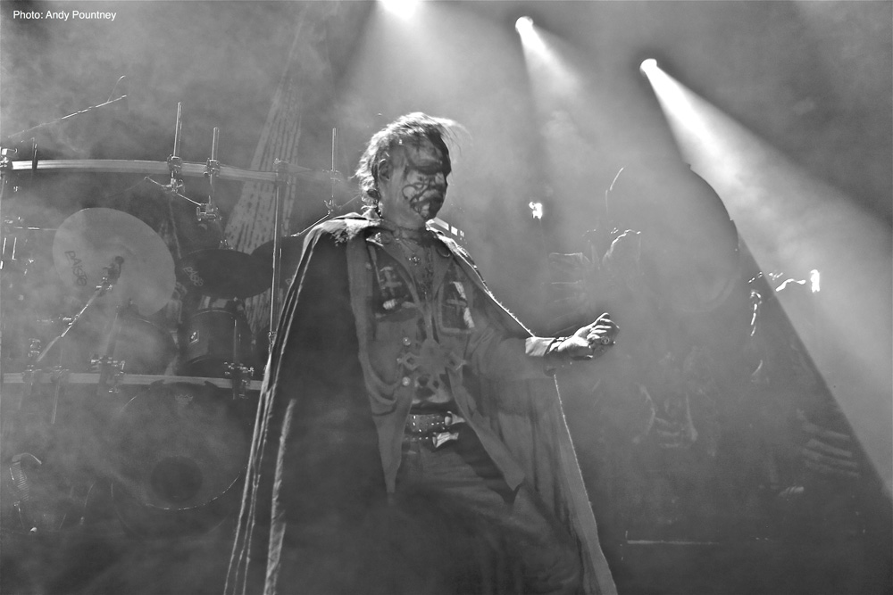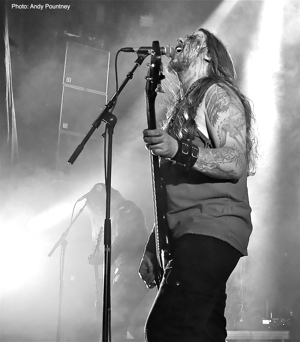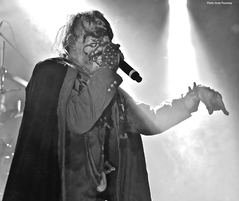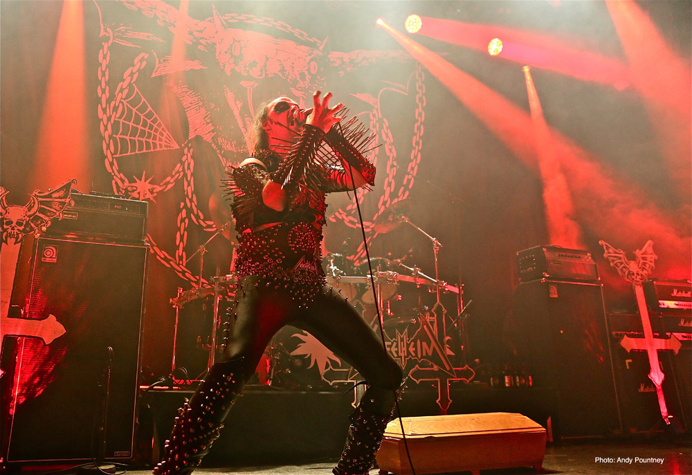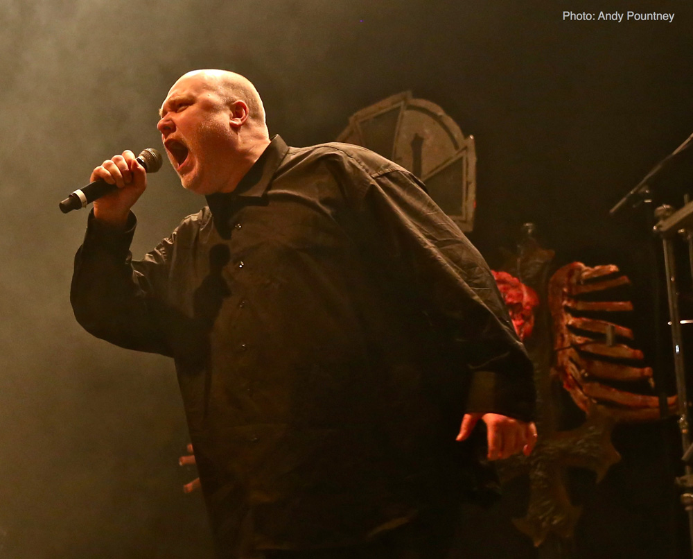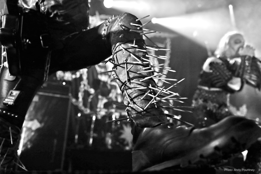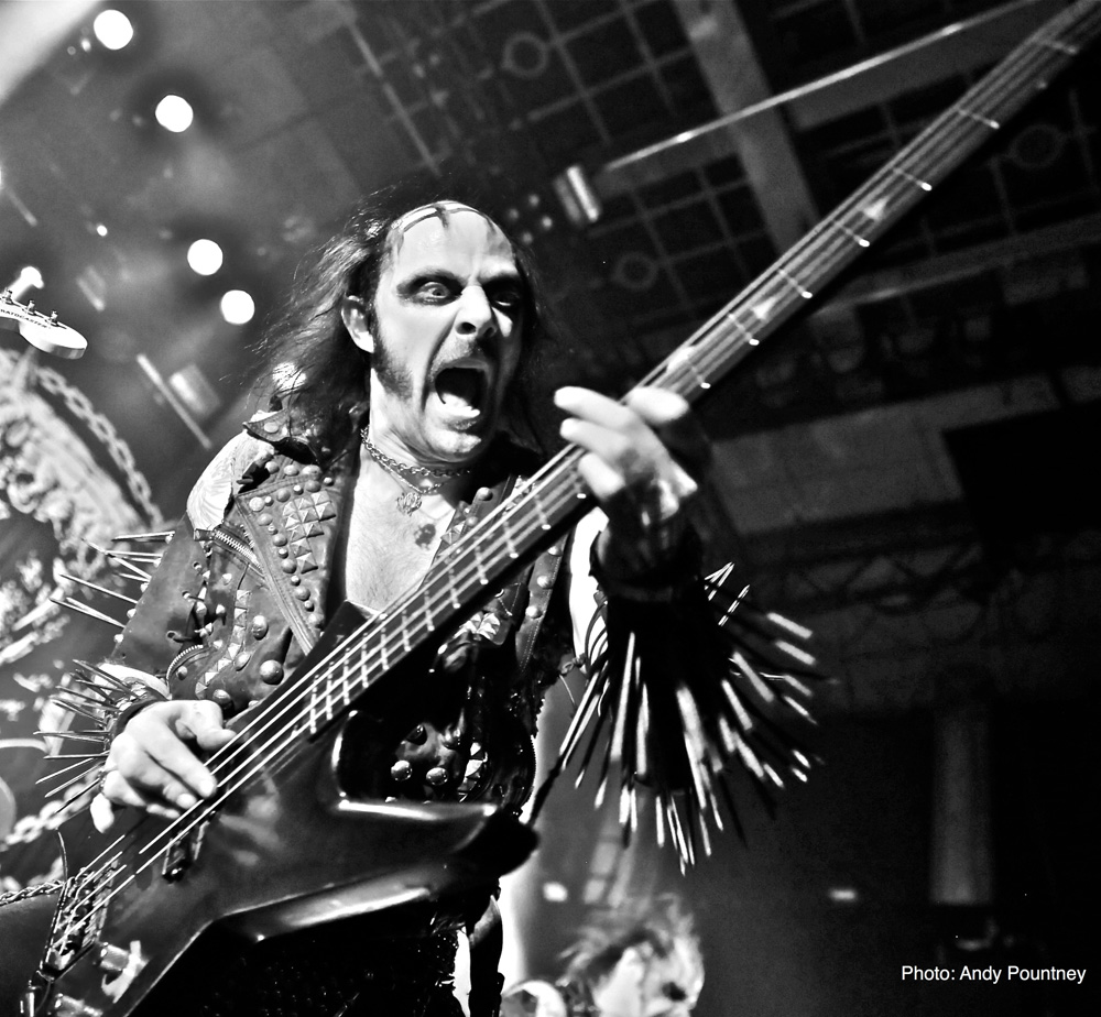 On arrival on the left I overheard the security guy explaining the strategy for the photo pass holders of one song then out but could continually take photos of the band for the whole set which inevitably created some tension in the crowd. This was completely due to having the photographers come back to the same queue and really should have been organised better by having them queue in a different place (stage right I’d suggest) affording easy access to the photo pit instead of constantly having to jostle past people much to theirs, mine and others in the crowds annoyance as we watched the band.  Not really an anniversary show as such since the release of the “Pure Fucking Armageddon” demo in 1986 this was indeed to be a special show involving members from various eras of the bands infamous history. The darkening of the stage led into a spoken vocal piece of the first part of “A Bloodsword And A Colder Sun (Part I of II)”as a slow drum beat filtered through the PA with bright searching spotlights passing over the crowd before launching rather pedestrian like into “A Bloodsword And A Colder Sun (Part II of II)” with Maniac on vocals. The slow pulsing pace of the tune felt like an intro piece as my gaze wandered away from the band to the rancid stage effects utilising the dismembered carcasses of what I suspect were pigs. There was a rumour that 400kg of bones and I suspect animal body parts were to be included in the set which disgusted me completely and if I’d not been reviewing I’d have walked out. Biased or not I thought Maniac looked like a pantomime villain with his strip of hair in the middle and Batman and Robin like eye makeup as the band went into “Crystallized Pain In Deconstruction” and he stalked the stage as menacingly as he could to decent effect.  The first portion of the show was given to Maniac as the band shifted into “To Daimonium” and “View From Nihil”.