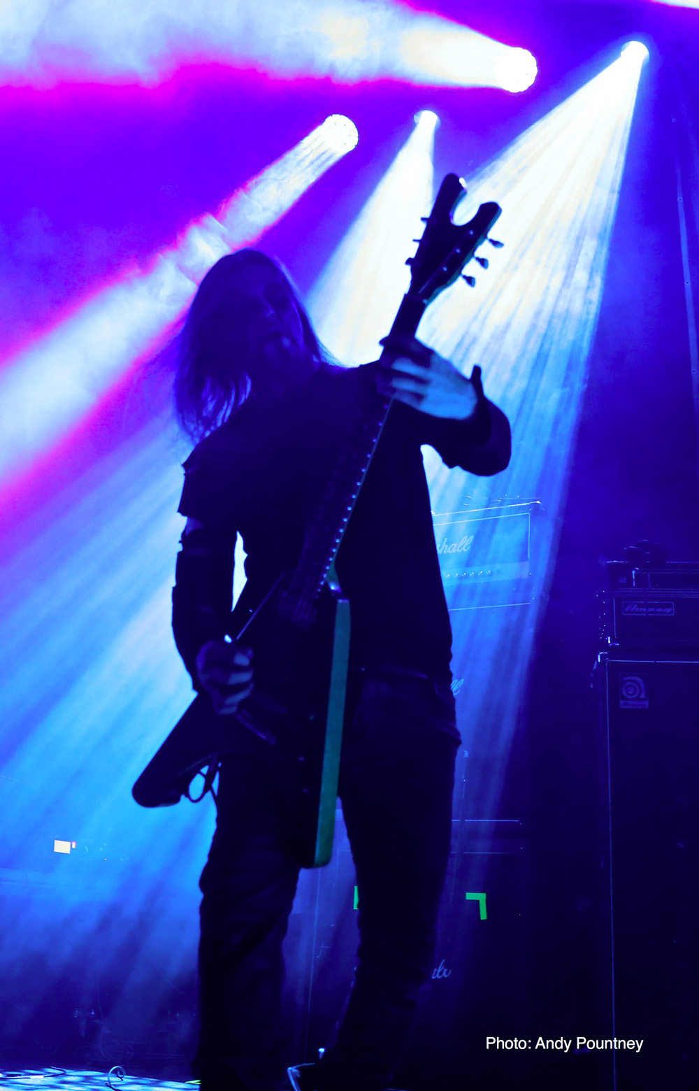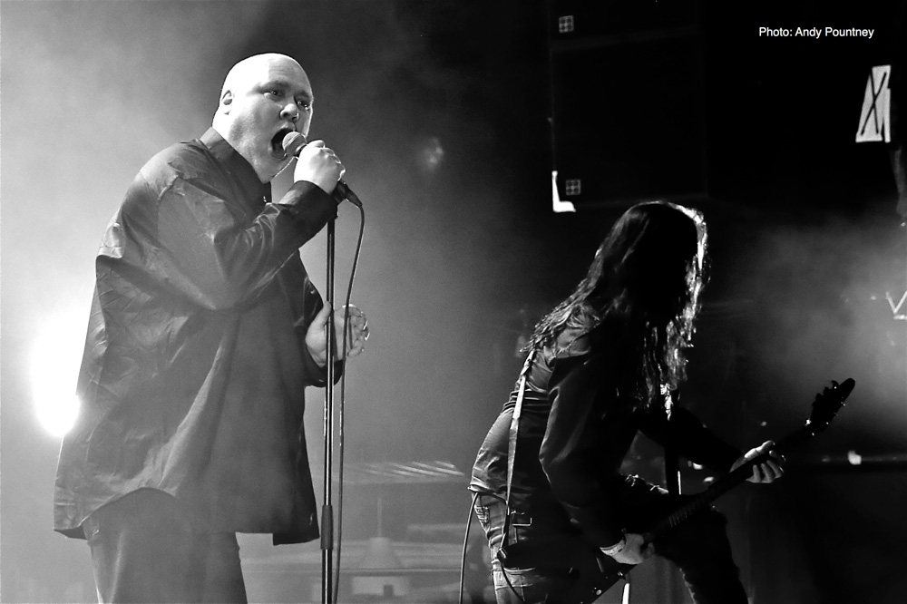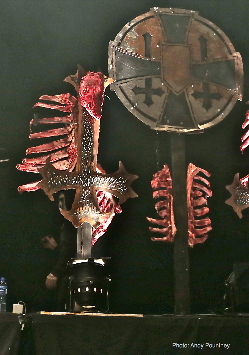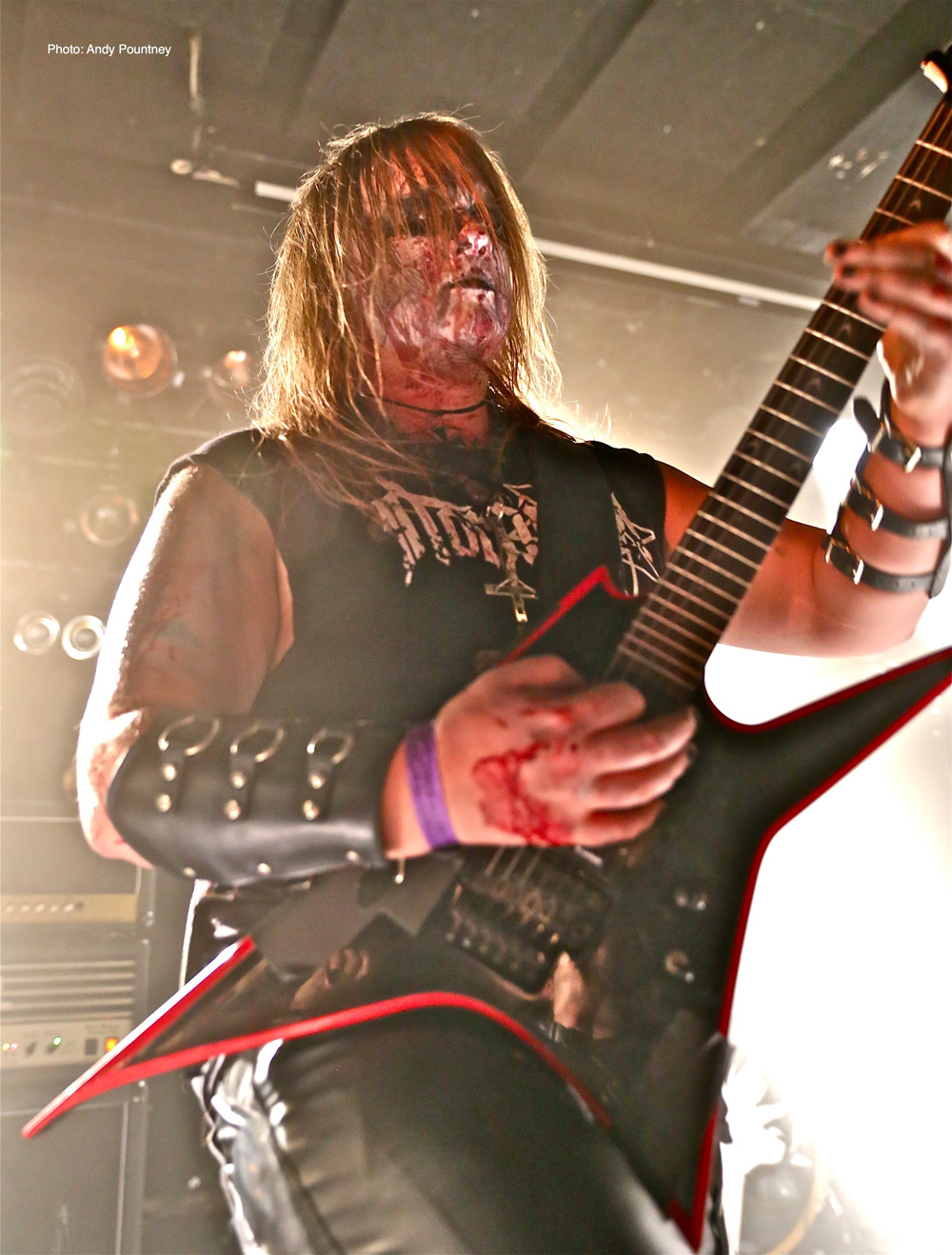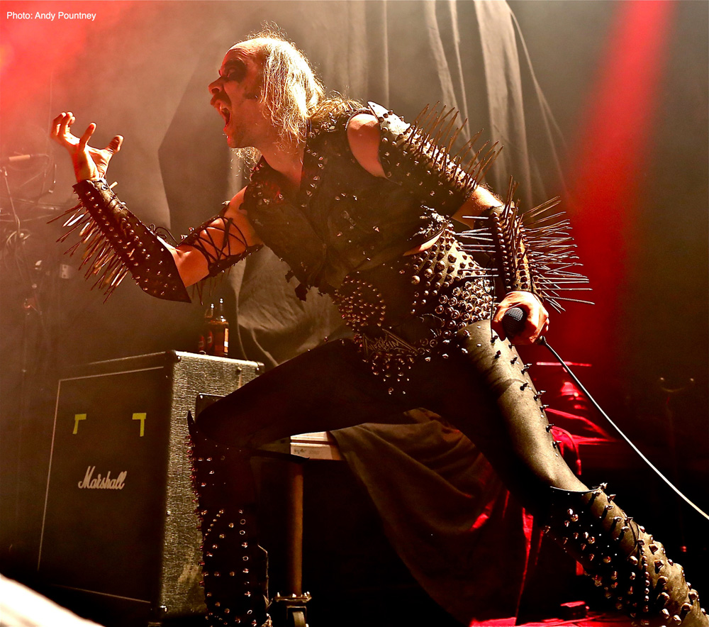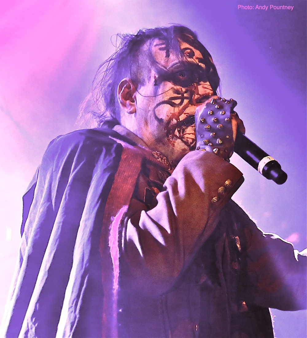 On arrival on the left I overheard the security guy explaining the strategy for the photo pass holders of one song then out but could continually take photos of the band for the whole set which inevitably created some tension in the crowd. This was completely due to having the photographers come back to the same queue and really should have been organised better by having them queue in a different place (stage right I’d suggest) affording easy access to the photo pit instead of constantly having to jostle past people much to theirs, mine and others in the crowds annoyance as we watched the band.  Not really an anniversary show as such since the release of the “Pure Fucking Armageddon” demo in 1986 this was indeed to be a special show involving members from various eras of the bands infamous history. The darkening of the stage led into a spoken vocal piece of the first part of “A Bloodsword And A Colder Sun (Part I of II)”as a slow drum beat filtered through the PA with bright searching spotlights passing over the crowd before launching rather pedestrian like into “A Bloodsword And A Colder Sun (Part II of II)” with Maniac on vocals. The slow pulsing pace of the tune felt like an intro piece as my gaze wandered away from the band to the rancid stage effects utilising the dismembered carcasses of what I suspect were pigs. There was a rumour that 400kg of bones and I suspect animal body parts were to be included in the set which disgusted me completely and if I’d not been reviewing I’d have walked out. Biased or not I thought Maniac looked like a pantomime villain with his strip of hair in the middle and Batman and Robin like eye makeup as the band went into “Crystallized Pain In Deconstruction” and he stalked the stage as menacingly as he could to decent effect.  The first portion of the show was given to Maniac as the band shifted into “To Daimonium” and “View From Nihil”.