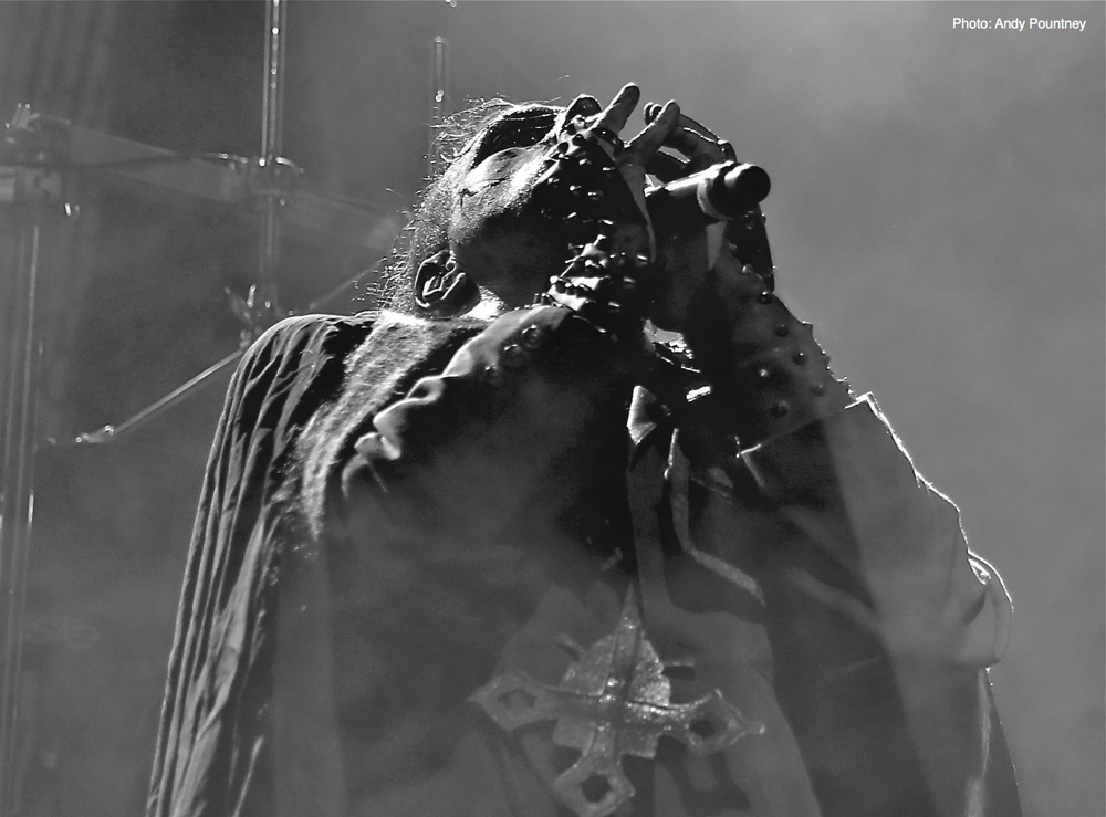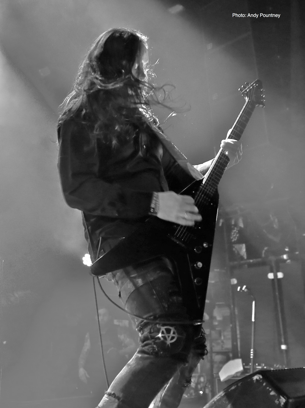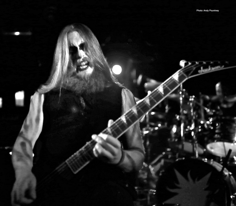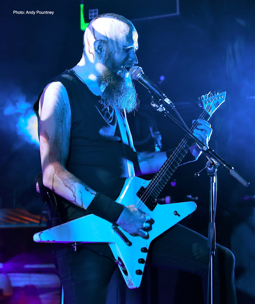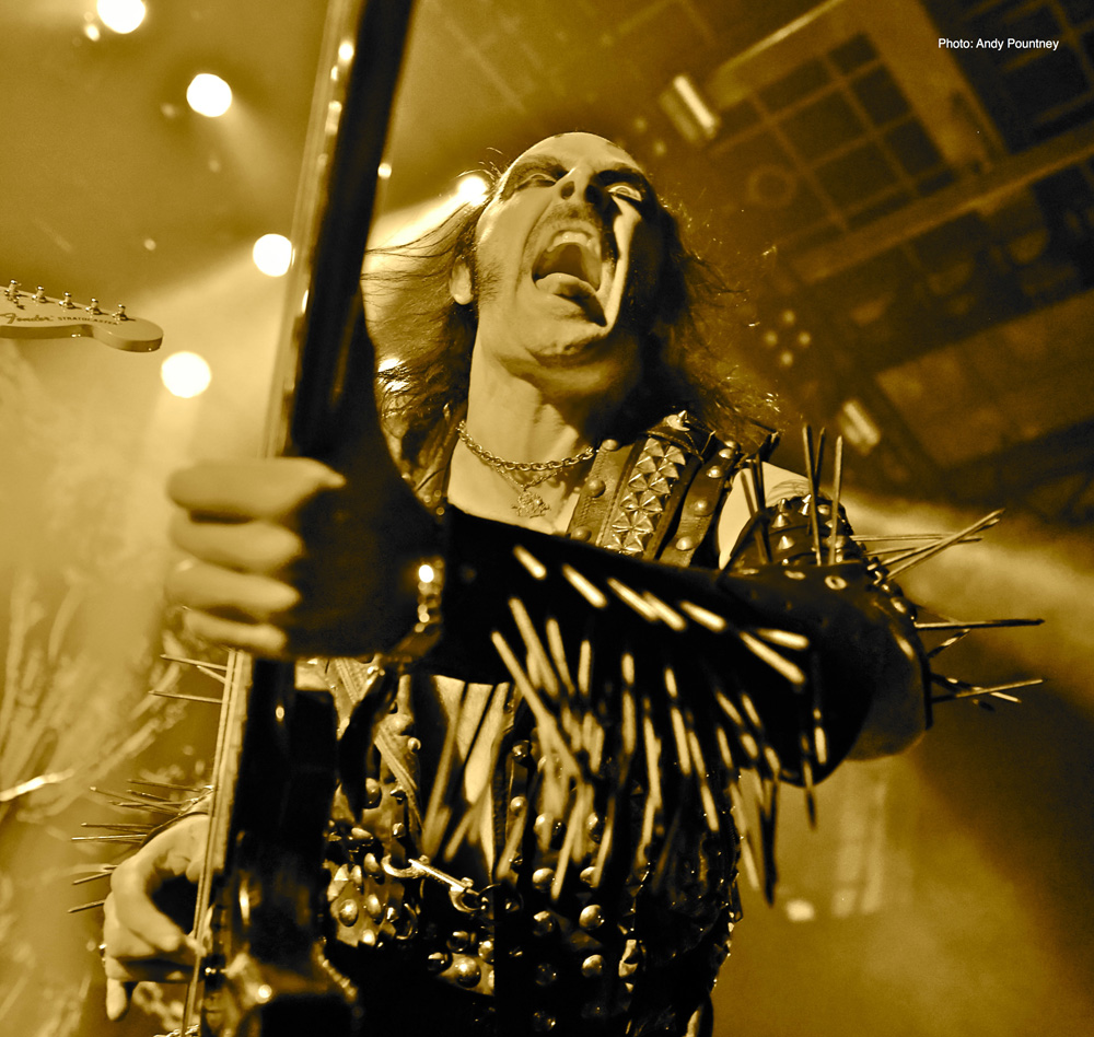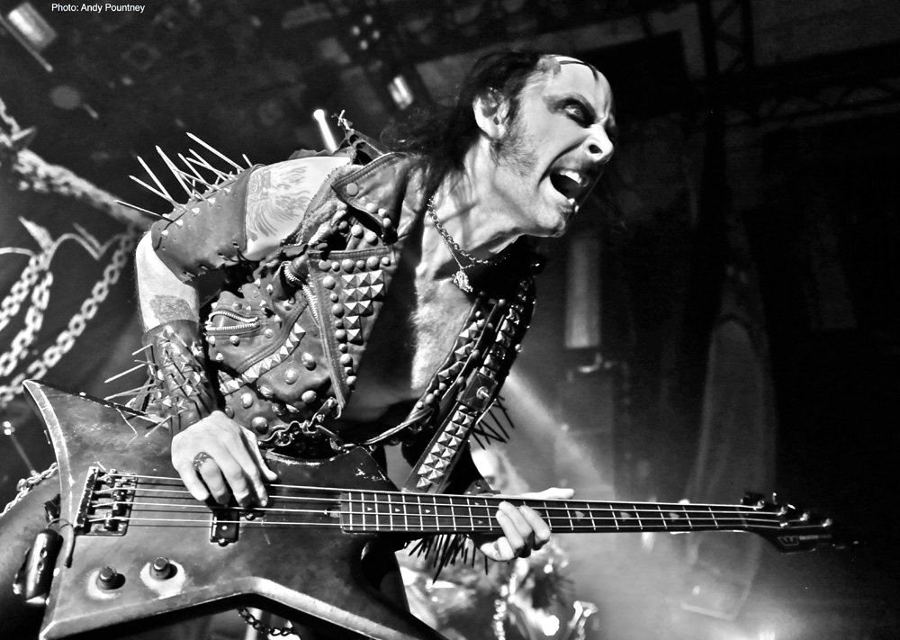 On arrival on the left I overheard the security guy explaining the strategy for the photo pass holders of one song then out but could continually take photos of the band for the whole set which inevitably created some tension in the crowd. This was completely due to having the photographers come back to the same queue and really should have been organised better by having them queue in a different place (stage right I’d suggest) affording easy access to the photo pit instead of constantly having to jostle past people much to theirs, mine and others in the crowds annoyance as we watched the band.  Not really an anniversary show as such since the release of the “Pure Fucking Armageddon” demo in 1986 this was indeed to be a special show involving members from various eras of the bands infamous history. The darkening of the stage led into a spoken vocal piece of the first part of “A Bloodsword And A Colder Sun (Part I of II)”as a slow drum beat filtered through the PA with bright searching spotlights passing over the crowd before launching rather pedestrian like into “A Bloodsword And A Colder Sun (Part II of II)” with Maniac on vocals. The slow pulsing pace of the tune felt like an intro piece as my gaze wandered away from the band to the rancid stage effects utilising the dismembered carcasses of what I suspect were pigs. There was a rumour that 400kg of bones and I suspect animal body parts were to be included in the set which disgusted me completely and if I’d not been reviewing I’d have walked out. Biased or not I thought Maniac looked like a pantomime villain with his strip of hair in the middle and Batman and Robin like eye makeup as the band went into “Crystallized Pain In Deconstruction” and he stalked the stage as menacingly as he could to decent effect.  The first portion of the show was given to Maniac as the band shifted into “To Daimonium” and “View From Nihil”.