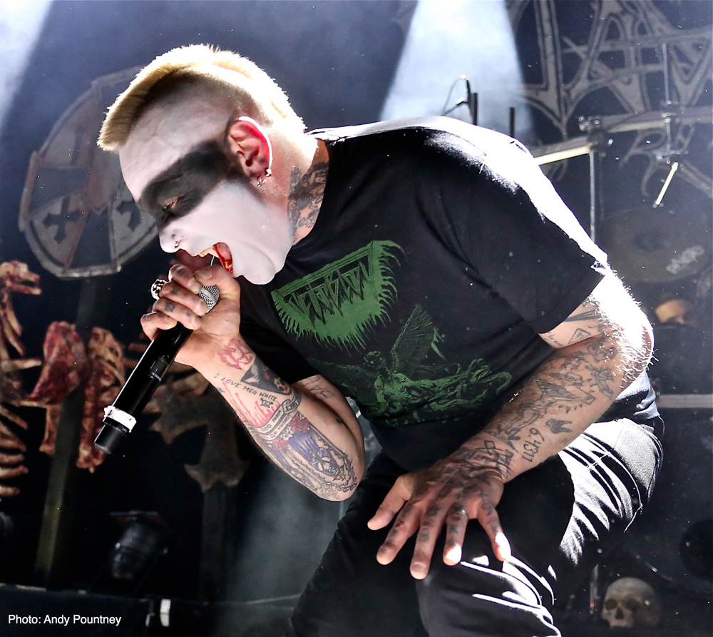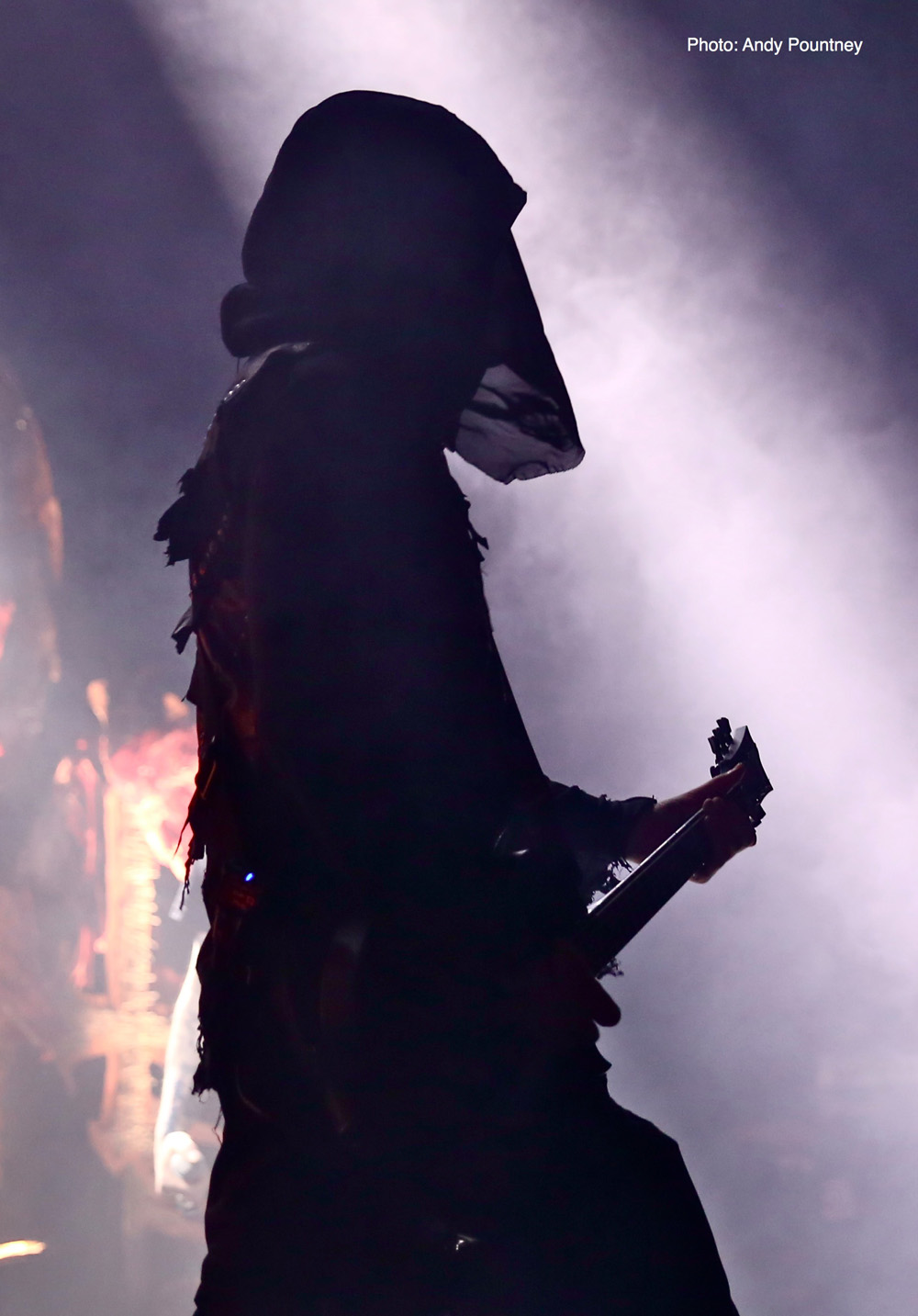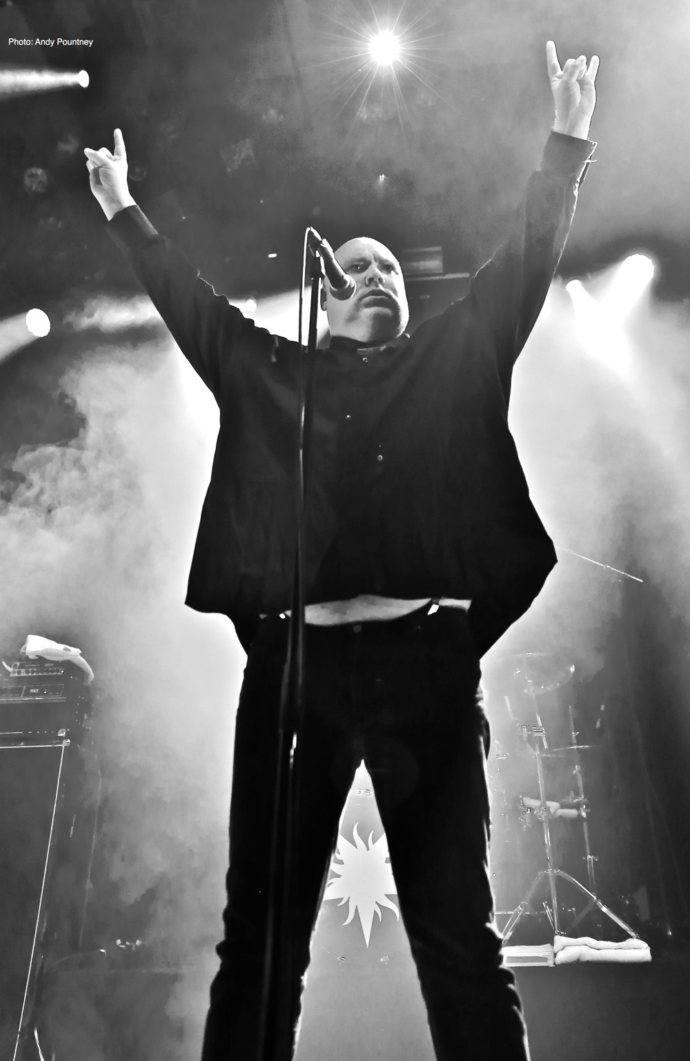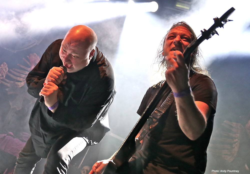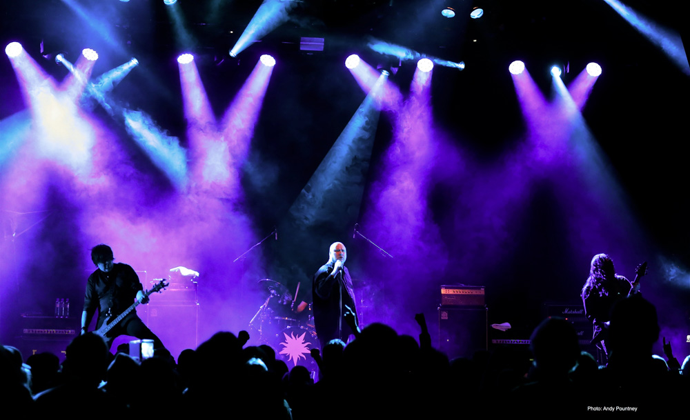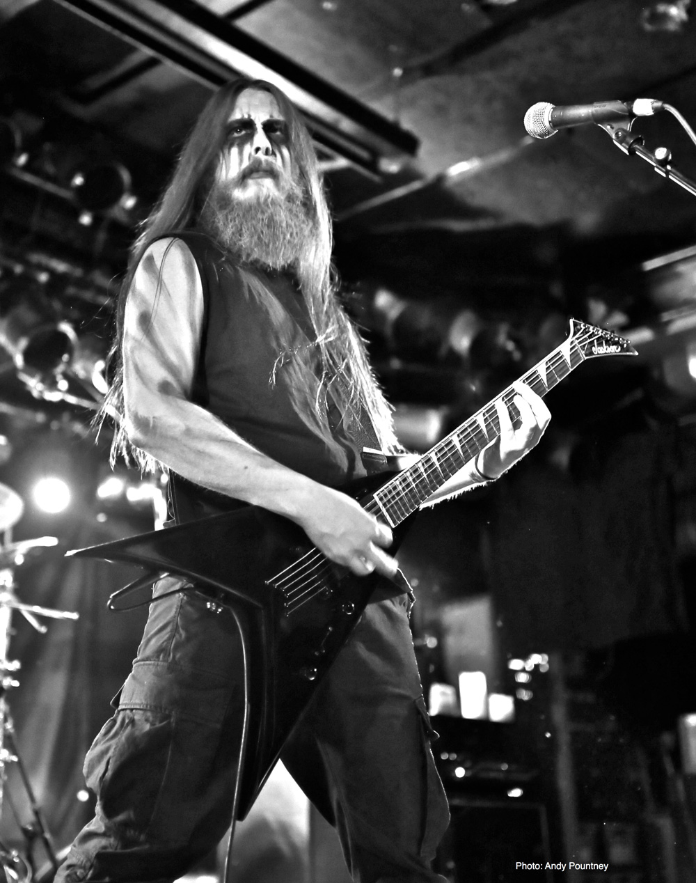 On arrival on the left I overheard the security guy explaining the strategy for the photo pass holders of one song then out but could continually take photos of the band for the whole set which inevitably created some tension in the crowd. This was completely due to having the photographers come back to the same queue and really should have been organised better by having them queue in a different place (stage right I’d suggest) affording easy access to the photo pit instead of constantly having to jostle past people much to theirs, mine and others in the crowds annoyance as we watched the band.  Not really an anniversary show as such since the release of the “Pure Fucking Armageddon” demo in 1986 this was indeed to be a special show involving members from various eras of the bands infamous history. The darkening of the stage led into a spoken vocal piece of the first part of “A Bloodsword And A Colder Sun (Part I of II)”as a slow drum beat filtered through the PA with bright searching spotlights passing over the crowd before launching rather pedestrian like into “A Bloodsword And A Colder Sun (Part II of II)” with Maniac on vocals. The slow pulsing pace of the tune felt like an intro piece as my gaze wandered away from the band to the rancid stage effects utilising the dismembered carcasses of what I suspect were pigs. There was a rumour that 400kg of bones and I suspect animal body parts were to be included in the set which disgusted me completely and if I’d not been reviewing I’d have walked out. Biased or not I thought Maniac looked like a pantomime villain with his strip of hair in the middle and Batman and Robin like eye makeup as the band went into “Crystallized Pain In Deconstruction” and he stalked the stage as menacingly as he could to decent effect.  The first portion of the show was given to Maniac as the band shifted into “To Daimonium” and “View From Nihil”.