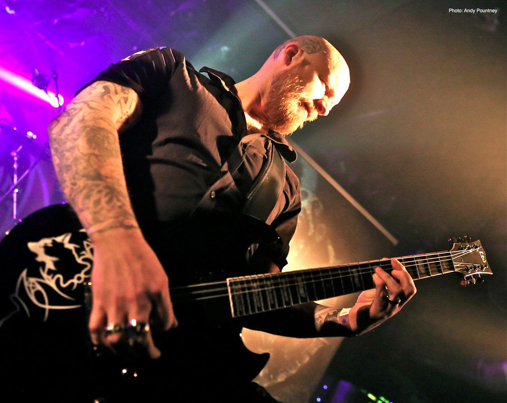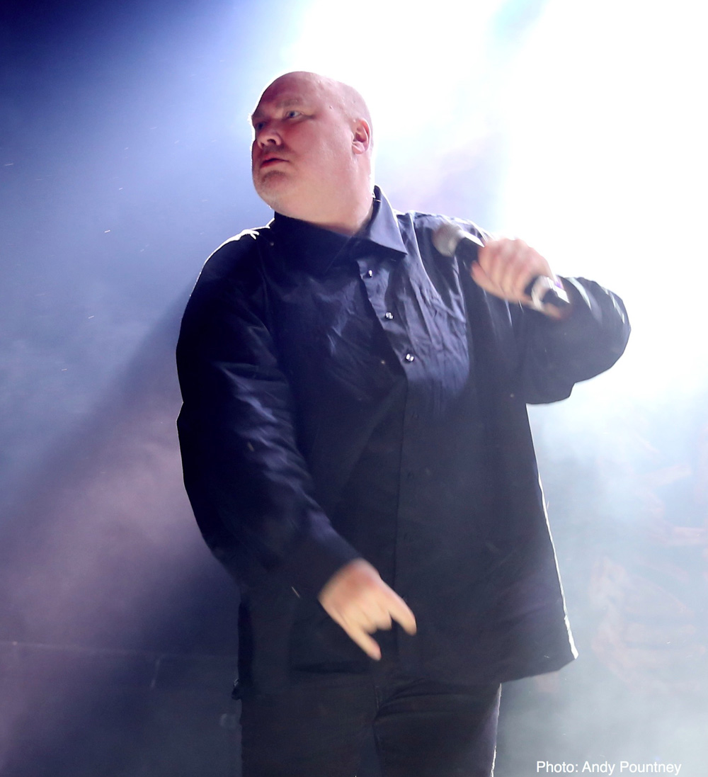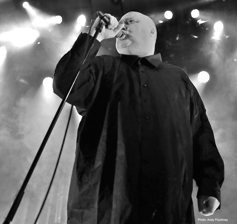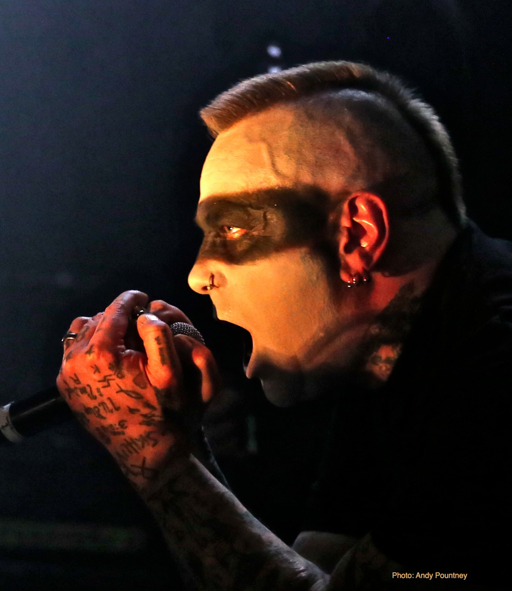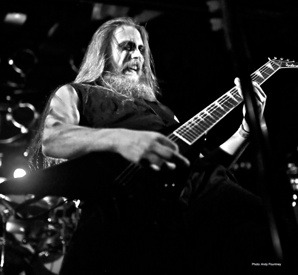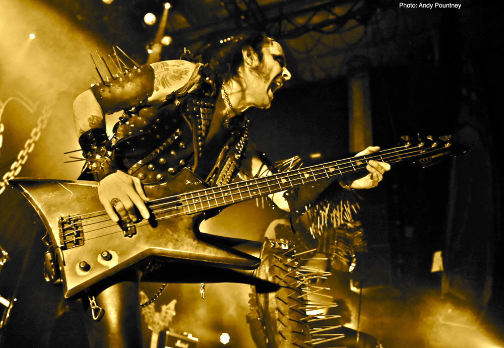 On arrival on the left I overheard the security guy explaining the strategy for the photo pass holders of one song then out but could continually take photos of the band for the whole set which inevitably created some tension in the crowd. This was completely due to having the photographers come back to the same queue and really should have been organised better by having them queue in a different place (stage right I’d suggest) affording easy access to the photo pit instead of constantly having to jostle past people much to theirs, mine and others in the crowds annoyance as we watched the band.  Not really an anniversary show as such since the release of the “Pure Fucking Armageddon” demo in 1986 this was indeed to be a special show involving members from various eras of the bands infamous history. The darkening of the stage led into a spoken vocal piece of the first part of “A Bloodsword And A Colder Sun (Part I of II)”as a slow drum beat filtered through the PA with bright searching spotlights passing over the crowd before launching rather pedestrian like into “A Bloodsword And A Colder Sun (Part II of II)” with Maniac on vocals. The slow pulsing pace of the tune felt like an intro piece as my gaze wandered away from the band to the rancid stage effects utilising the dismembered carcasses of what I suspect were pigs. There was a rumour that 400kg of bones and I suspect animal body parts were to be included in the set which disgusted me completely and if I’d not been reviewing I’d have walked out. Biased or not I thought Maniac looked like a pantomime villain with his strip of hair in the middle and Batman and Robin like eye makeup as the band went into “Crystallized Pain In Deconstruction” and he stalked the stage as menacingly as he could to decent effect.  The first portion of the show was given to Maniac as the band shifted into “To Daimonium” and “View From Nihil”.