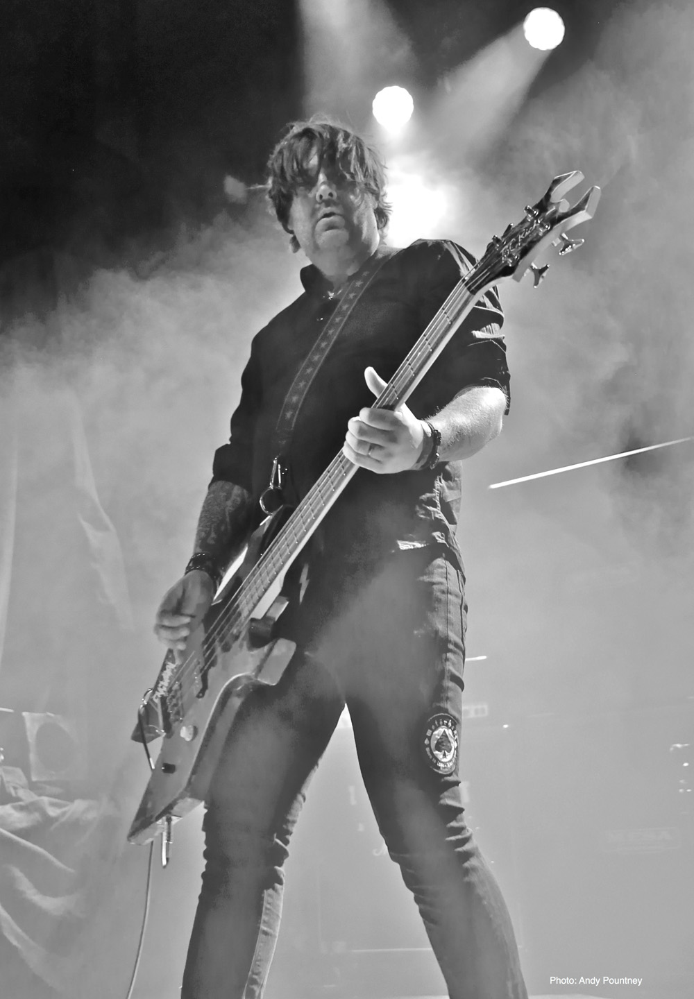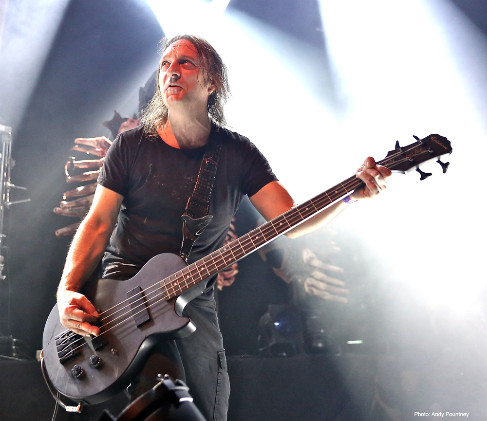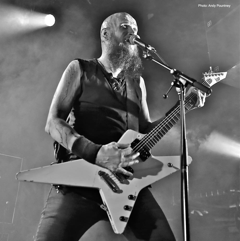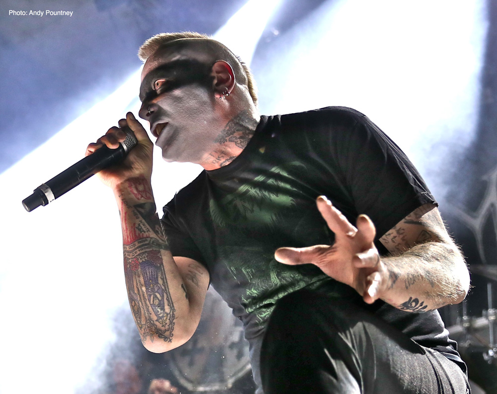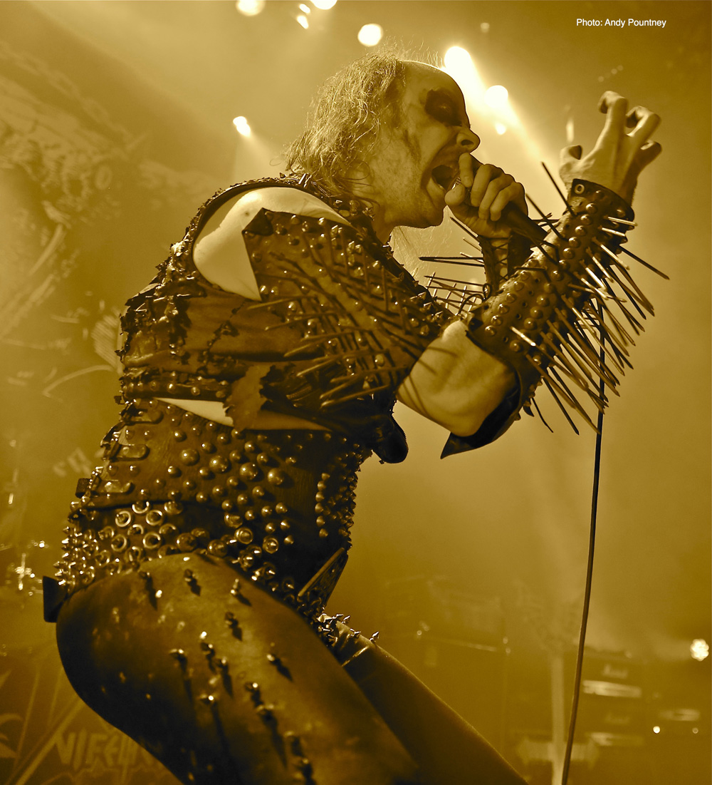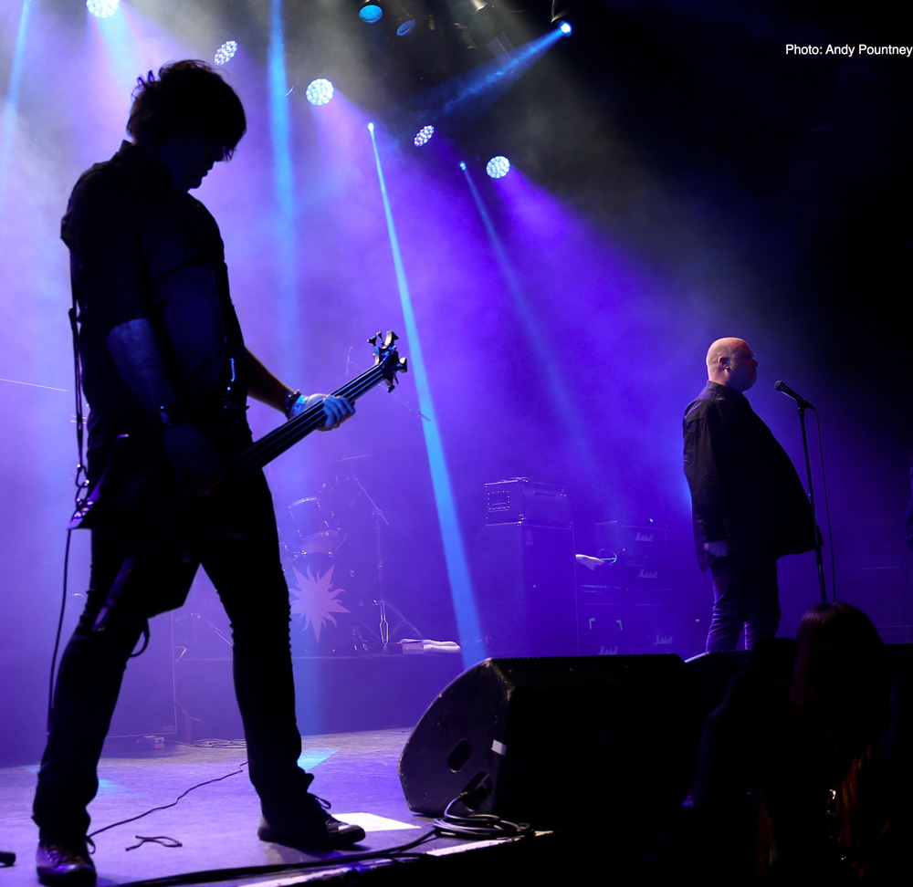 On arrival on the left I overheard the security guy explaining the strategy for the photo pass holders of one song then out but could continually take photos of the band for the whole set which inevitably created some tension in the crowd. This was completely due to having the photographers come back to the same queue and really should have been organised better by having them queue in a different place (stage right I’d suggest) affording easy access to the photo pit instead of constantly having to jostle past people much to theirs, mine and others in the crowds annoyance as we watched the band.  Not really an anniversary show as such since the release of the “Pure Fucking Armageddon” demo in 1986 this was indeed to be a special show involving members from various eras of the bands infamous history. The darkening of the stage led into a spoken vocal piece of the first part of “A Bloodsword And A Colder Sun (Part I of II)”as a slow drum beat filtered through the PA with bright searching spotlights passing over the crowd before launching rather pedestrian like into “A Bloodsword And A Colder Sun (Part II of II)” with Maniac on vocals. The slow pulsing pace of the tune felt like an intro piece as my gaze wandered away from the band to the rancid stage effects utilising the dismembered carcasses of what I suspect were pigs. There was a rumour that 400kg of bones and I suspect animal body parts were to be included in the set which disgusted me completely and if I’d not been reviewing I’d have walked out. Biased or not I thought Maniac looked like a pantomime villain with his strip of hair in the middle and Batman and Robin like eye makeup as the band went into “Crystallized Pain In Deconstruction” and he stalked the stage as menacingly as he could to decent effect.  The first portion of the show was given to Maniac as the band shifted into “To Daimonium” and “View From Nihil”.