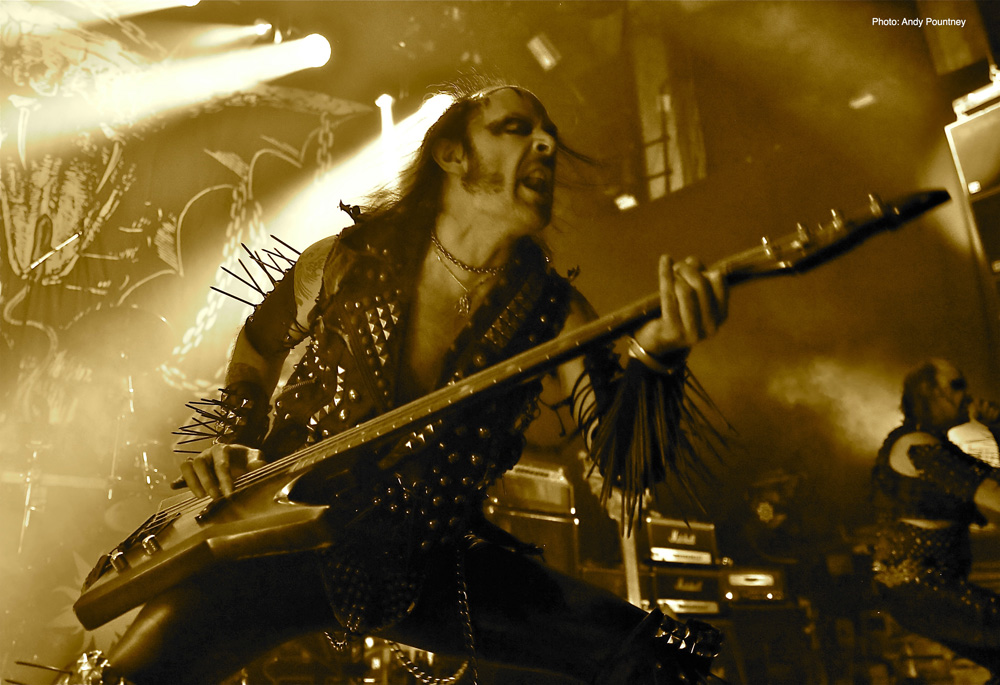 Hammering the main stage next was Nifelheim the self parodying blackened thrash act from Sweden who seem to have gained cult status since their self titled release from over two decades ago. The band doesn’t play often as this was only my second time seeing them after witnessing them destroy Party San Open Air in 2006. As the band arrived on stage decked out with a couple inverted crosses, a small coffin and serpentine back drop they looked like they’d been in a car crash with Rob Halfords costume trailer. Decked out in studs, spikes, arm bands etc with more nails than a D.I.Y. store they looked like human porcupines but cool with it. Nifelheim are as subtle as a medieval spiked mace smashed into your nether regions as they tore up the stage with every conceivable metal posing cliché you could imagine with synchro axe moves the moment they started with “Sacrifice To The Lord Of Darkness” that was quickly followed by “Black Evil”. The sound for their show was another matter unfortunately as a lot of the riffing was rendered defunct by the overwhelming drum sound which was great to hear such clarity but made the guitar sound like it was being asphyxiated under them. “Satanic Sacrifice” gets a prize for the worst twin guitar lead of the weekend which I expected and its difficult to decipher whether they did that on purpose or not such is the theatrics of the band. I was very pleased to hear the opening riff to “Sodomizer” from the debut album as the band members ran around on stage pulling various faces with mouths wide open and using their guitars as guns as “Storm Of The Reaper” was aired next. The song was massively Bathory inspired as you’d expect as the guys headbanged in unison momentarily, then posed for a while before they dashed off to another part of the stage and did the headbang, pose, dash… repeat formula. There was little in the way of stage banter with the crowd as preferring to thrust their slimy groins at us instead through various poses as I took my leave after they played “The Final Slaughter” though I wished I’d stayed instead of going downstairs to see the next band on the John Dee stage in retrospect.