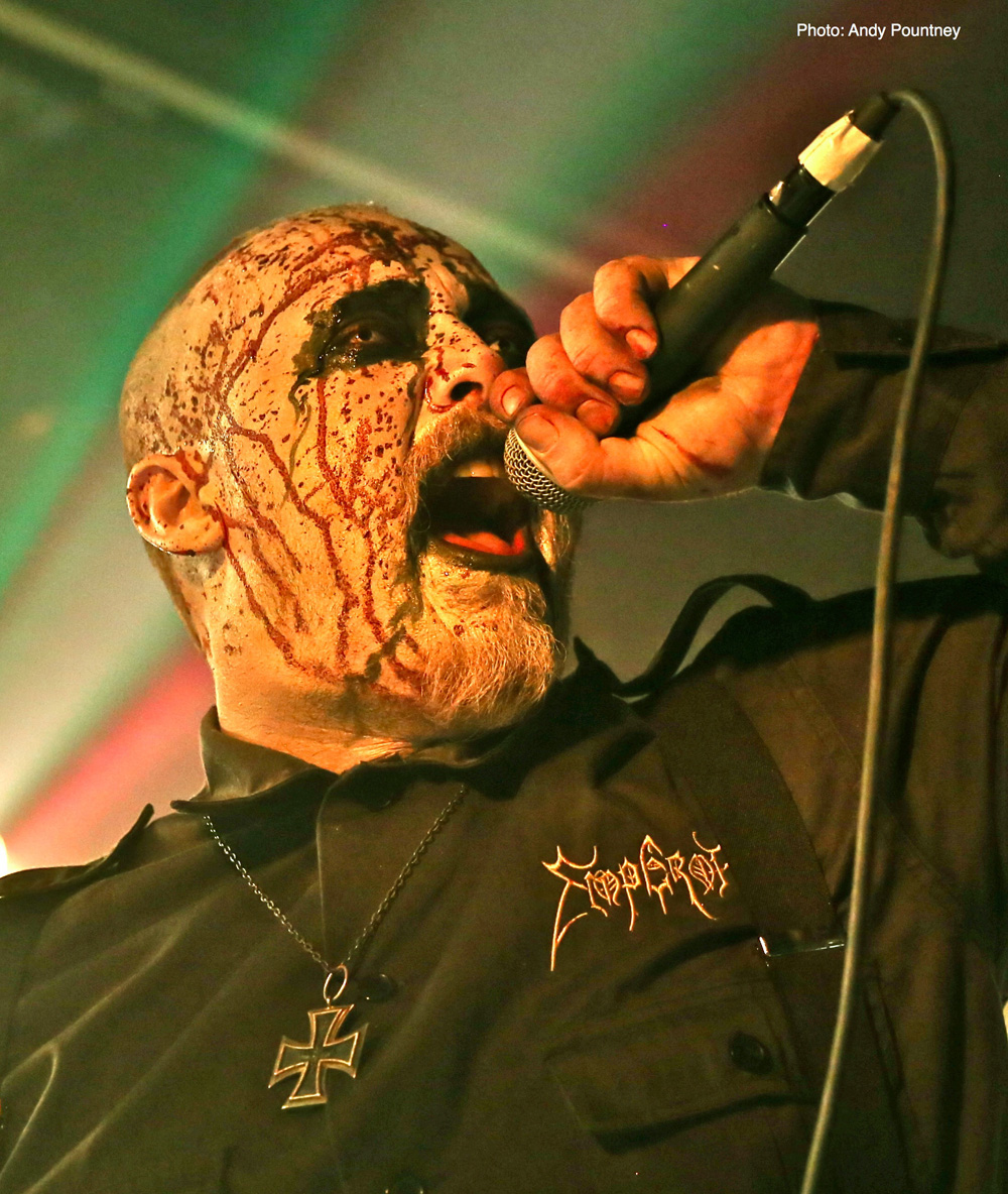 As the “Grand Declaration Of War” tunes terminated the next phase of the show followed to honour the landmark release of “De Mysteriis Dom Sathanas” which is held in reverence by virtually all black metal fans as the unholy grail of black metal as Attila replaced Maniac using his skull clad microphone with which he cavorted at every opportunity, as the title track catalysed this next phase of tunes after a spooky intro of various noises and howling. Attila honoured the album brilliantly if a little too theatrically for my liking with torturous vocals and a ghoulish appearance though I did think he looked like Beetlejuice from where I was stood. “Life Eternal” followed and created a hauntingly slower atmosphere that surprised me as to its inclusion over iconic tracks like “Funeral Fog” and “Pagan Fears”; the crowd loved every second of it however. Standing centre stage Attila stood with arms wide receiving the unholy Inferno bestial communion via the work of the other guys which included Necrobutcher and Hellhammer as the other guys mostly recognised as founders of the band even if they didn’t. Attila shook his head during the build up of the tune before the devastating riff rocketed the tempo skywards. Continuing with a tune from “Ordo Ad Chao” “Illuminate Eliminate” and followed uneventfully by “Psywar” they more or less created a pause in proceedings readying the set the next section which began with the intro piece of “Silvester Anfang” and saw Maniac back on stage for “Deathcrush” where he brandished the flesh covered skull of a sheep I think during the bass line and pretended to lick it before throwing it into the crowd. Maniac chatted to the crowd about a special guest for the next tune by inviting the bands original drummer Manheim to pick up the sticks for “Chainsaw Gutsfuck” as he baited the crowd to get them chanting gutsfuck after his bellow of chainsaw.  Interestingly the drum kit was so massive it was nigh on impossible to see him or Hellhammer play as another guest was announced in the form of Messiah aka dart player lookalike from Order who sang briefly for Mayhem in 1990 and has a credit on the live album “The Dawn of the Black Hearts” with its infamous cover photo taken by Euronymous after Dead had blown off his own head off with a gun. His contribution was to take us back to 1986 and the demo days by unleashing the dust ridden tones of “Carnage” and of course “Pure Fucking Armageddon” which he did a fine job of as the songs sounded refreshed and revitalised via the cracking PA as whilst Messiah was less animated than Maniac and Attila he delivered the vocals confidently to the seething masses before him. The end of the show was clumsy however as the set abruptly finished and I expected all the retrospective band members to be on stage for a tune or two that didn’t materialise which was a shame and it left a sour taste in the mouth and became a bit of an anti-climax unfortunately.