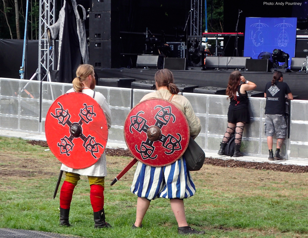 The main stage area wasn’t scheduled to open until 16:00, giving the opportunity to have a walk around the Viking village, hear some Nordic music played on traditional instruments, and to have a go at age-old Viking sports such as axe throwing and archery. There was also the opportunity to join one of the tours of the burial mounds, and learn about Norse History.