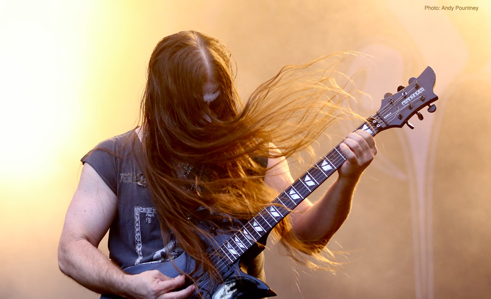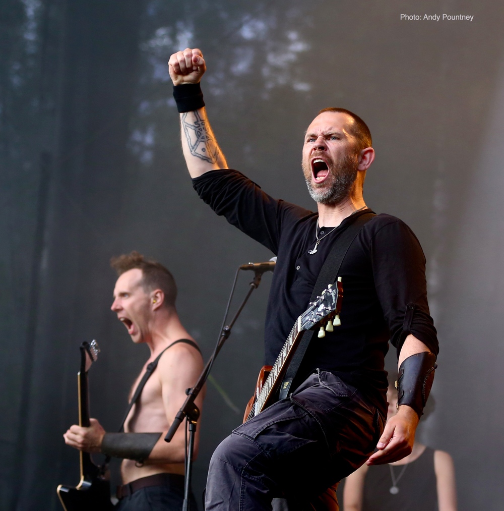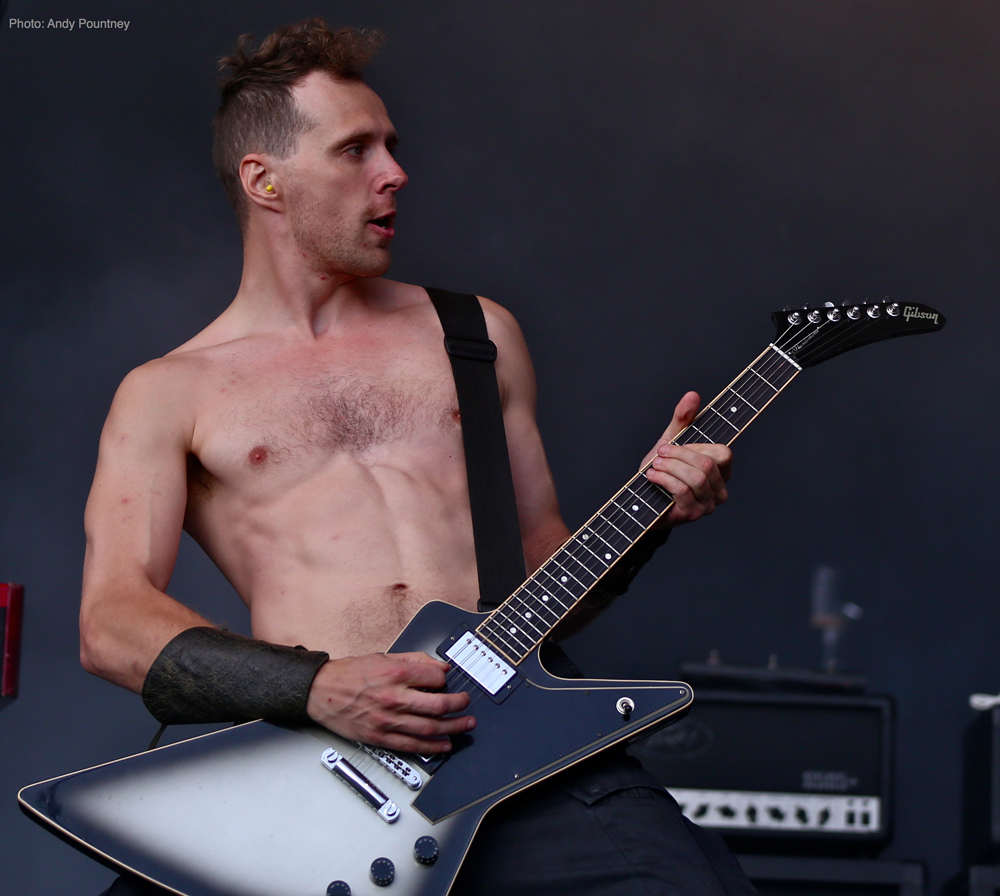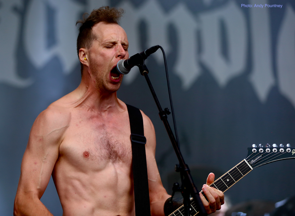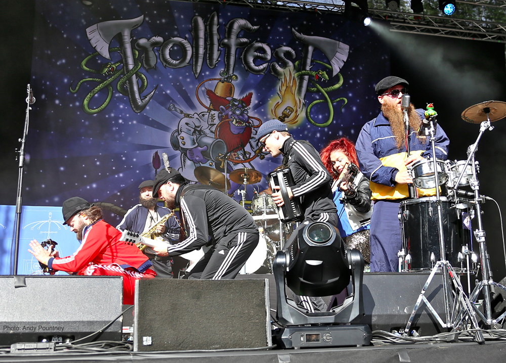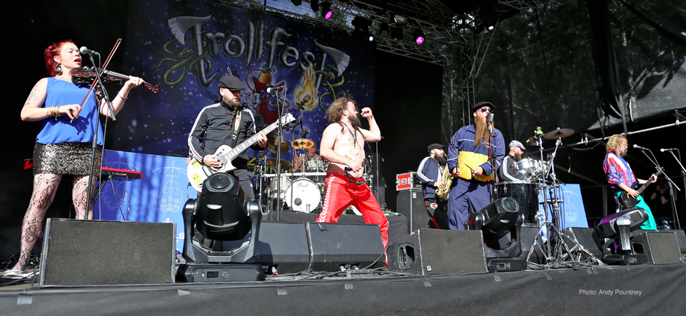 Trollfest were the first main stage band of the festival and they erupted onto the impressive stage looking like an explosion in a shellsuit factory. Their high energy brand of “True Norwegian Balkan Metal” was an entertaining blend of metal and folk, utilising a saxophone, accordion, violin and tambourine alongside more traditional instruments. The nine (I think – It was hard to count them as they were running around so much!) members were a vision of chaotic perpetual motion including members running into the photopit and crowd, but they sounded good, went down well with those down the front and were a good start to proceedings.